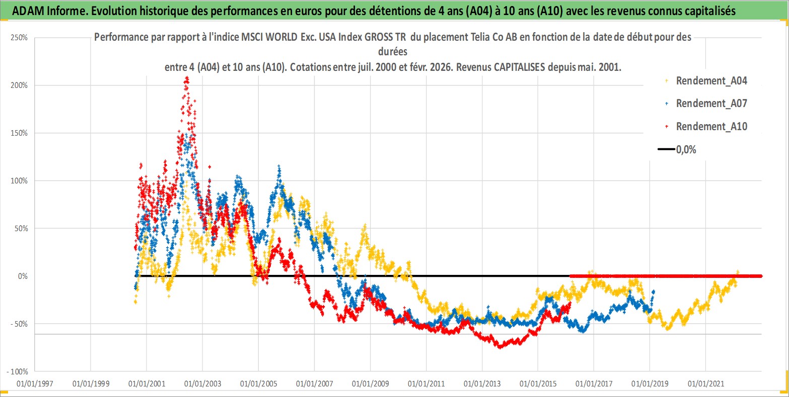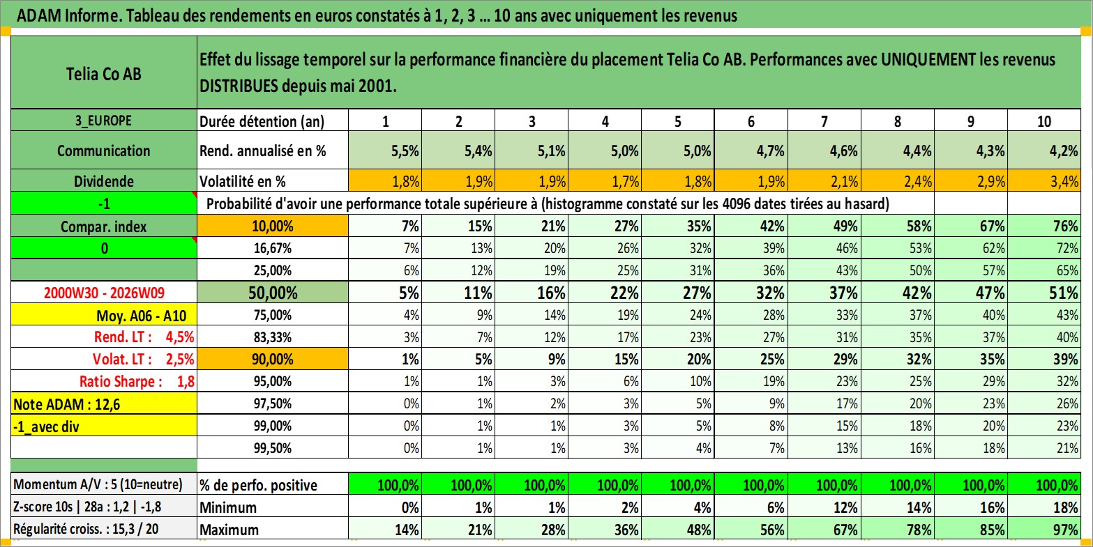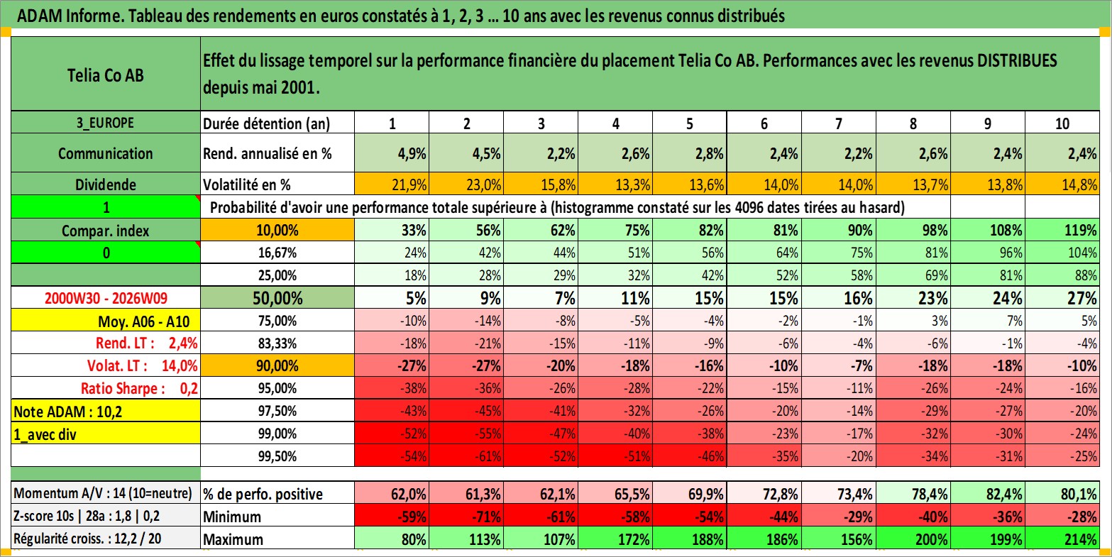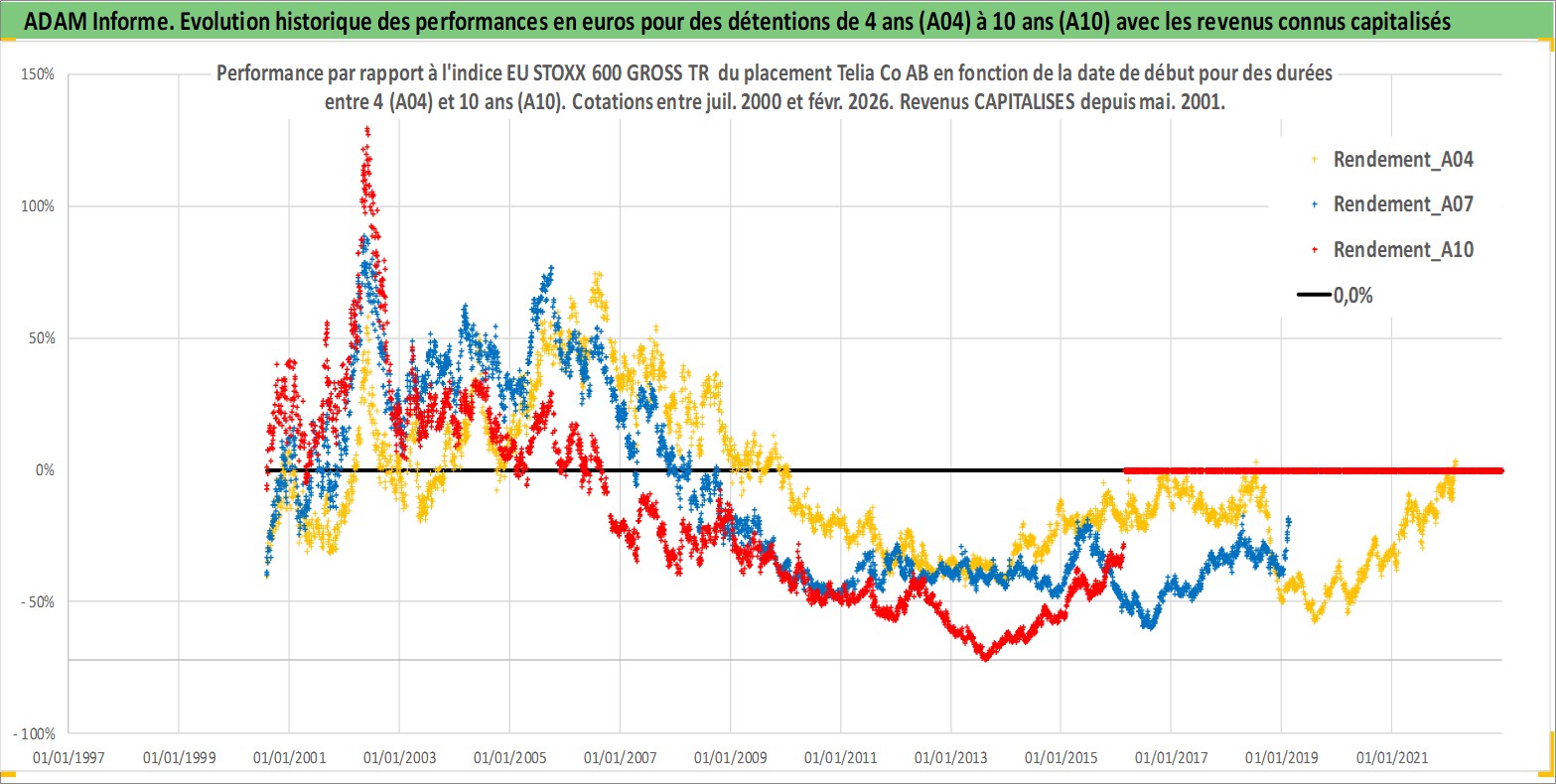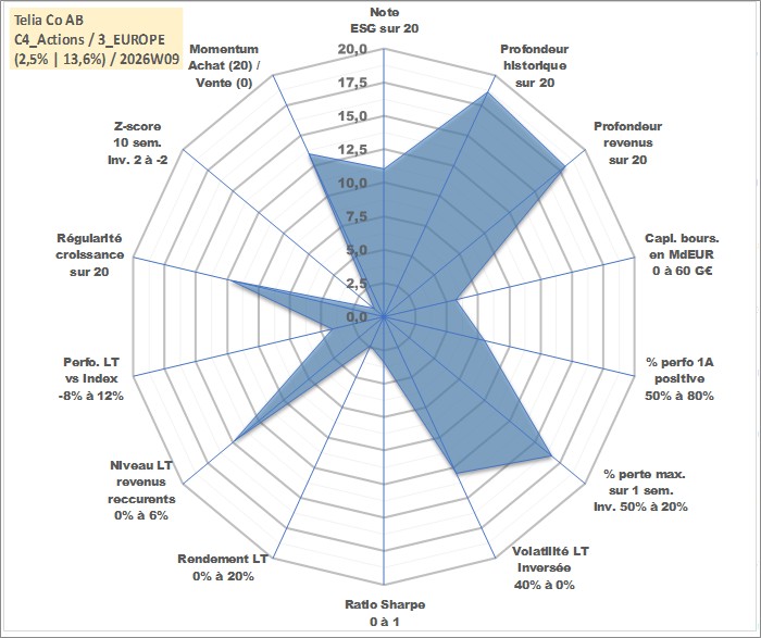 Site dédié aux investisseursPage dédiée sur site financeAnalyse des valorisations hebdomadaires de l'action Telia Co AB. Cet actif est cote en SEK. Les valorisations sont en contrevaleur EURO et couvrent les semaines 2000W30 a 2026W09. Les revenus de cet actif financier sont pris en compte depuis la semaine 2001W19. La note globale ESG de cet actif est estimee a 11.0 (apres rebasage entre 0 et 20).