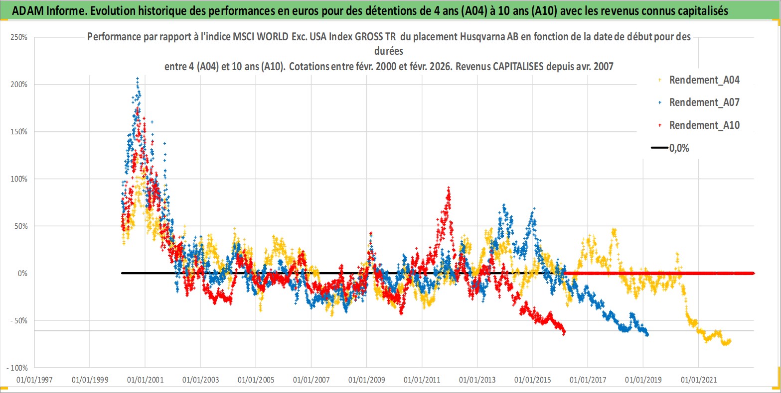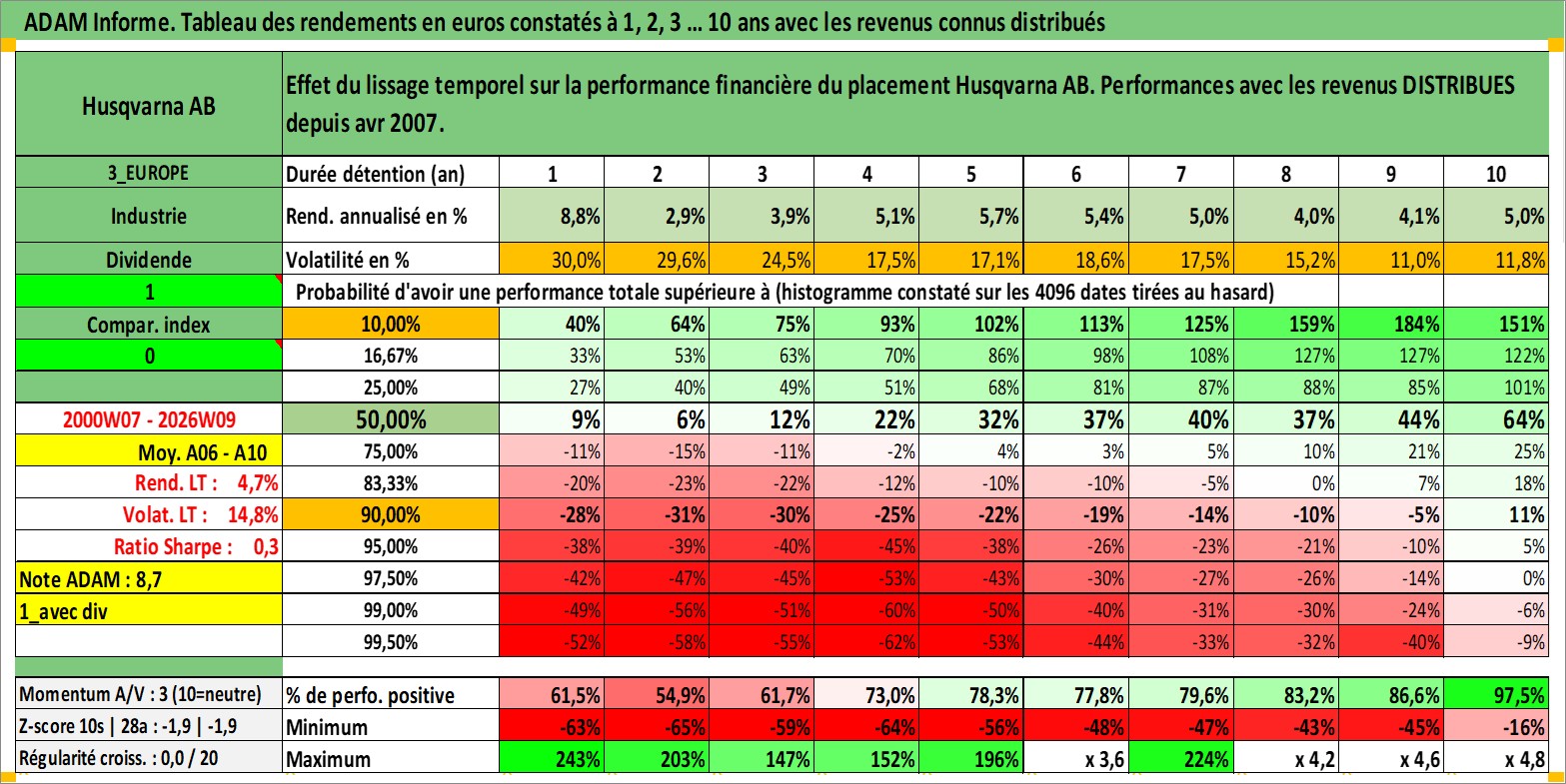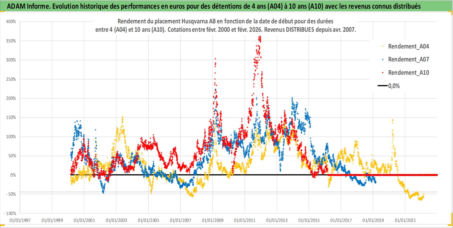 Site dédié aux investisseursPage dédiée sur site financeAnalyse des valorisations hebdomadaires de l'action Husqvarna AB. Cet actif est cote en SEK. Les valorisations sont en contrevaleur EURO et couvrent les semaines 2000W07 a 2026W09. Les revenus de cet actif financier sont pris en compte depuis la semaine 2007W16. La note ESG de cet actif n'est pas connue.