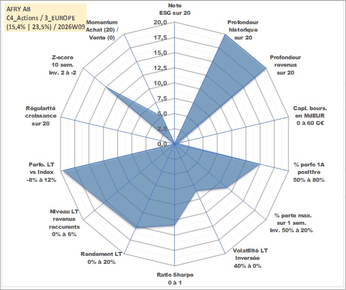 Site dédié aux investisseursPage dédiée sur site financeAnalyse des valorisations hebdomadaires de l'action AFRY AB. Cet actif est cote en SEK. Les valorisations sont en contrevaleur EURO et couvrent les semaines 1997W01 a 2026W09. Les revenus de cet actif financier sont pris en compte depuis la semaine 1997W19. La note ESG de cet actif n'est pas connue.