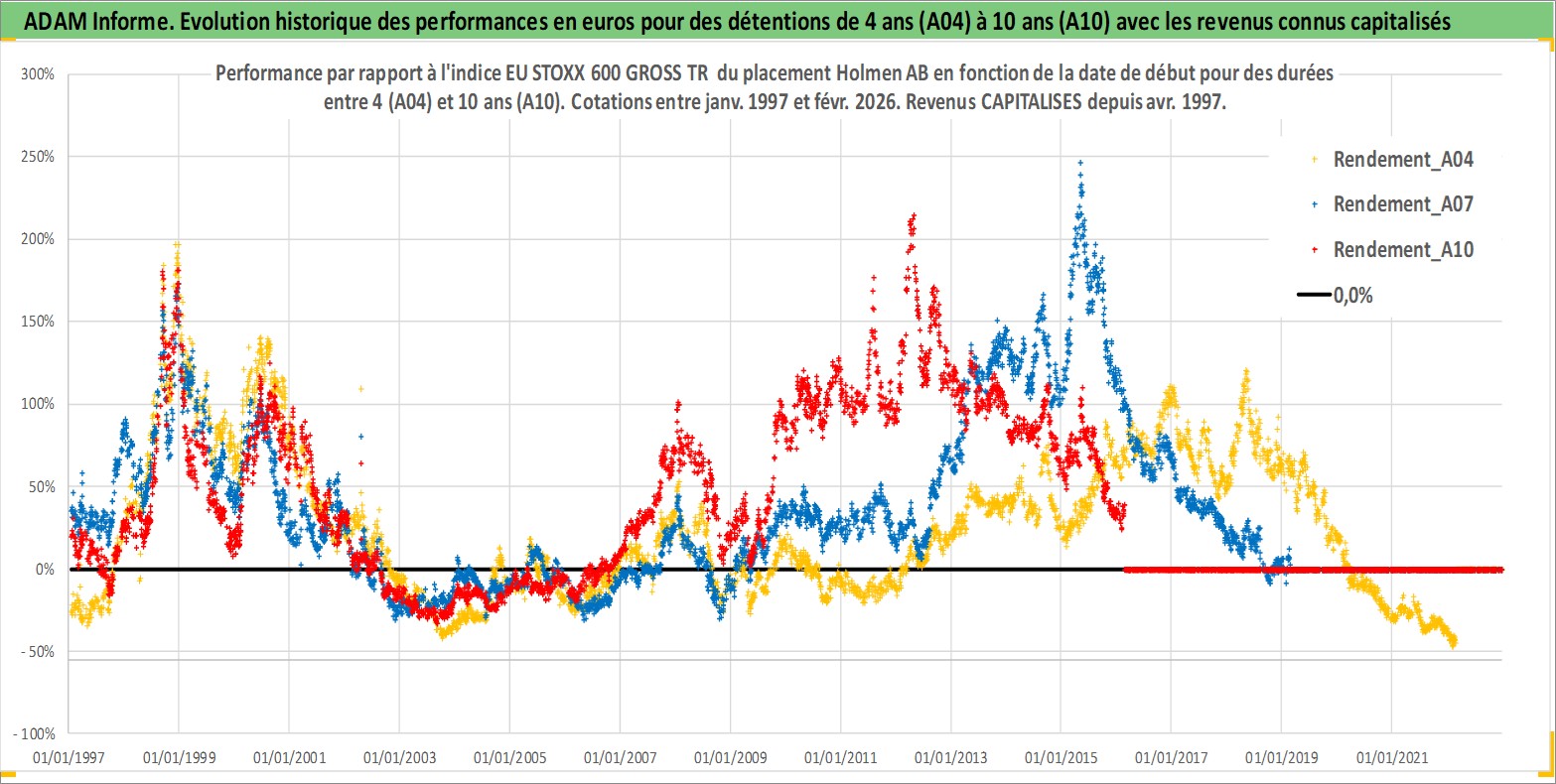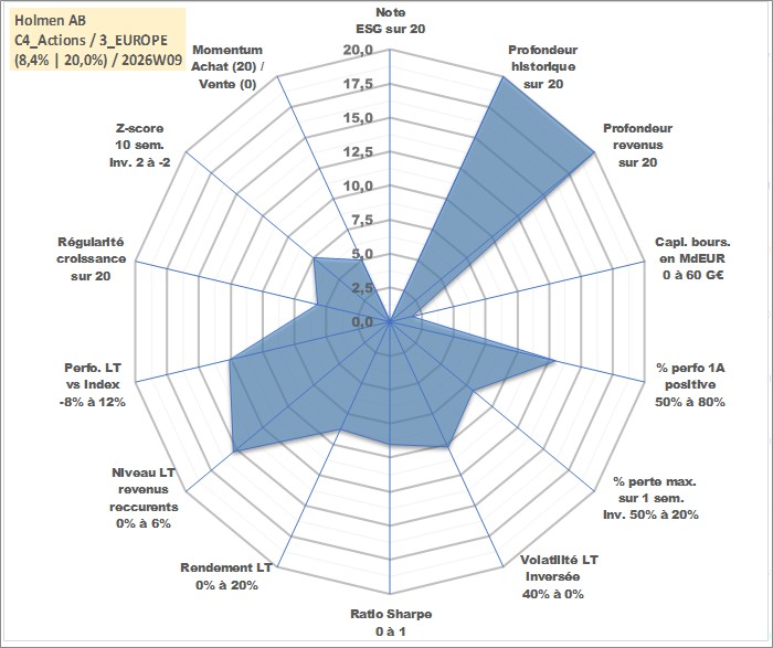 Site dédié aux investisseursPage dédiée sur site financeAnalyse des valorisations hebdomadaires de l'action Holmen AB. Cet actif est cote en SEK. Les valorisations sont en contrevaleur EURO et couvrent les semaines 1997W01 a 2026W09. Les revenus de cet actif financier sont pris en compte depuis la semaine 1997W15. La note ESG de cet actif n'est pas connue.