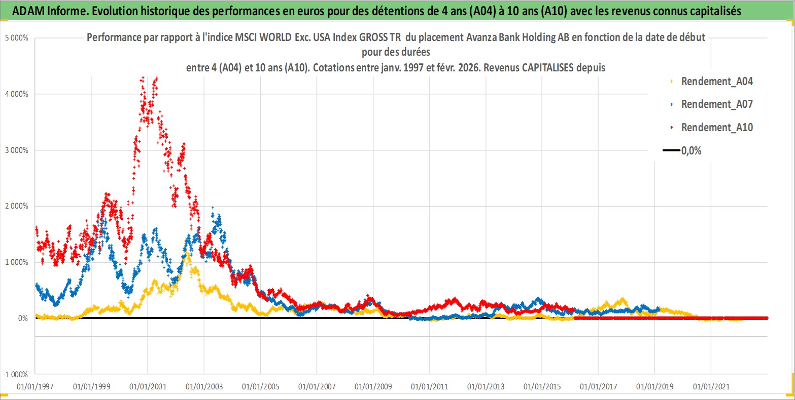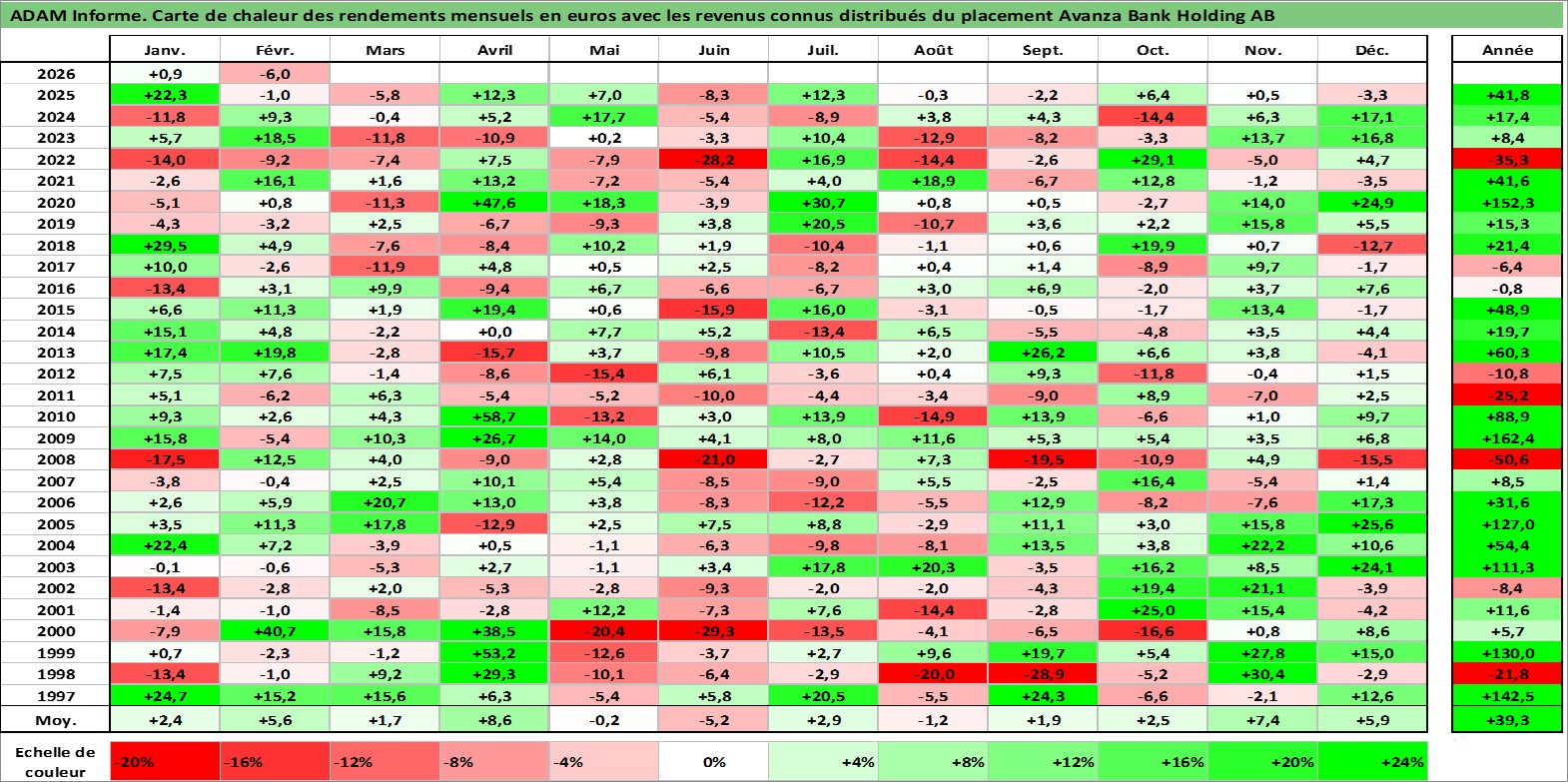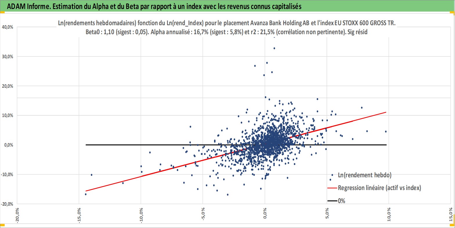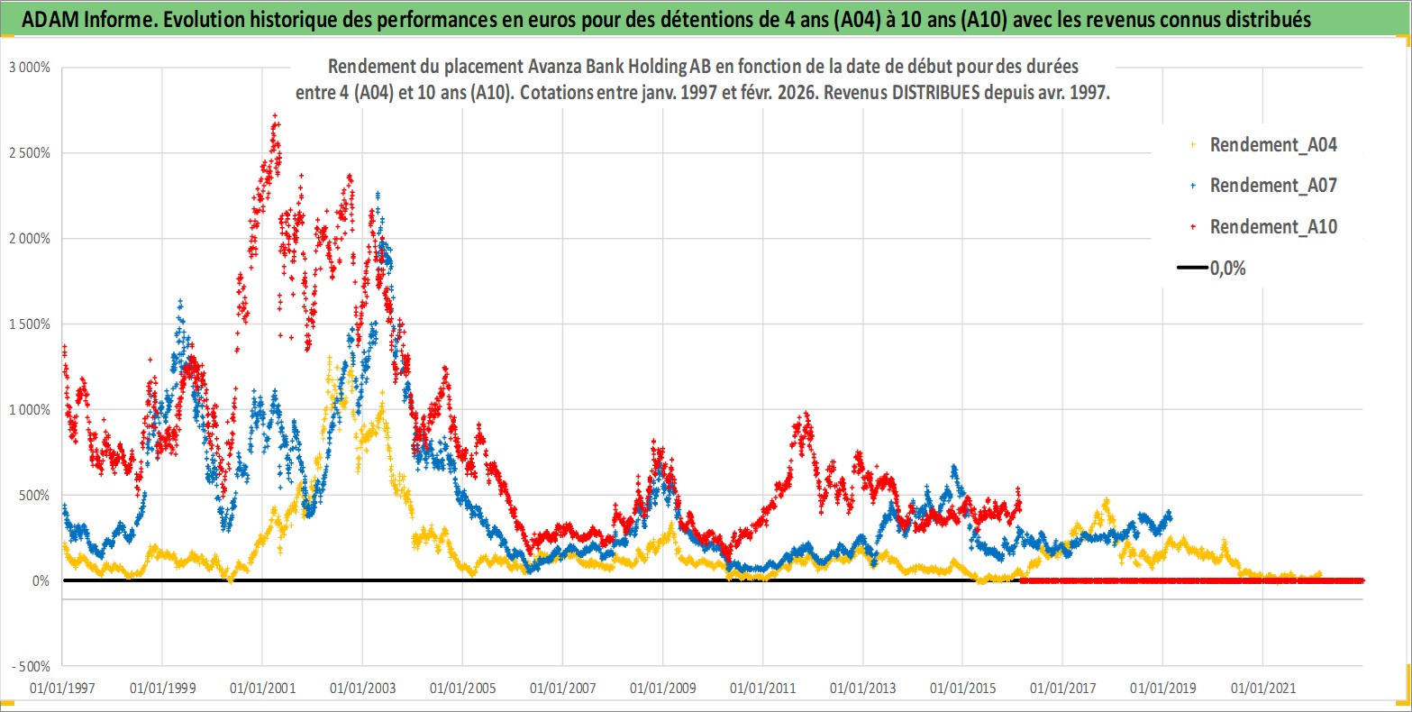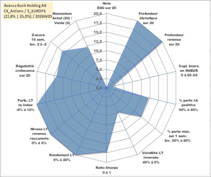Site dédié aux investisseursPage dédiée sur site financeAnalyse des valorisations hebdomadaires de l'action Avanza Bank Holding AB. Cet actif est cote en SEK. Les valorisations sont en contrevaleur EURO et couvrent les semaines 1997W01 a 2026W09. Les revenus de cet actif financier sont pris en compte depuis la semaine 1997W15. La note ESG de cet actif n'est pas connue.