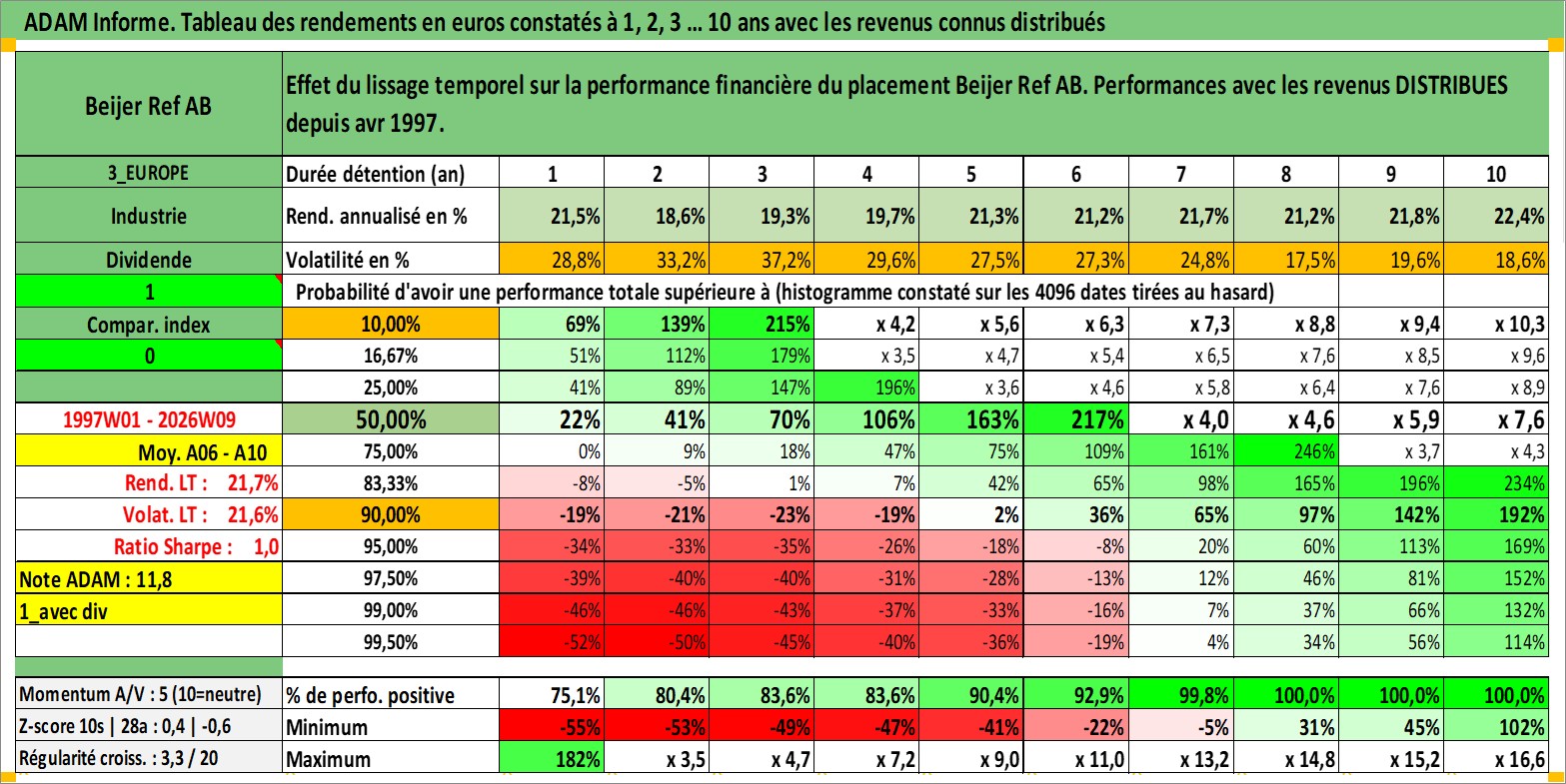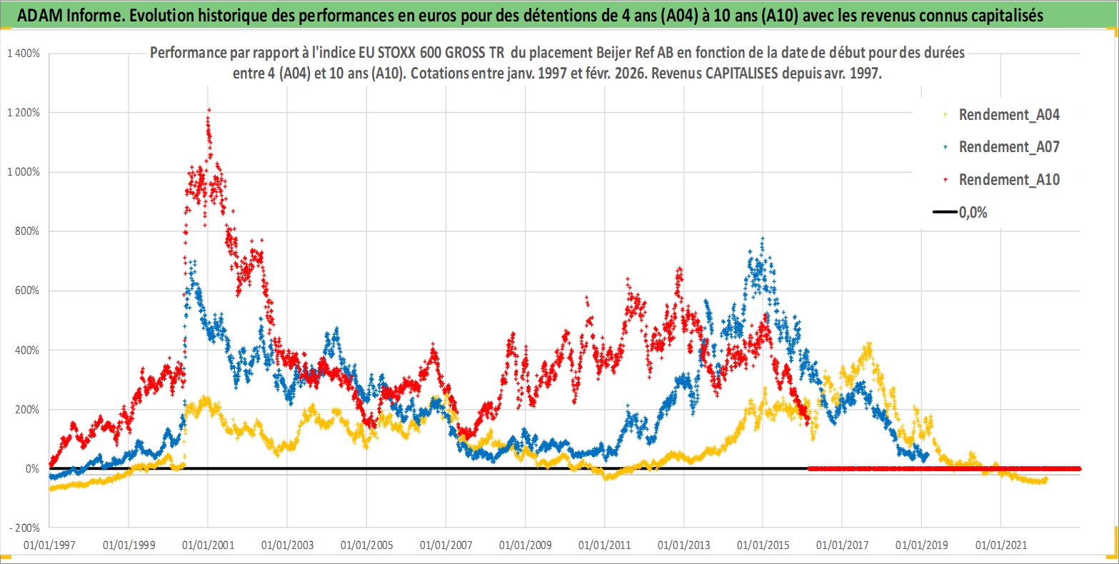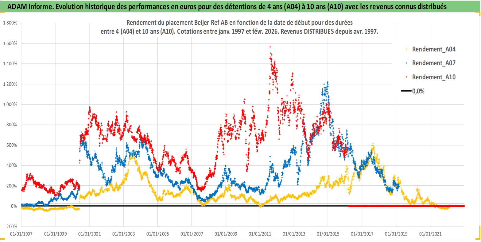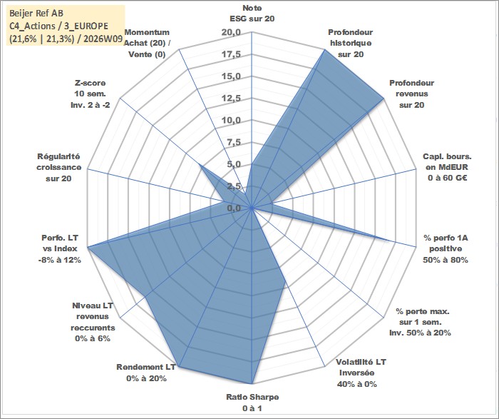 Site dédié aux investisseursPage dédiée sur site financeAnalyse des valorisations hebdomadaires de l'action Beijer Ref AB. Cet actif est cote en SEK. Les valorisations sont en contrevaleur EURO et couvrent les semaines 1997W01 a 2026W09. Les revenus de cet actif financier sont pris en compte depuis la semaine 1997W17. La note globale ESG de cet actif est estimee a 5.0 (apres rebasage entre 0 et 20).