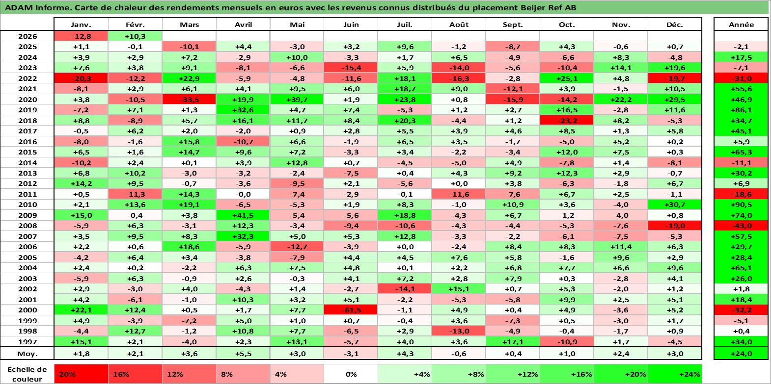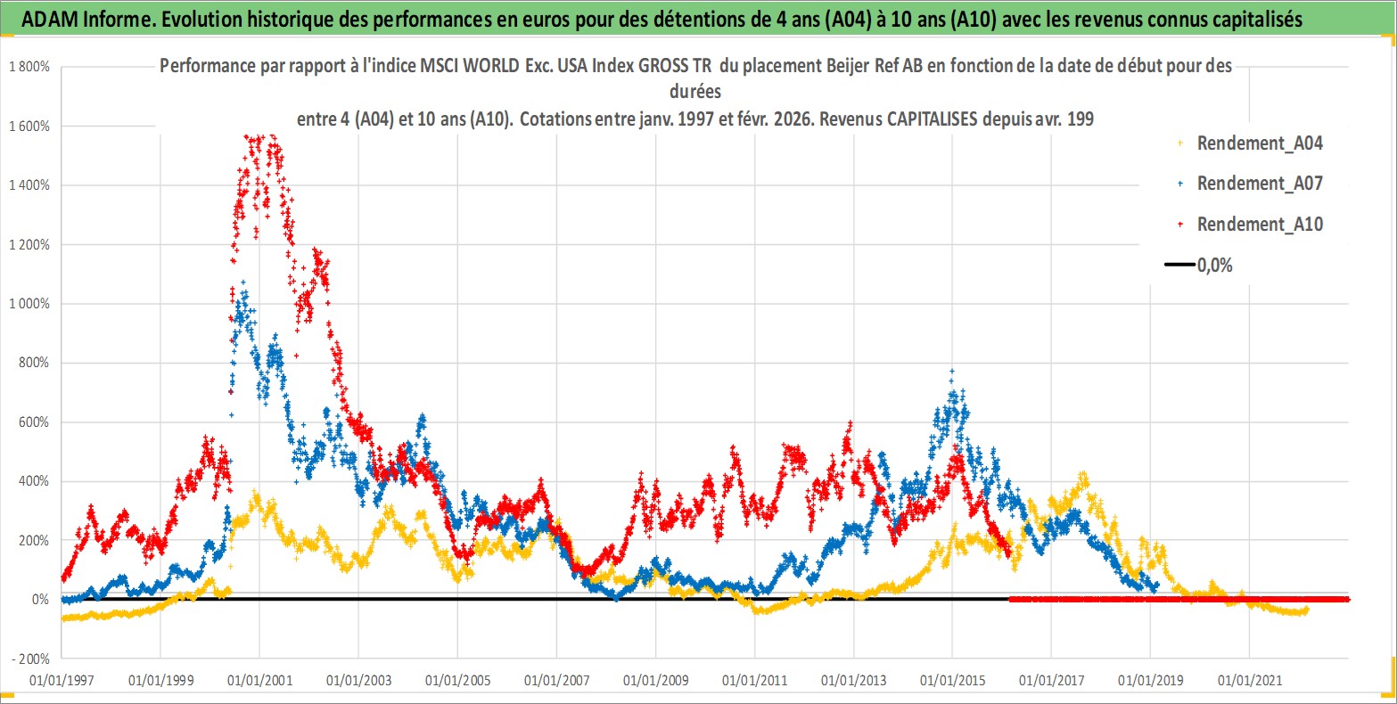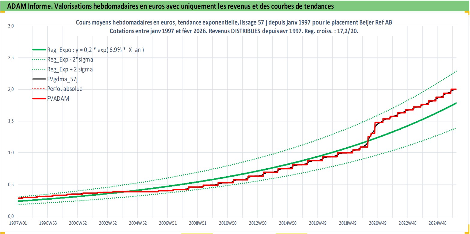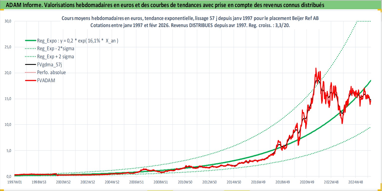 Site dédié aux investisseursPage dédiée sur site financeAnalyse des valorisations hebdomadaires de l'action Beijer Ref AB. Cet actif est cote en SEK. Les valorisations sont en contrevaleur EURO et couvrent les semaines 1997W01 a 2026W09. Les revenus de cet actif financier sont pris en compte depuis la semaine 1997W17. La note globale ESG de cet actif est estimee a 5.0 (apres rebasage entre 0 et 20).