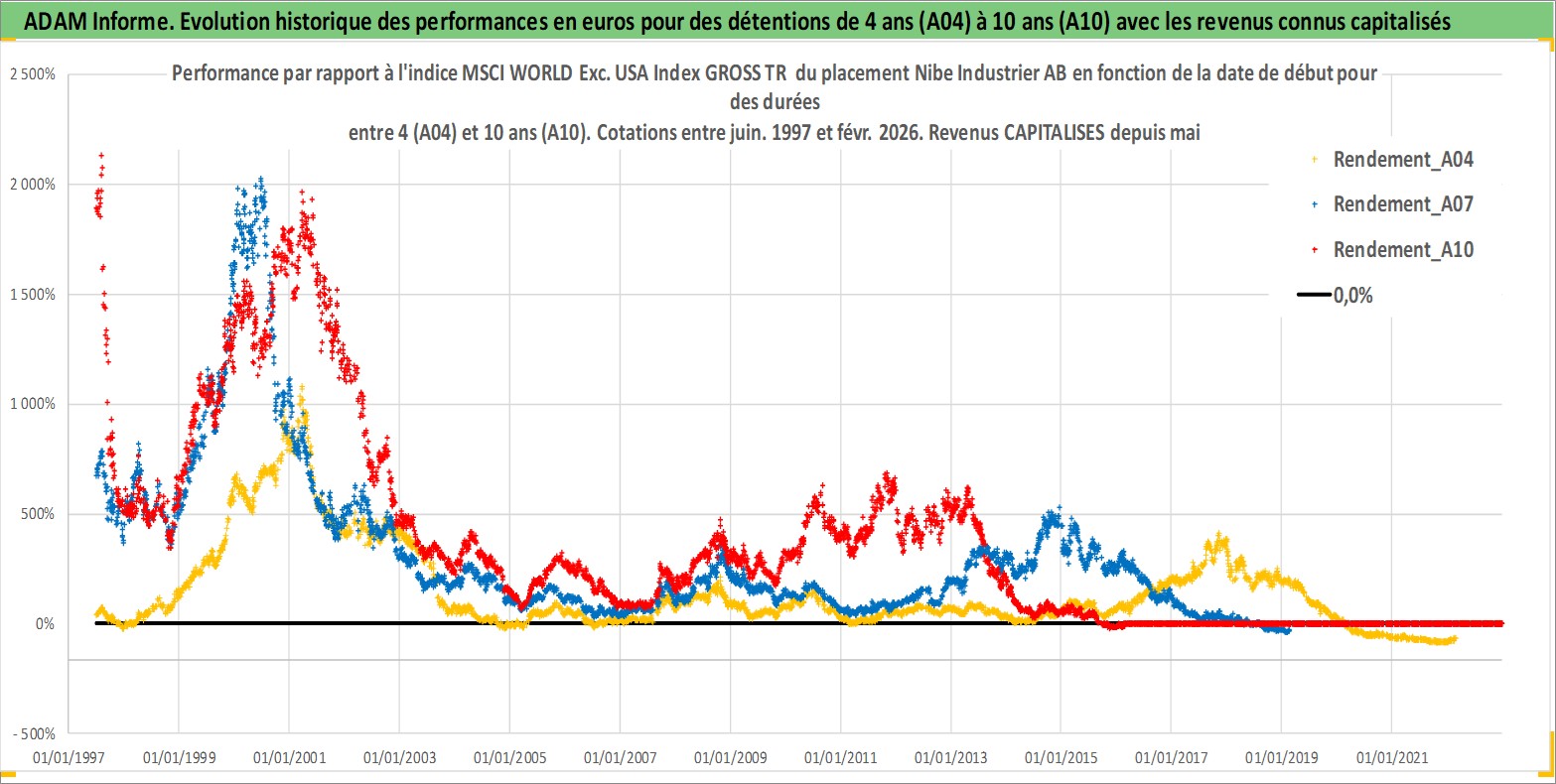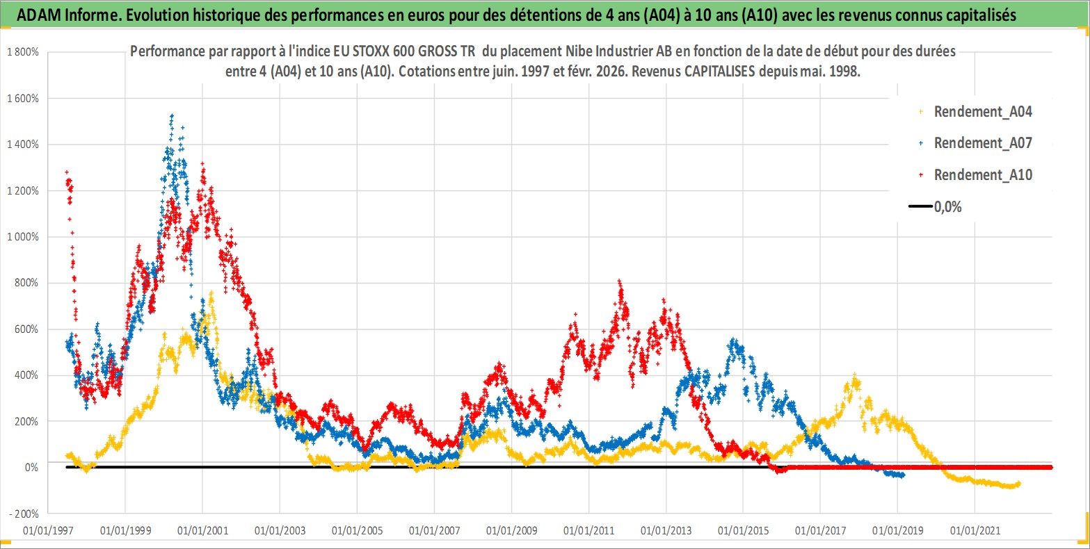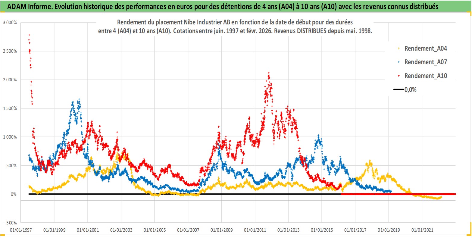 Site dédié aux investisseursPage dédiée sur site financeAnalyse des valorisations hebdomadaires de l'action Nibe Industrier AB. Cet actif est cote en SEK. Les valorisations sont en contrevaleur EURO et couvrent les semaines 1997W25 a 2026W09. Les revenus de cet actif financier sont pris en compte depuis la semaine 1998W19. La note ESG de cet actif n'est pas connue.