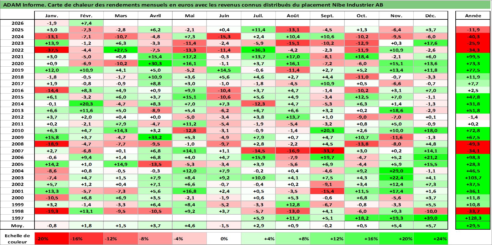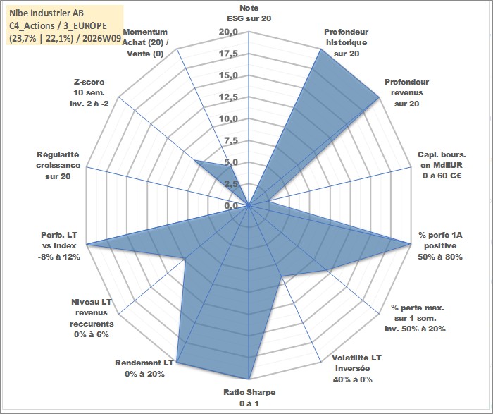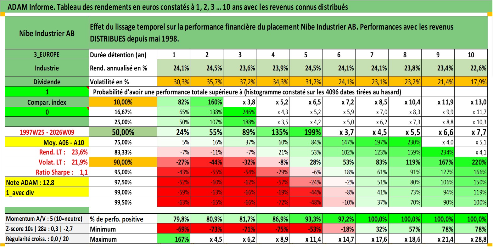 Site dédié aux investisseursPage dédiée sur site financeAnalyse des valorisations hebdomadaires de l'action Nibe Industrier AB. Cet actif est cote en SEK. Les valorisations sont en contrevaleur EURO et couvrent les semaines 1997W25 a 2026W09. Les revenus de cet actif financier sont pris en compte depuis la semaine 1998W19. La note ESG de cet actif n'est pas connue.