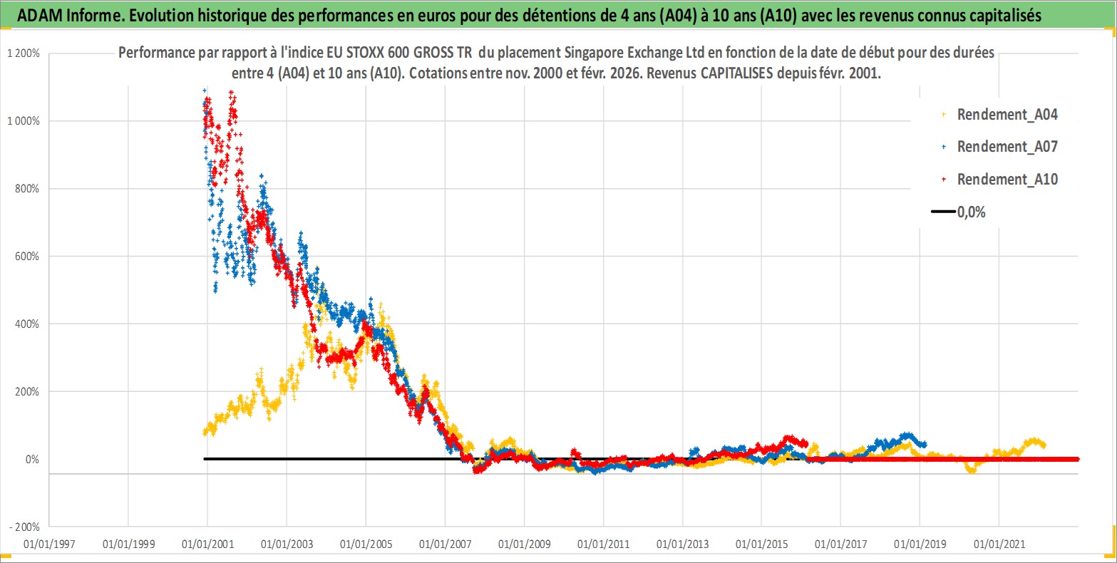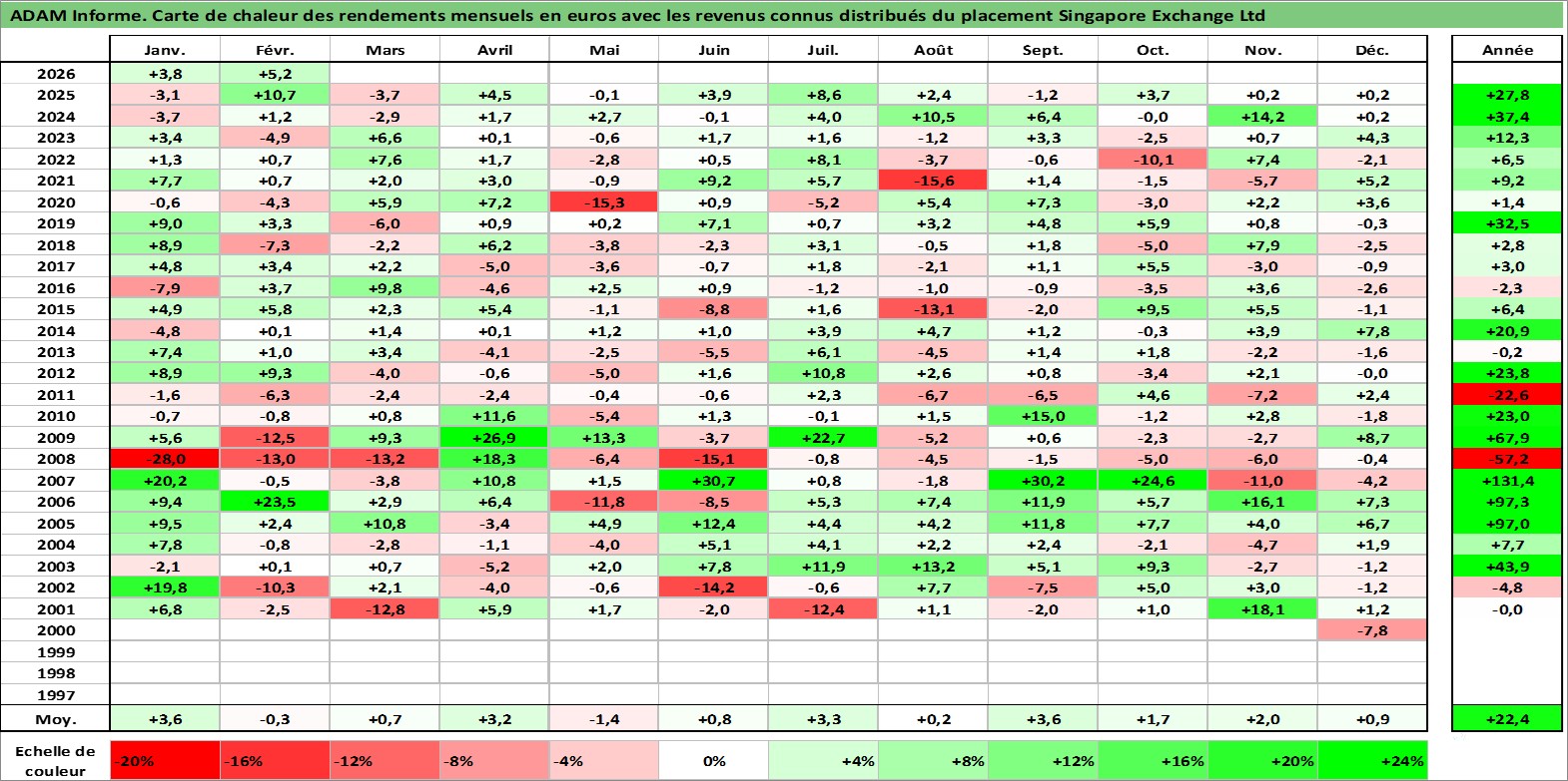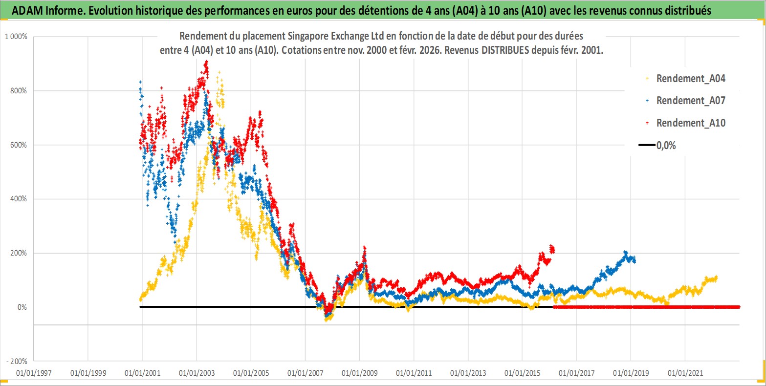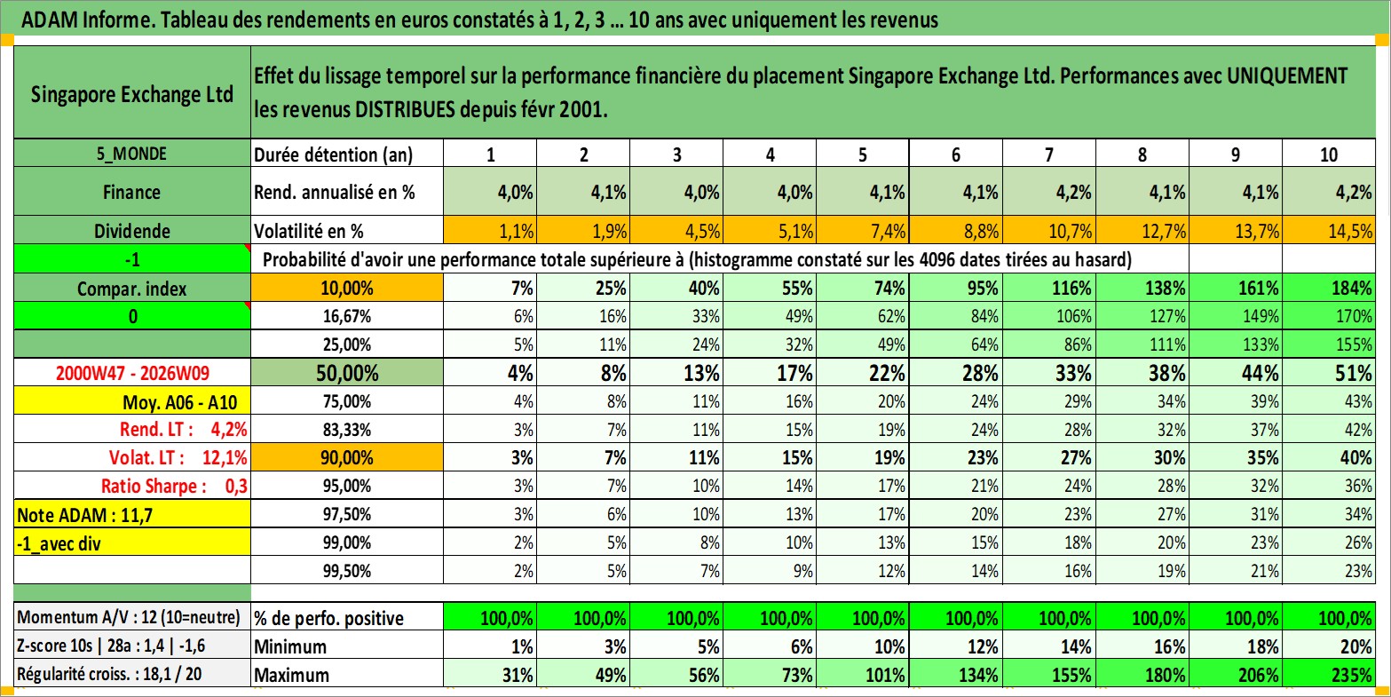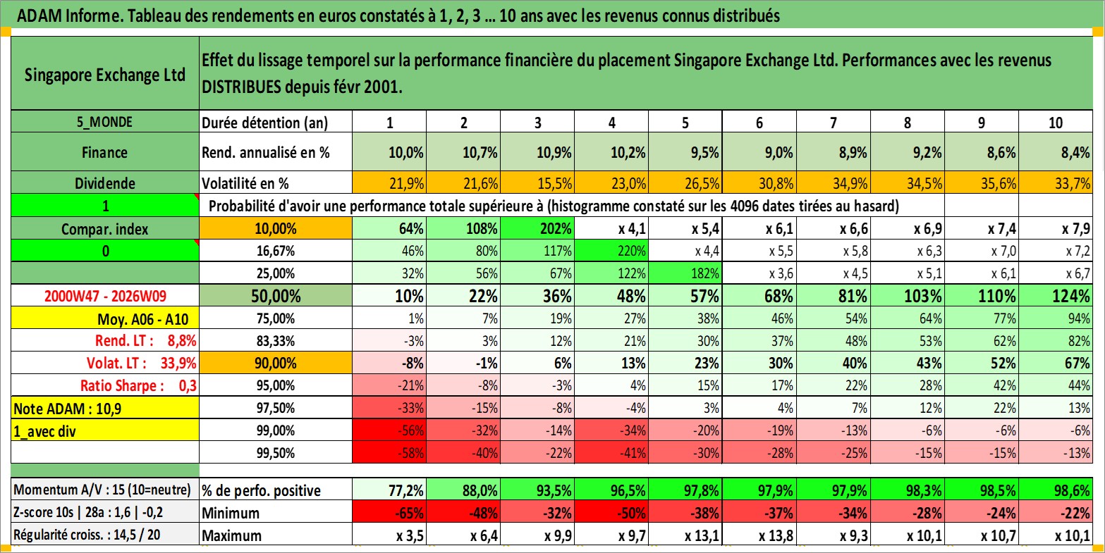 Site dédié aux investisseursPage dédiée sur site financeAnalyse des valorisations hebdomadaires de l'action Singapore Exchange Ltd. Cet actif est cote en SGD. Les valorisations sont en contrevaleur EURO et couvrent les semaines 2000W47 a 2026W09. Les revenus de cet actif financier sont pris en compte depuis la semaine 2001W08. La note globale ESG de cet actif est estimee a 10.0 (apres rebasage entre 0 et 20).