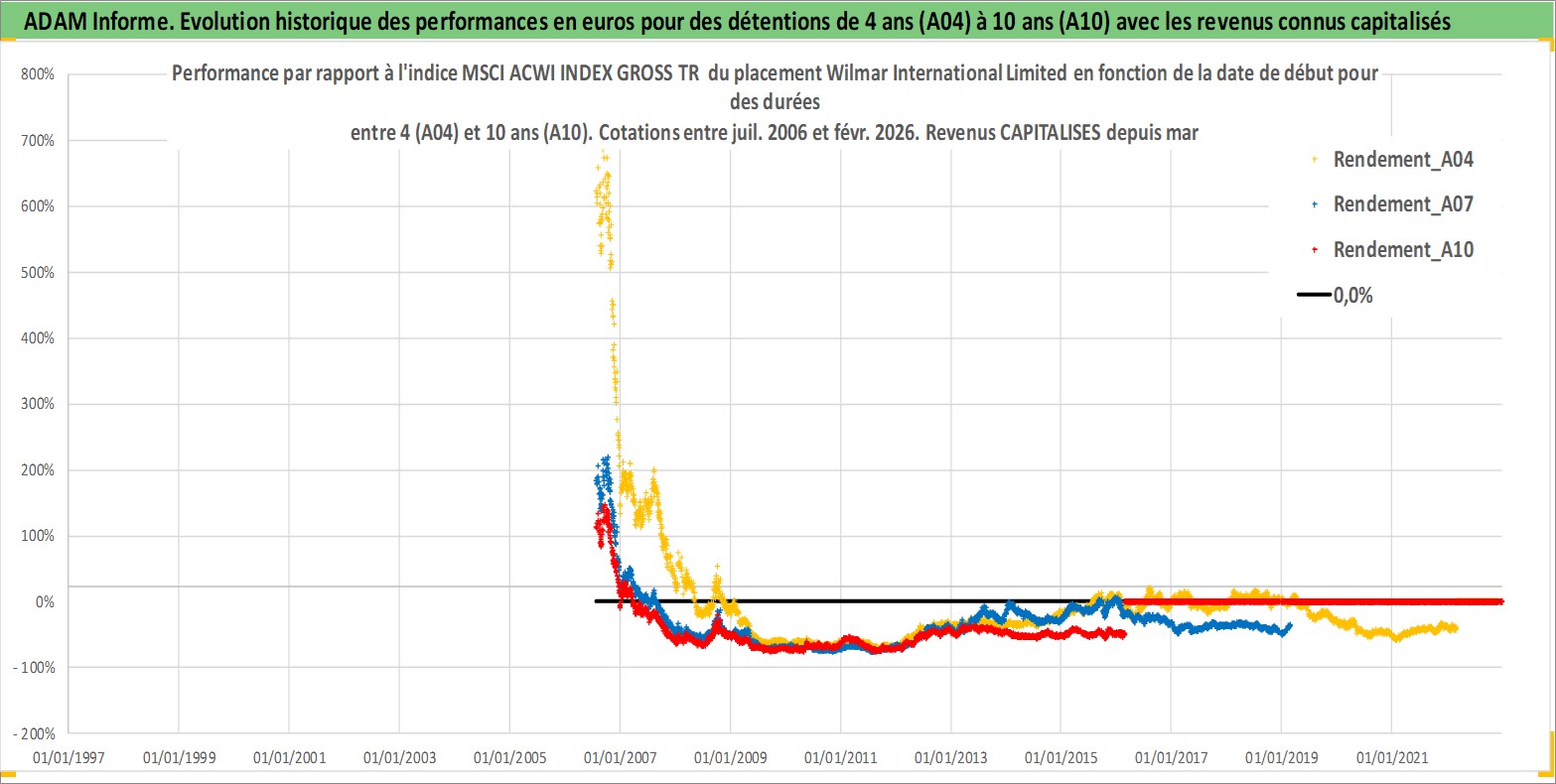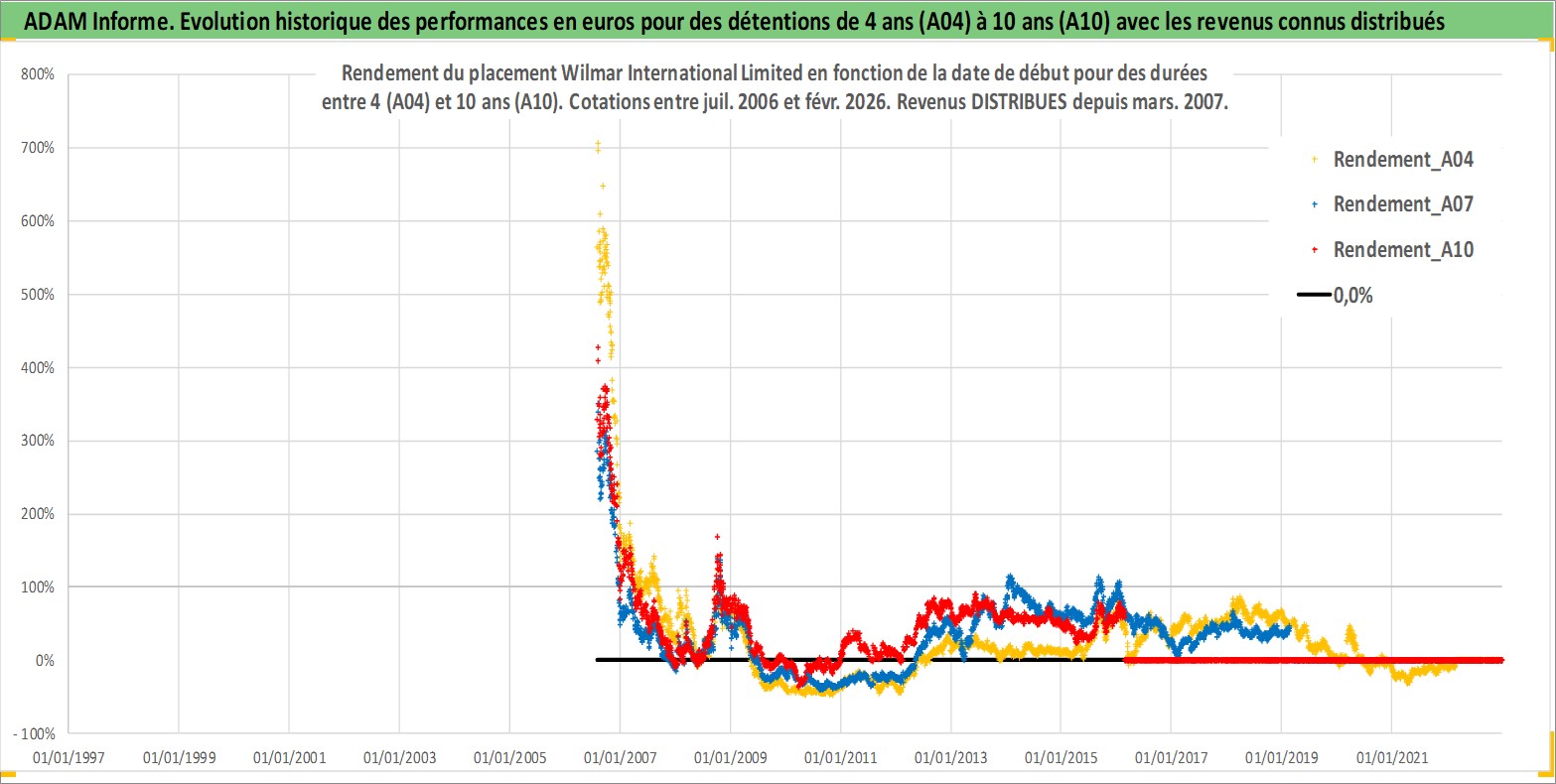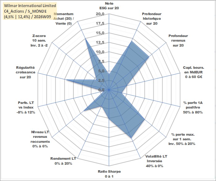 Site dédié aux investisseursPage dédiée sur site financeAnalyse des valorisations hebdomadaires de l'action Wilmar International Limited. Cet actif est cote en SGD. Les valorisations sont en contrevaleur EURO et couvrent les semaines 2006W29 a 2026W09. Les revenus de cet actif financier sont pris en compte depuis la semaine 2007W09. La note globale ESG de cet actif est estimee a 4.0 (apres rebasage entre 0 et 20).