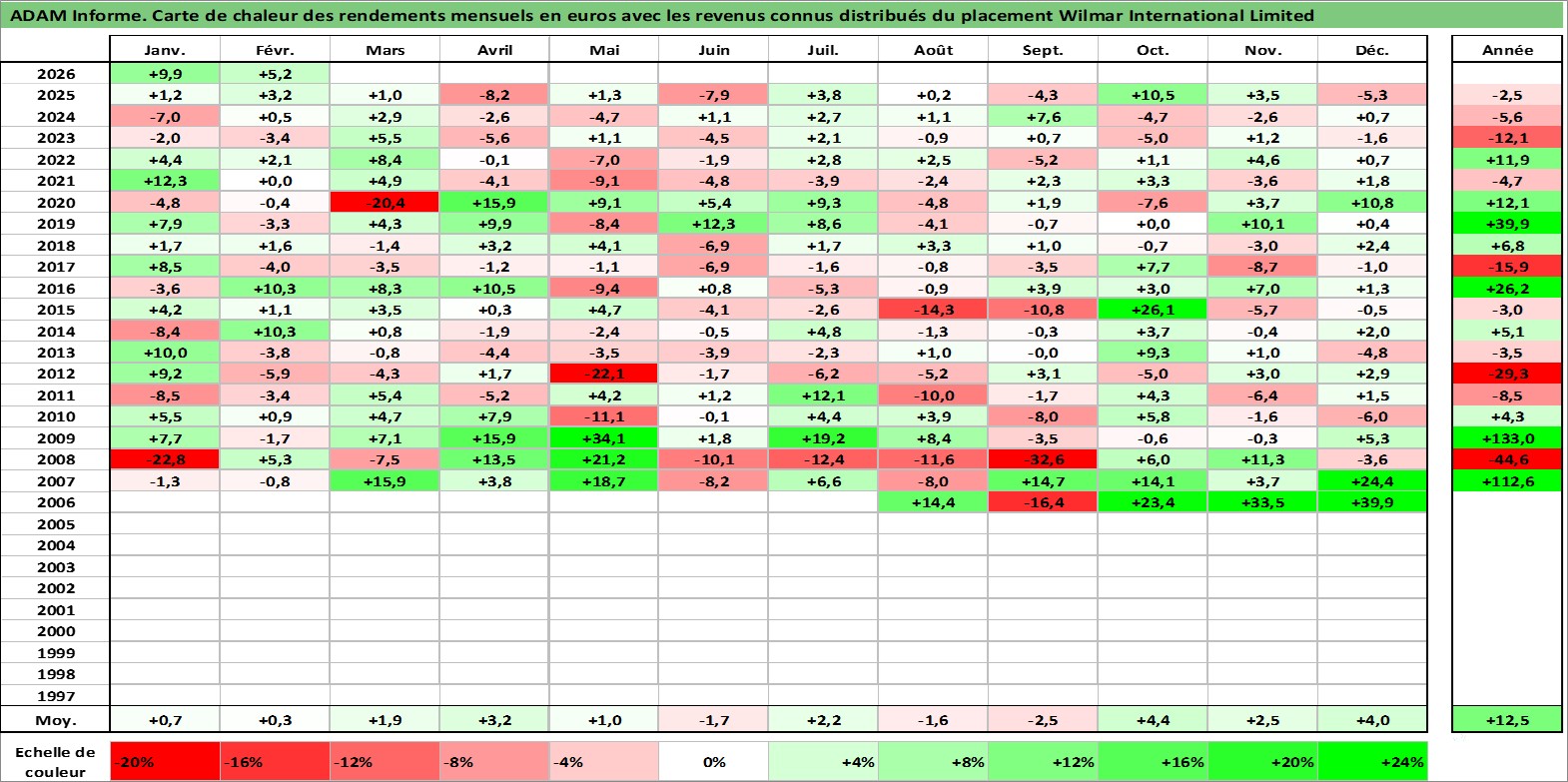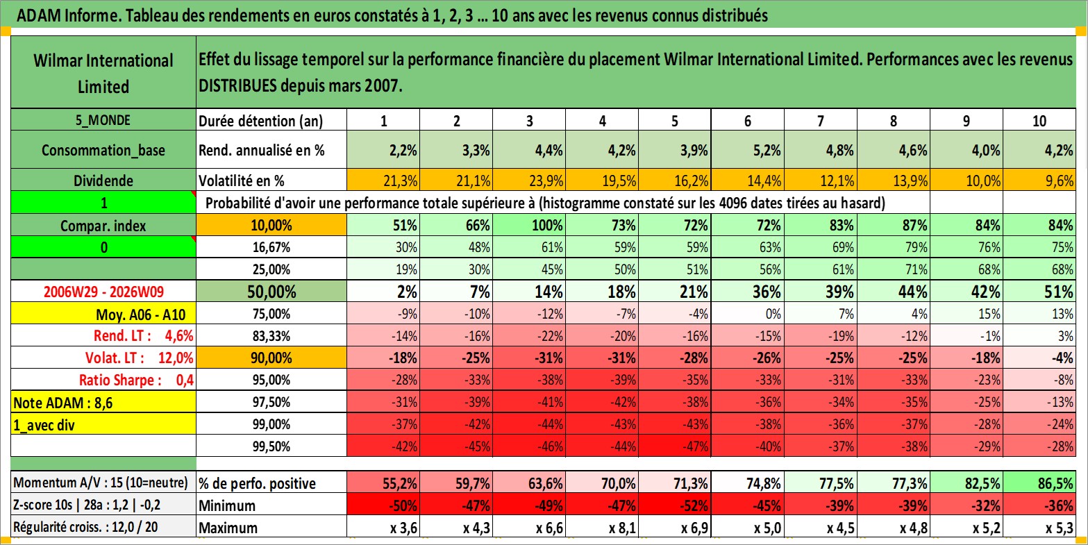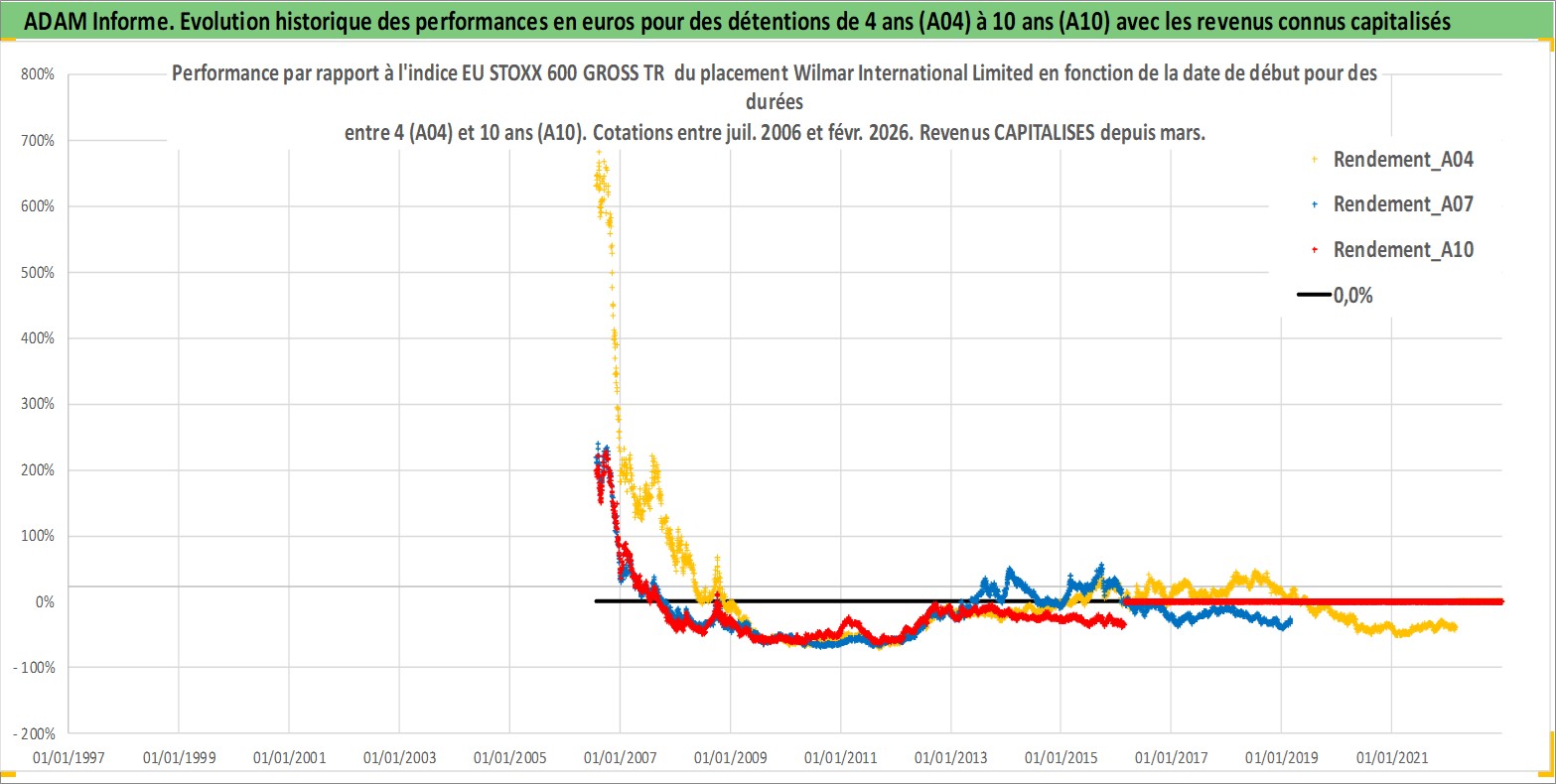 Site dédié aux investisseursPage dédiée sur site financeAnalyse des valorisations hebdomadaires de l'action Wilmar International Limited. Cet actif est cote en SGD. Les valorisations sont en contrevaleur EURO et couvrent les semaines 2006W29 a 2026W09. Les revenus de cet actif financier sont pris en compte depuis la semaine 2007W09. La note globale ESG de cet actif est estimee a 4.0 (apres rebasage entre 0 et 20).
