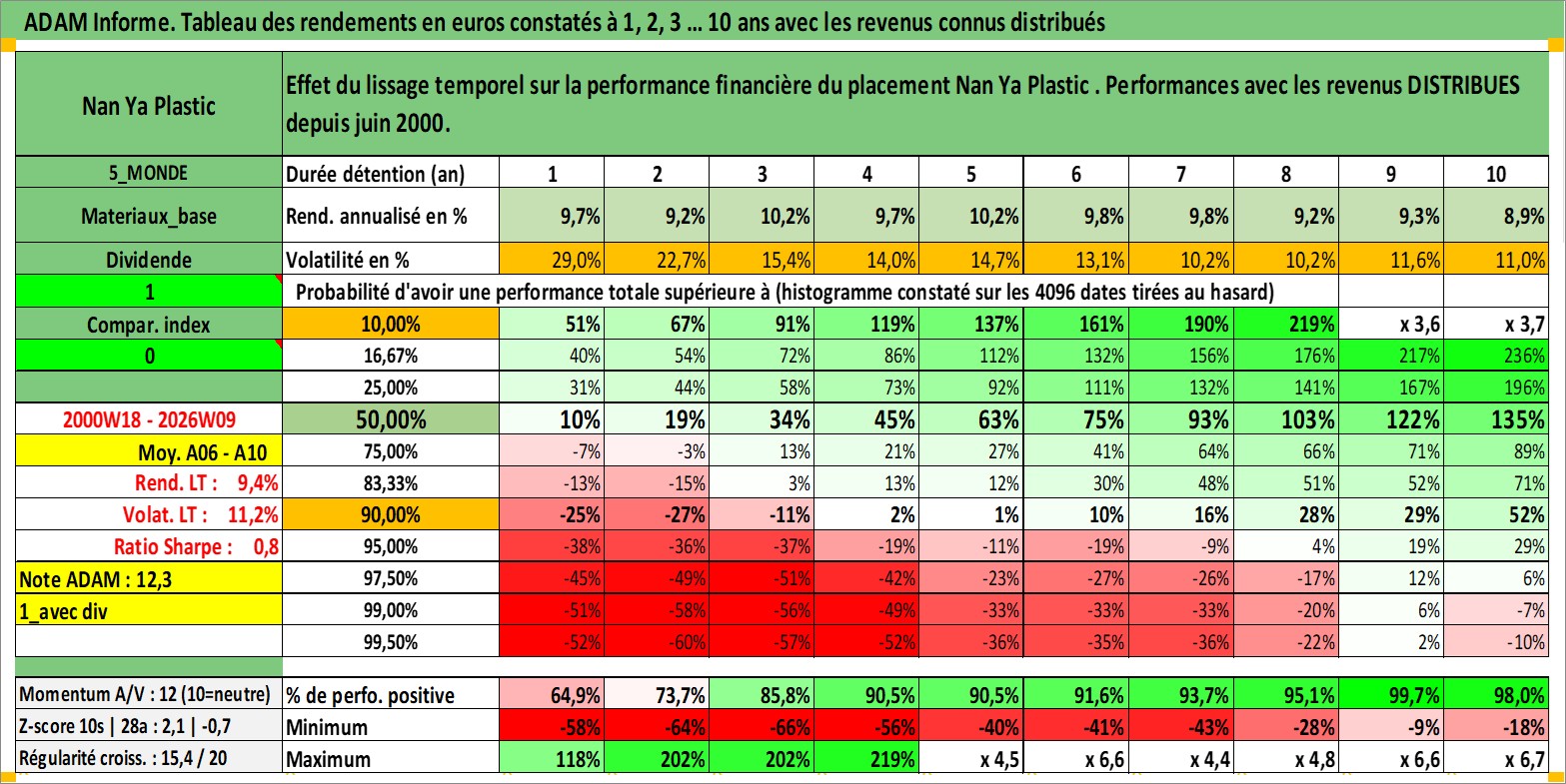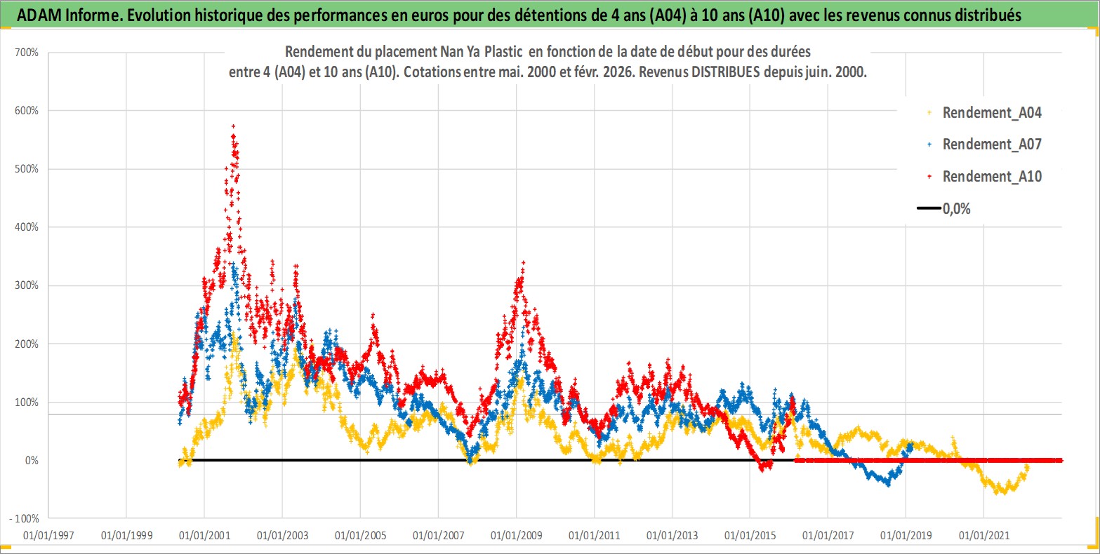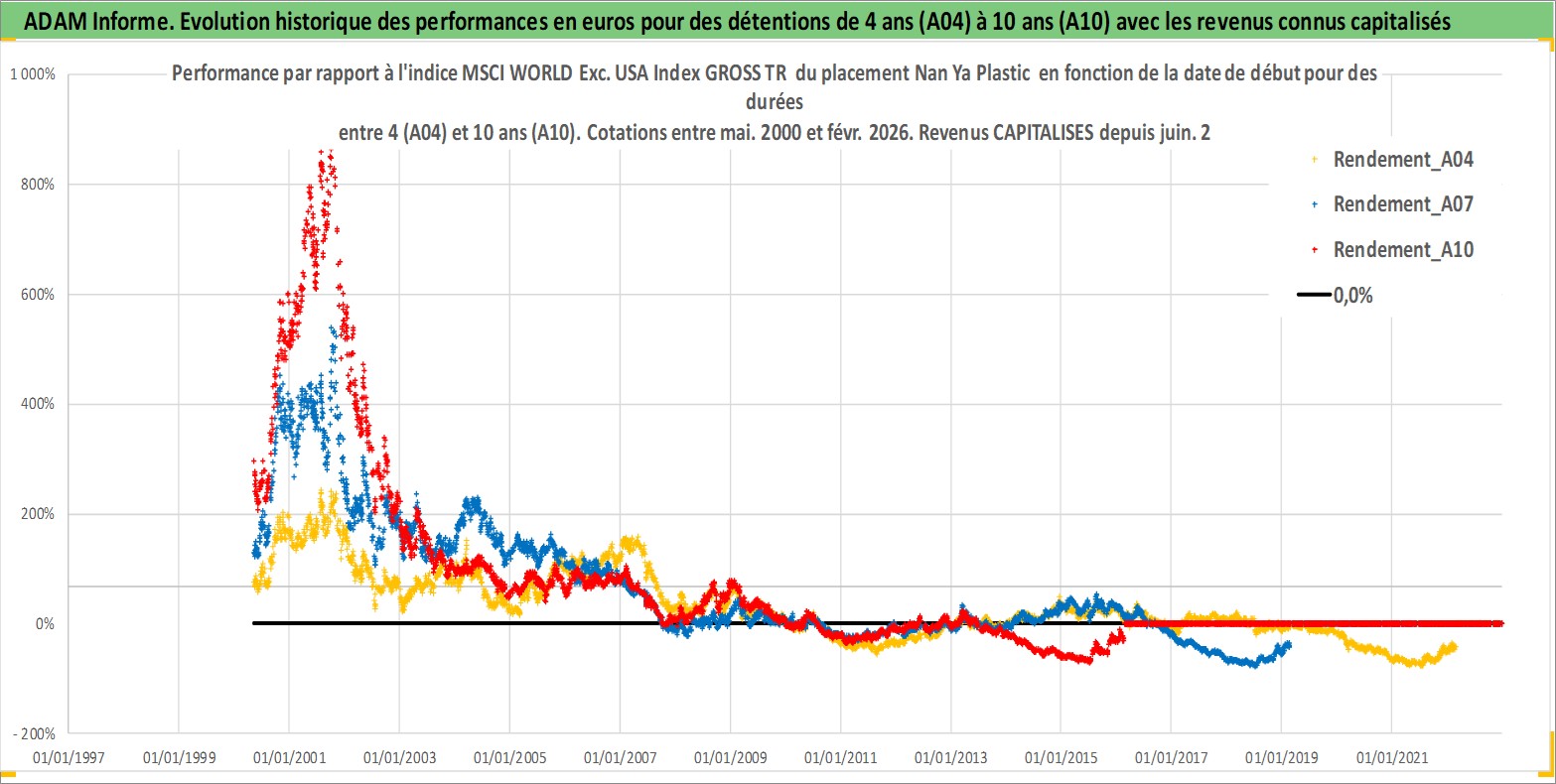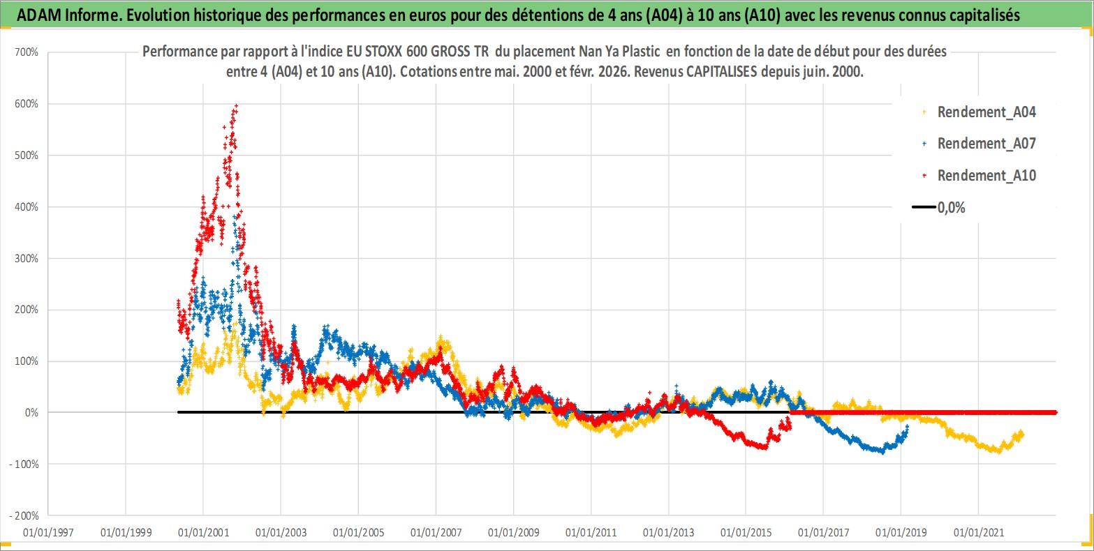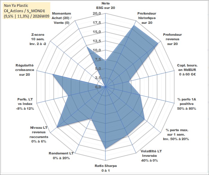 Site dédié aux investisseursPage dédiée sur site financeAnalyse des valorisations hebdomadaires de l'action Nan Ya Plastic . Cet actif est cote en TWD. Les valorisations sont en contrevaleur EURO et couvrent les semaines 2000W18 a 2026W09. Les revenus de cet actif financier sont pris en compte depuis la semaine 2000W26. La note globale ESG de cet actif est estimee a 7.0 (apres rebasage entre 0 et 20).