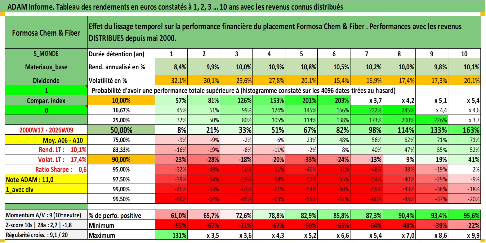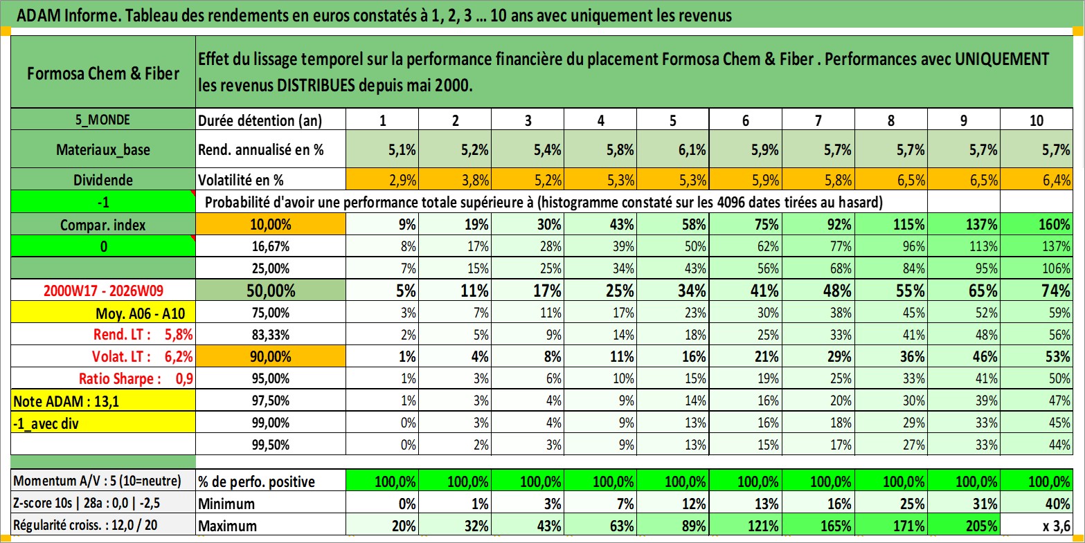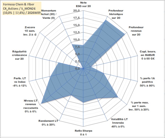Site dédié aux investisseursPage dédiée sur site financeAnalyse des valorisations hebdomadaires de l'action Formosa Chem & Fiber . Cet actif est cote en TWD. Les valorisations sont en contrevaleur EURO et couvrent les semaines 2000W17 a 2026W09. Les revenus de cet actif financier sont pris en compte depuis la semaine 2000W22. La note globale ESG de cet actif est estimee a 8.0 (apres rebasage entre 0 et 20).