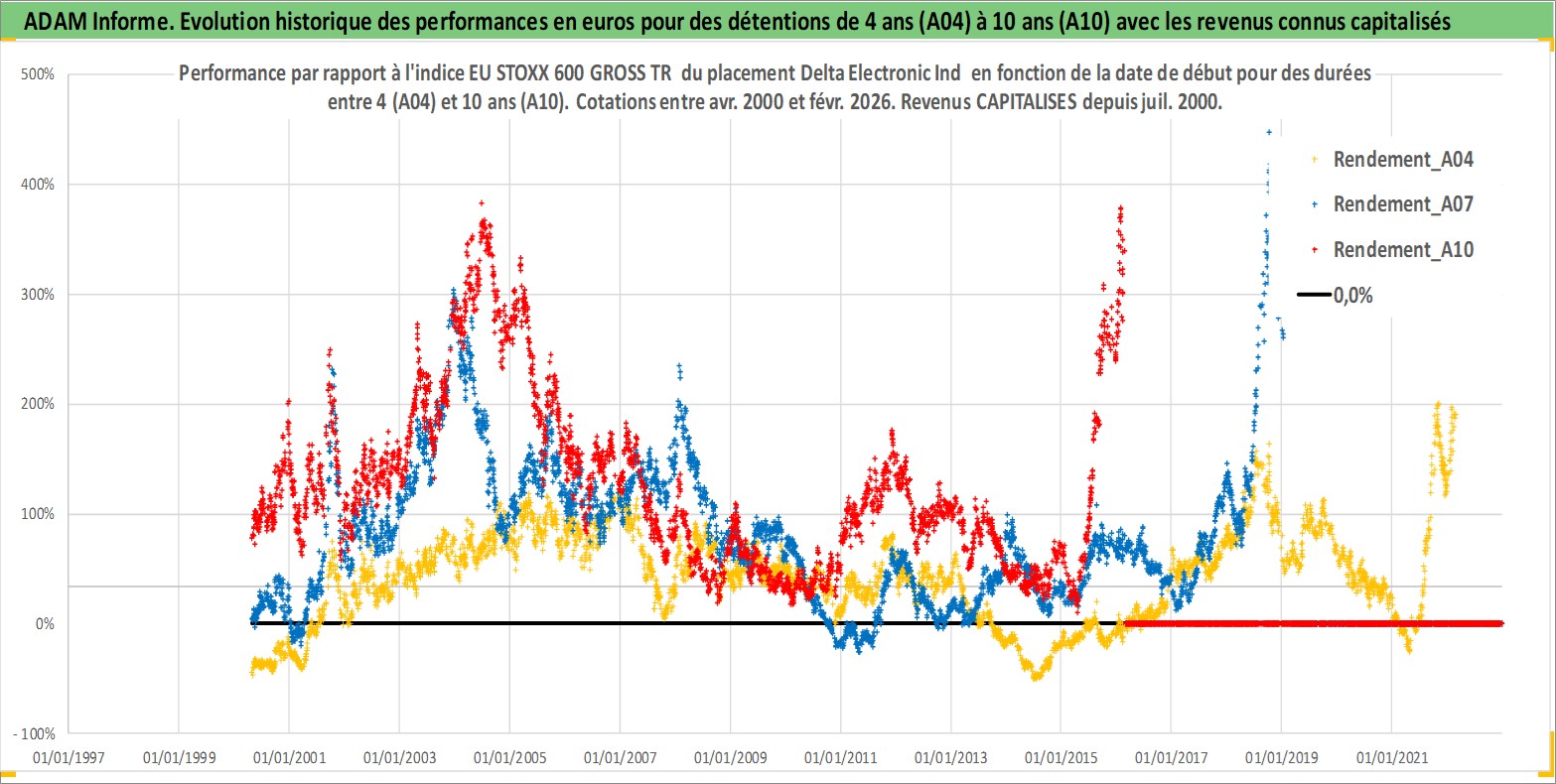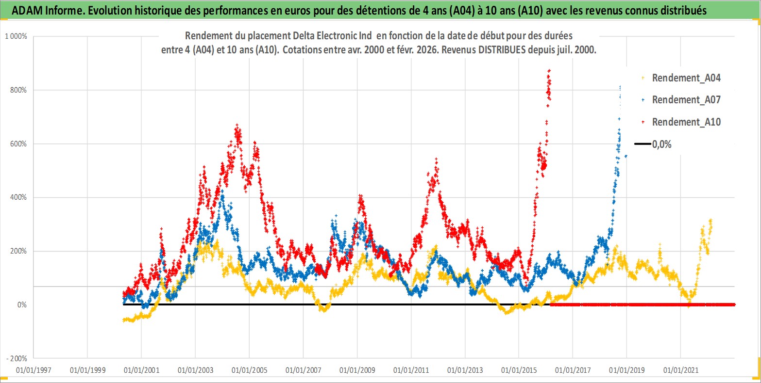 Site dédié aux investisseursPage dédiée sur site financeAnalyse des valorisations hebdomadaires de l'action Delta Electronic Ind . Cet actif est cote en TWD. Les valorisations sont en contrevaleur EURO et couvrent les semaines 2000W16 a 2026W09. Les revenus de cet actif financier sont pris en compte depuis la semaine 2000W28. La note globale ESG de cet actif est estimee a 11.0 (apres rebasage entre 0 et 20).