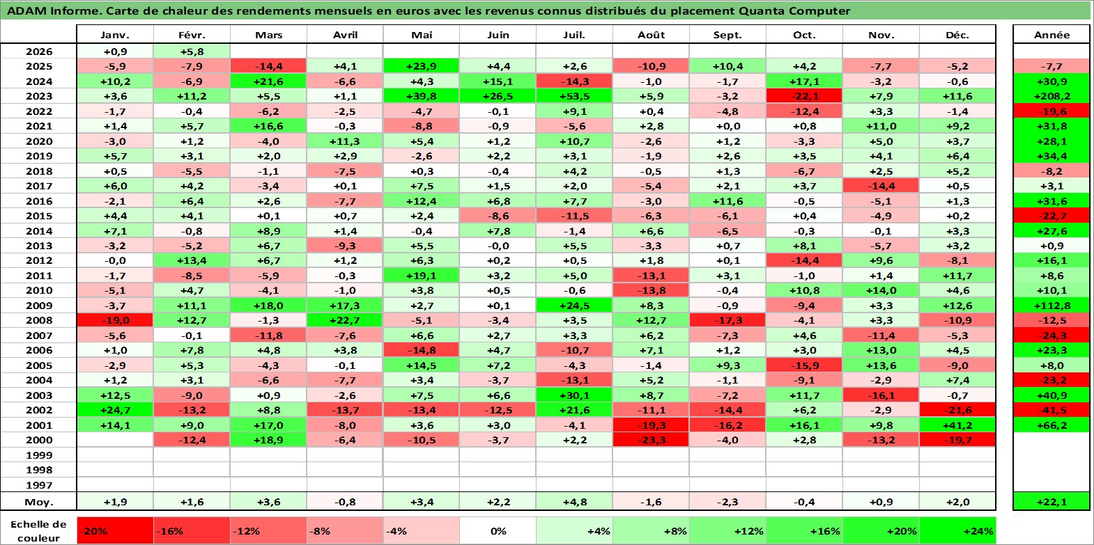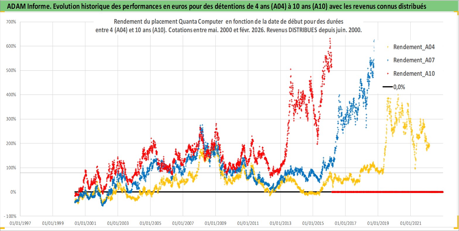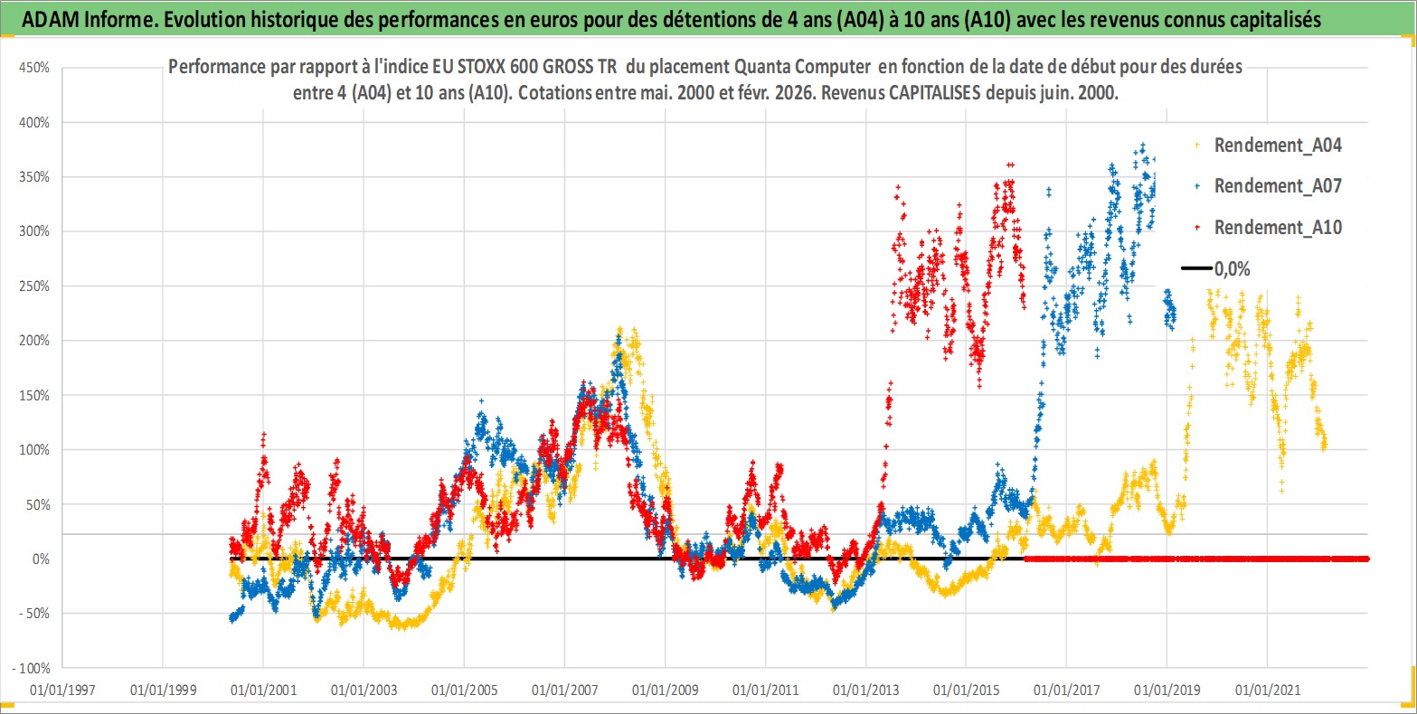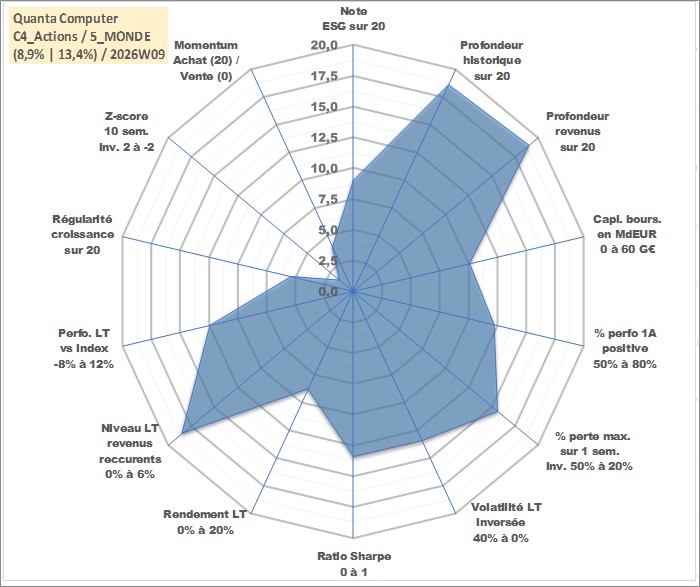 Site dédié aux investisseursPage dédiée sur site financeAnalyse des valorisations hebdomadaires de l'action Quanta Computer . Cet actif est cote en TWD. Les valorisations sont en contrevaleur EURO et couvrent les semaines 2000W18 a 2026W09. Les revenus de cet actif financier sont pris en compte depuis la semaine 2000W24. La note globale ESG de cet actif est estimee a 9.0 (apres rebasage entre 0 et 20).