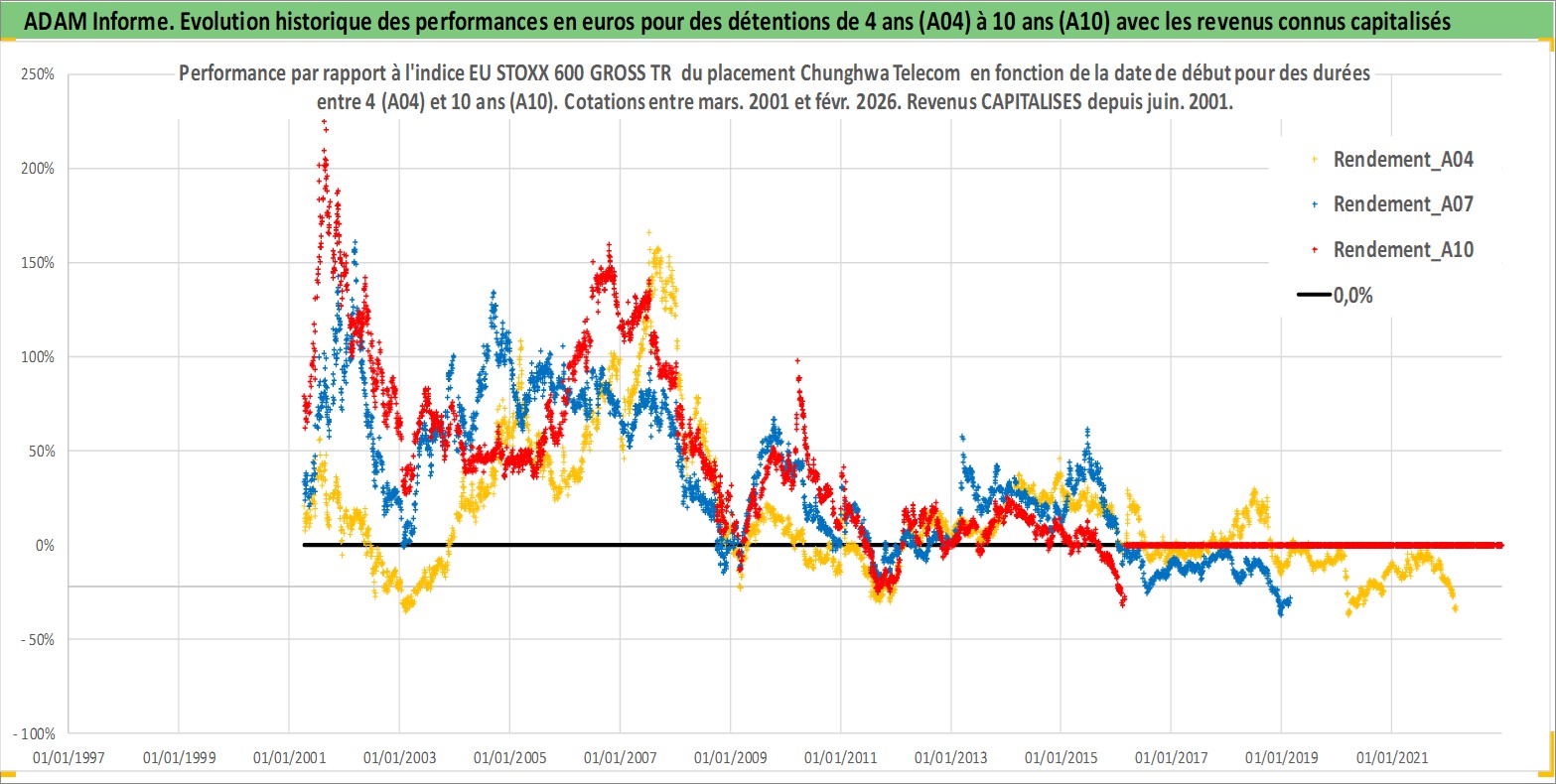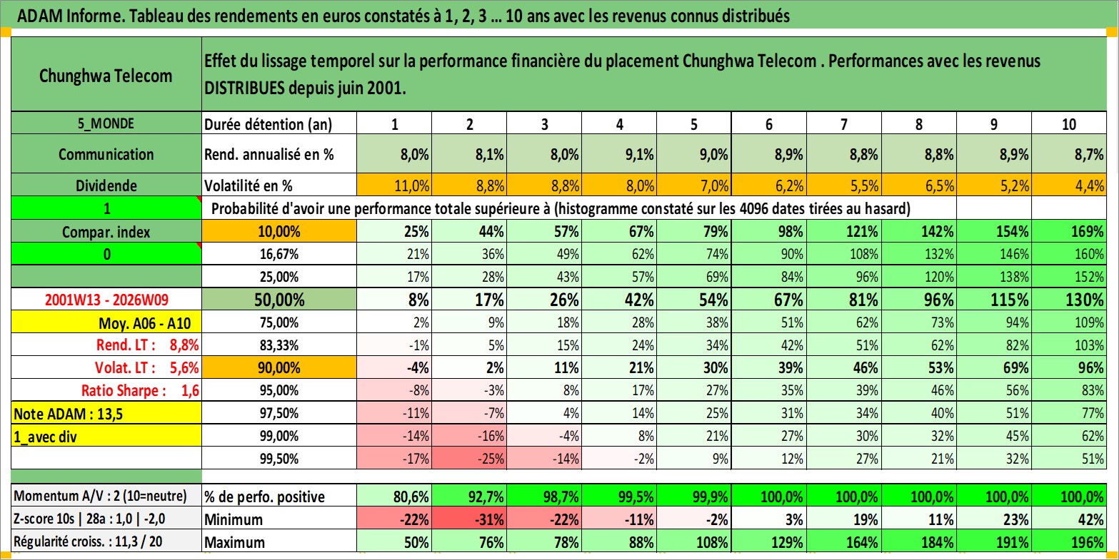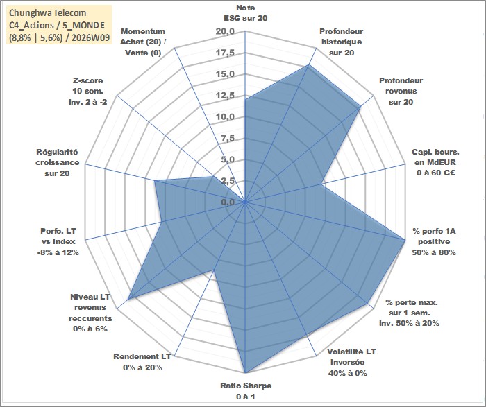 Site dédié aux investisseursPage dédiée sur site financeAnalyse des valorisations hebdomadaires de l'action Chunghwa Telecom . Cet actif est cote en TWD. Les valorisations sont en contrevaleur EURO et couvrent les semaines 2001W13 a 2026W09. Les revenus de cet actif financier sont pris en compte depuis la semaine 2001W25. La note globale ESG de cet actif est estimee a 12.0 (apres rebasage entre 0 et 20).