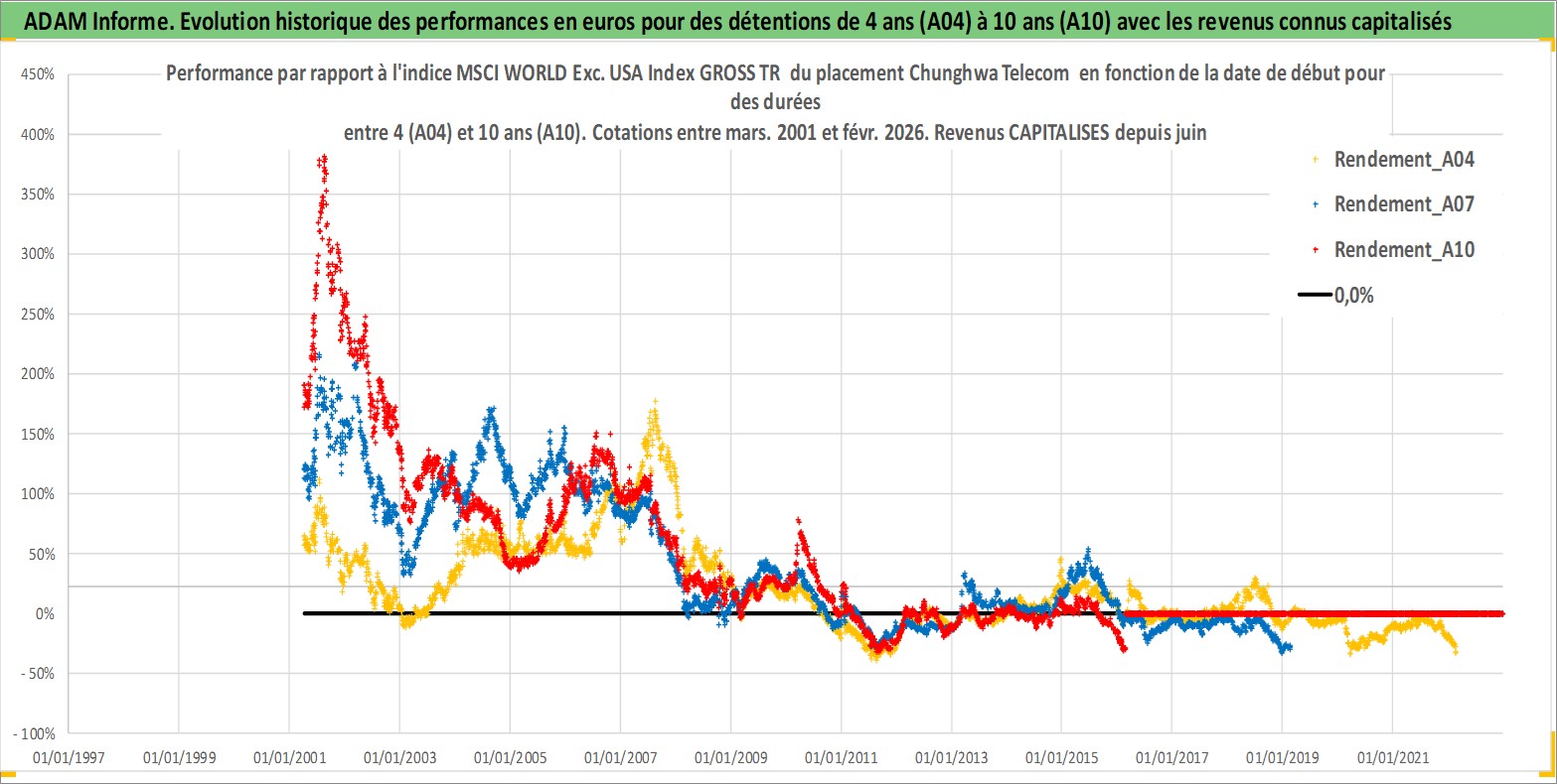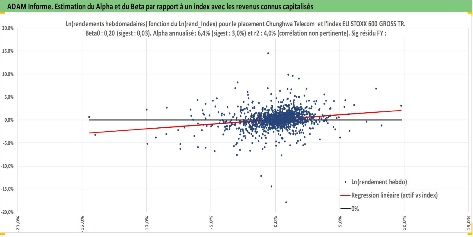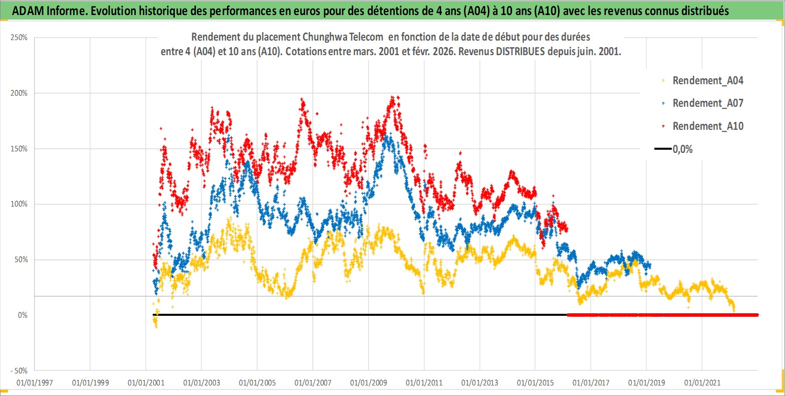 Site dédié aux investisseursPage dédiée sur site financeAnalyse des valorisations hebdomadaires de l'action Chunghwa Telecom . Cet actif est cote en TWD. Les valorisations sont en contrevaleur EURO et couvrent les semaines 2001W13 a 2026W09. Les revenus de cet actif financier sont pris en compte depuis la semaine 2001W25. La note globale ESG de cet actif est estimee a 12.0 (apres rebasage entre 0 et 20).