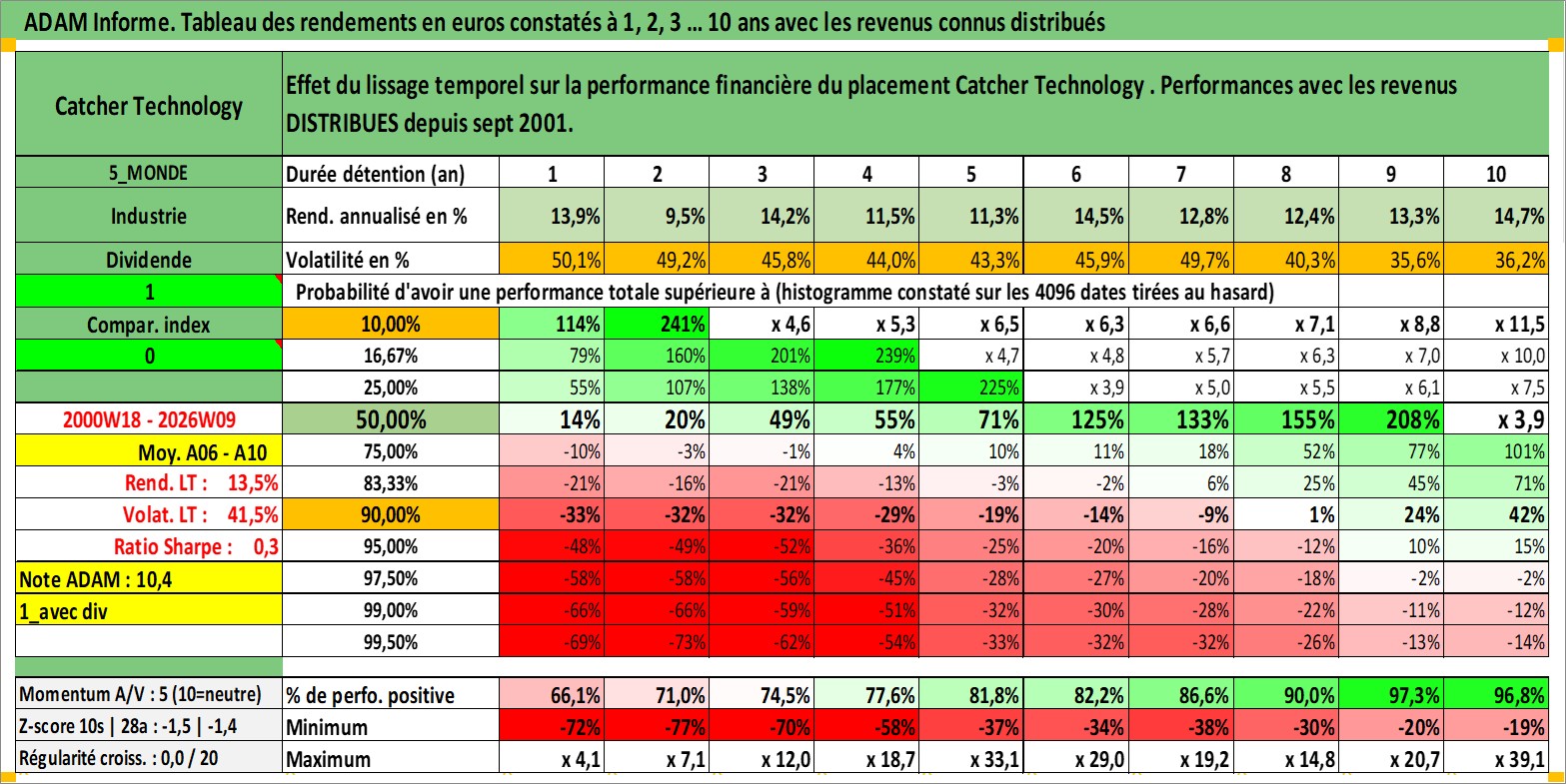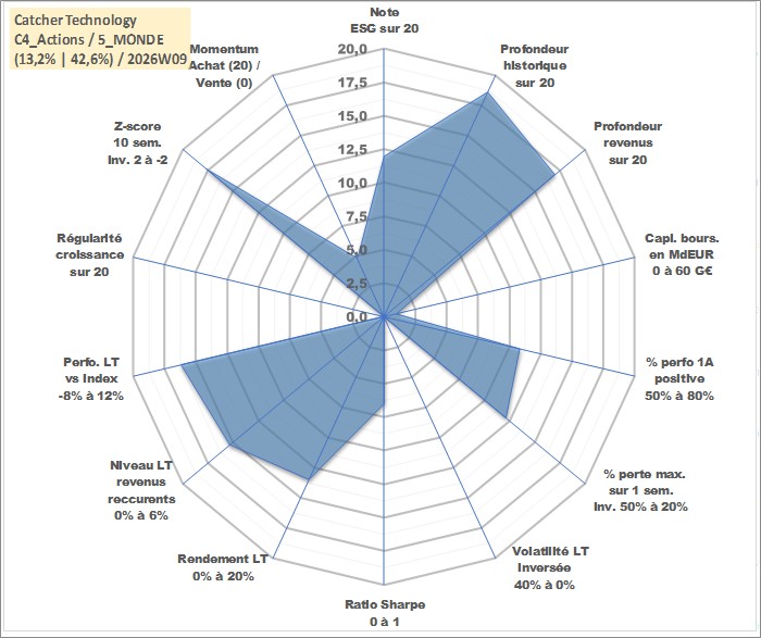 Site dédié aux investisseursPage dédiée sur site financeAnalyse des valorisations hebdomadaires de l'action Catcher Technology . Cet actif est cote en TWD. Les valorisations sont en contrevaleur EURO et couvrent les semaines 2000W18 a 2026W09. Les revenus de cet actif financier sont pris en compte depuis la semaine 2001W36. La note globale ESG de cet actif est estimee a 12.0 (apres rebasage entre 0 et 20).