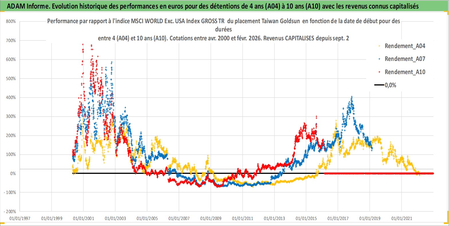 Site dédié aux investisseursPage dédiée sur site financeAnalyse des valorisations hebdomadaires de l'action Taiwan Goldsun . Cet actif est cote en TWD. Les valorisations sont en contrevaleur EURO et couvrent les semaines 2000W16 a 2026W09. Les revenus de cet actif financier sont pris en compte depuis la semaine 2006W37. La note ESG de cet actif n'est pas connue.