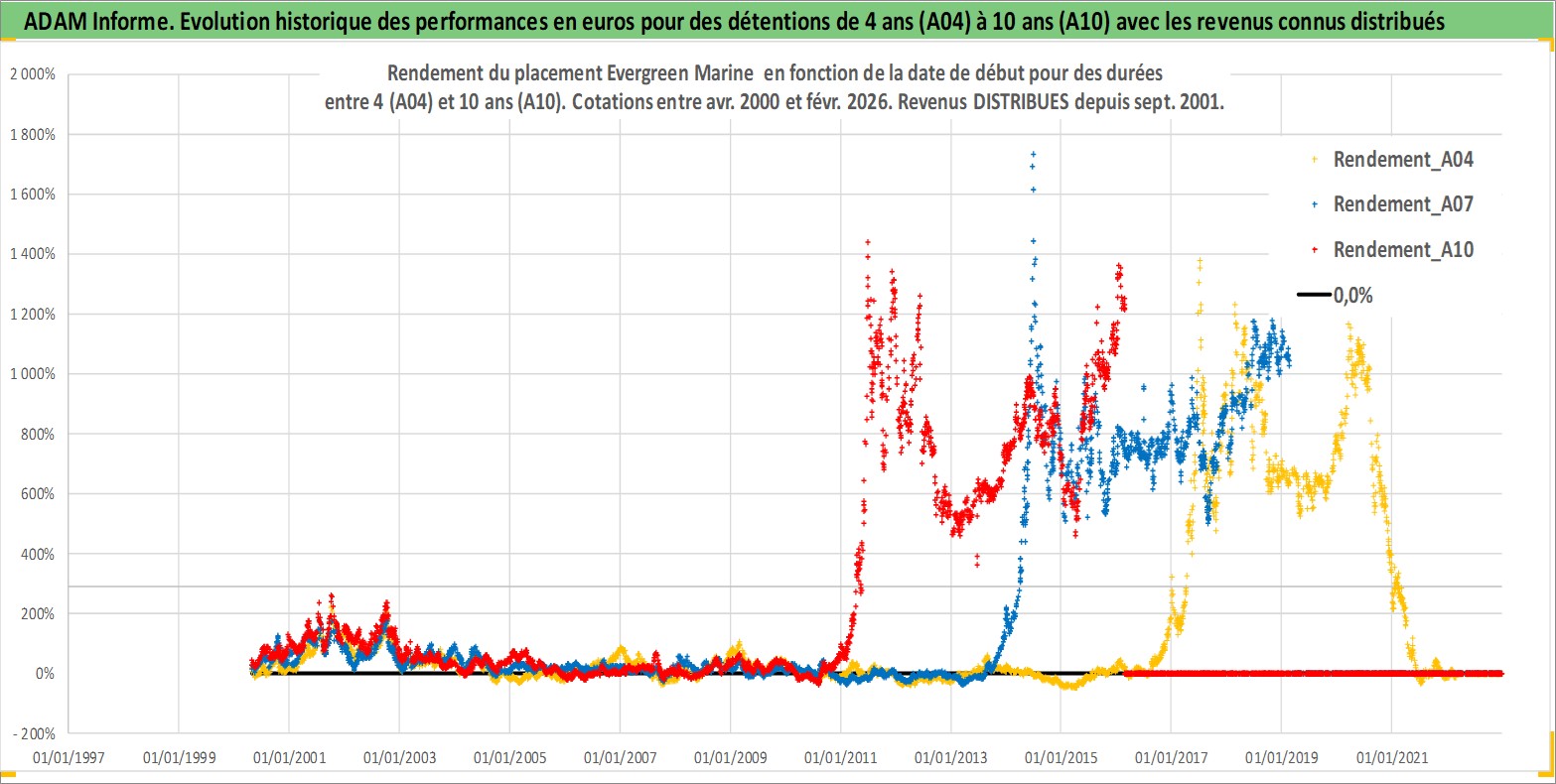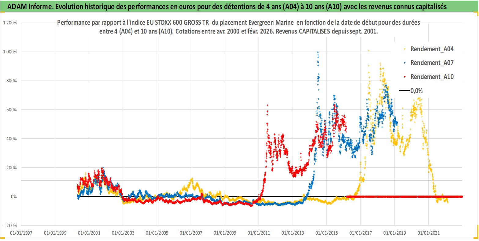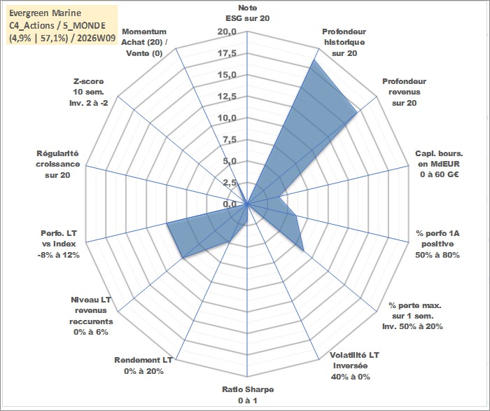 Site dédié aux investisseursPage dédiée sur site financeAnalyse des valorisations hebdomadaires de l'action Evergreen Marine . Cet actif est cote en TWD. Les valorisations sont en contrevaleur EURO et couvrent les semaines 2000W16 a 2026W09. Les revenus de cet actif financier sont pris en compte depuis la semaine 2001W36. La note ESG de cet actif n'est pas connue.