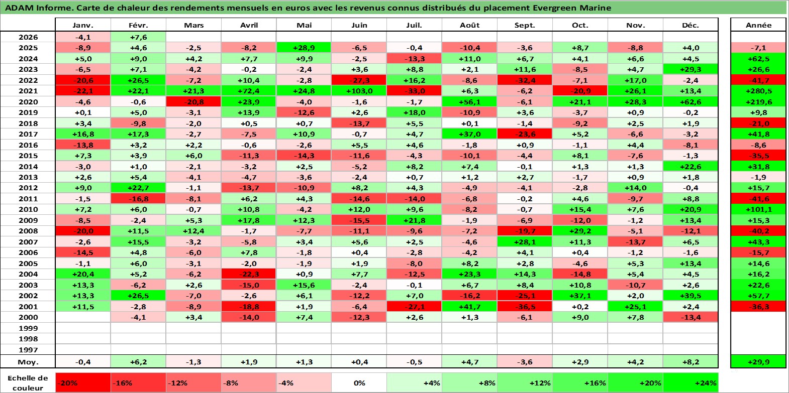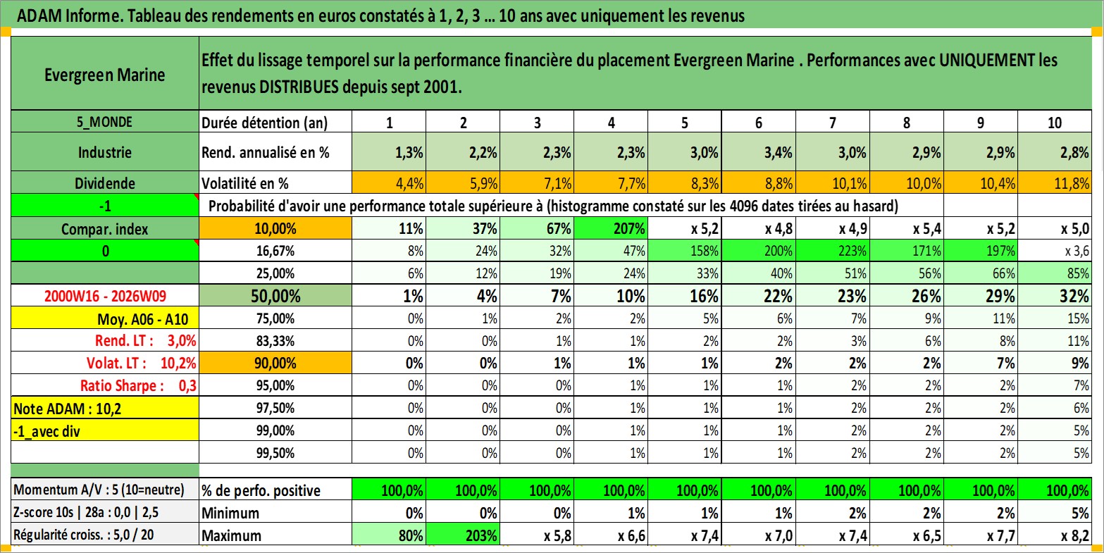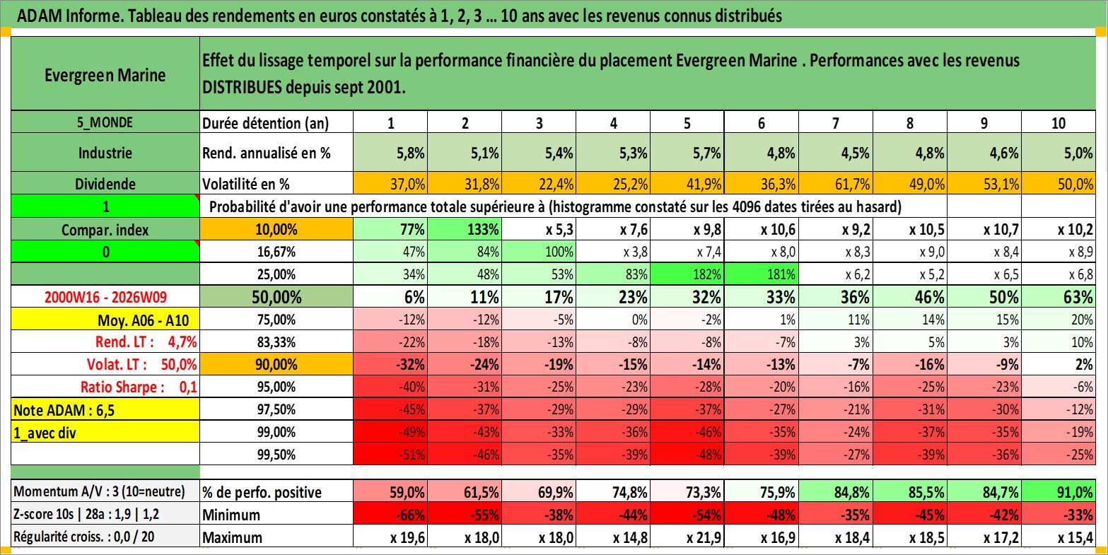 Site dédié aux investisseursPage dédiée sur site financeAnalyse des valorisations hebdomadaires de l'action Evergreen Marine . Cet actif est cote en TWD. Les valorisations sont en contrevaleur EURO et couvrent les semaines 2000W16 a 2026W09. Les revenus de cet actif financier sont pris en compte depuis la semaine 2001W36. La note ESG de cet actif n'est pas connue.