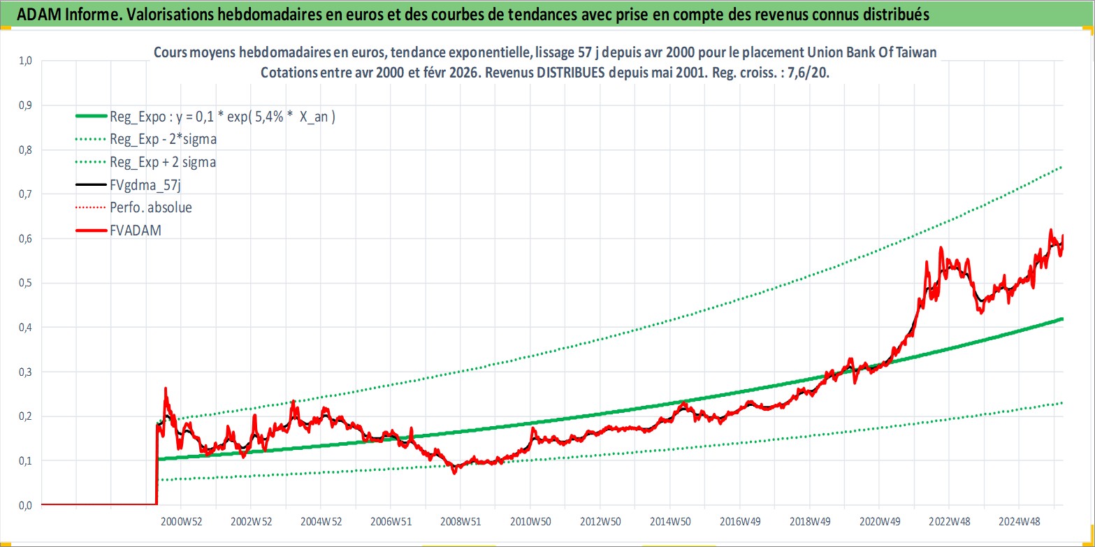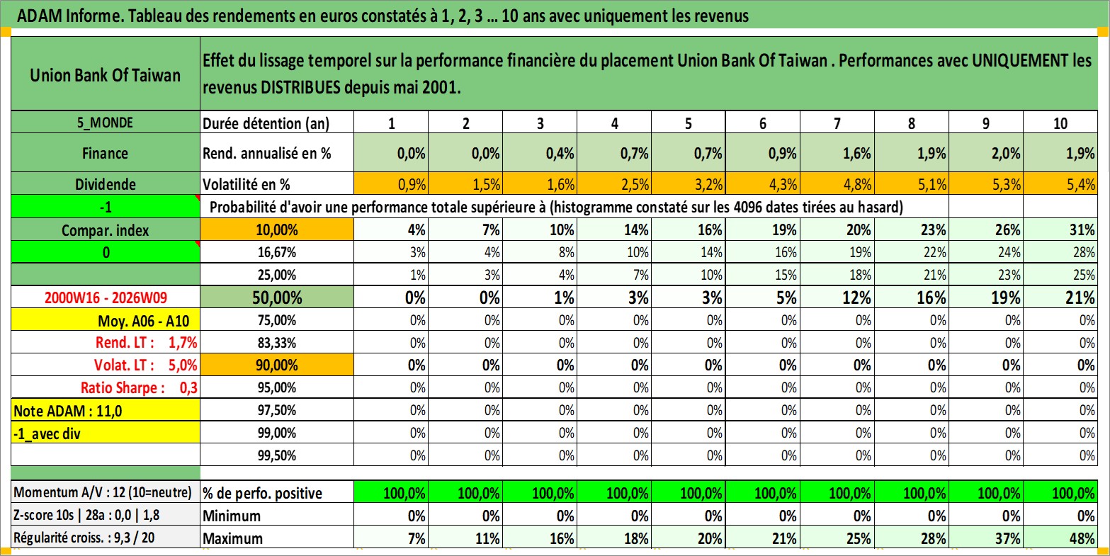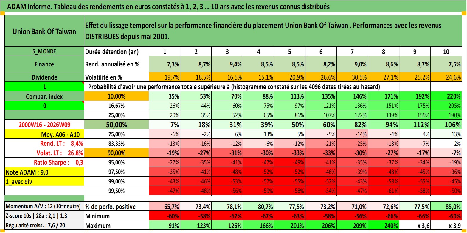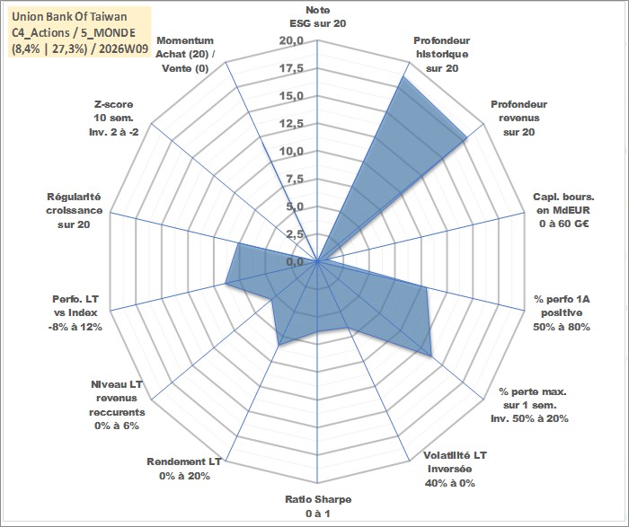 Site dédié aux investisseursPage dédiée sur site financeAnalyse des valorisations hebdomadaires de l'action Union Bank Of Taiwan . Cet actif est cote en TWD. Les valorisations sont en contrevaleur EURO et couvrent les semaines 2000W16 a 2026W09. Les revenus de cet actif financier sont pris en compte depuis la semaine 2001W20. La note ESG de cet actif n'est pas connue.
