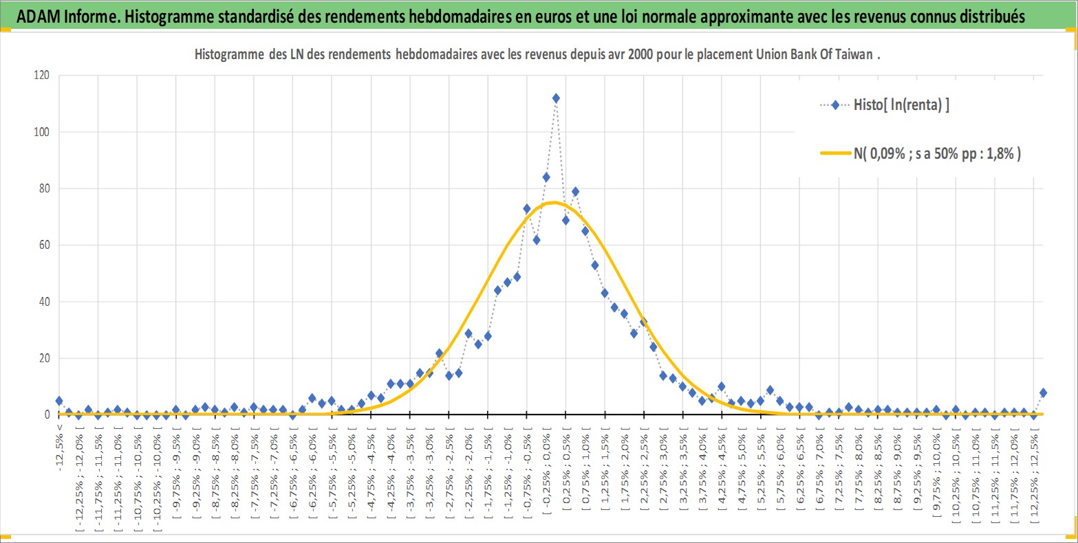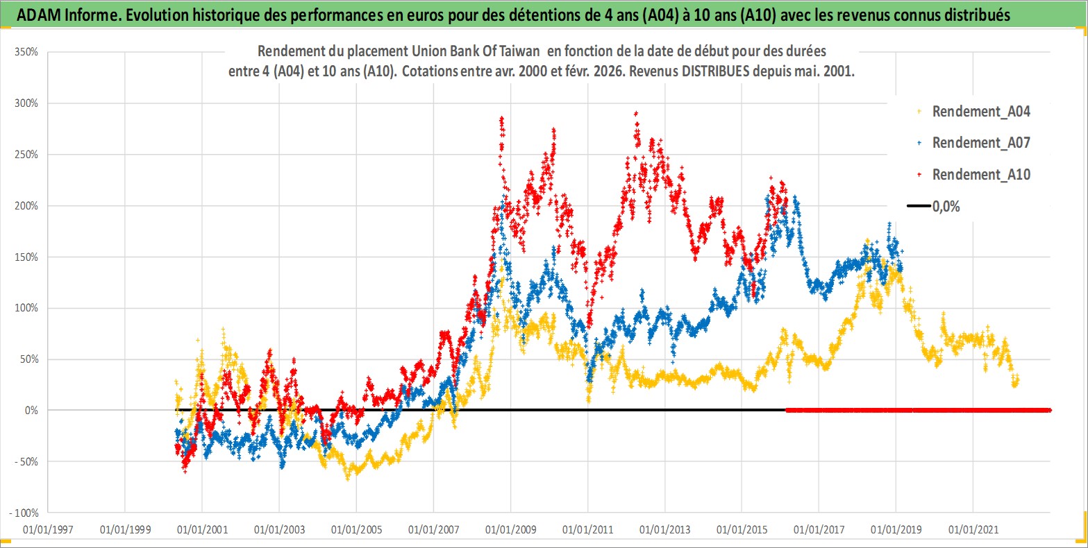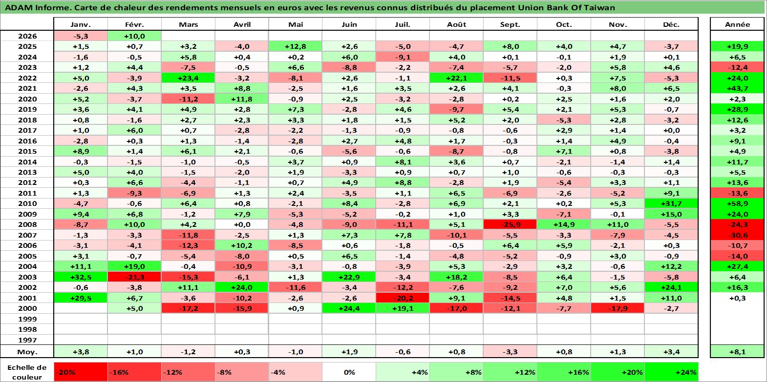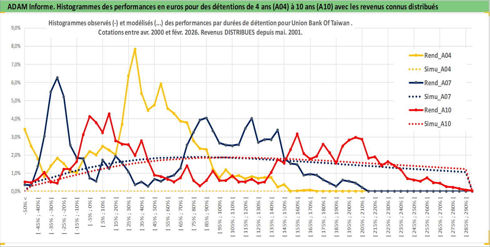 Site dédié aux investisseursPage dédiée sur site financeAnalyse des valorisations hebdomadaires de l'action Union Bank Of Taiwan . Cet actif est cote en TWD. Les valorisations sont en contrevaleur EURO et couvrent les semaines 2000W16 a 2026W09. Les revenus de cet actif financier sont pris en compte depuis la semaine 2001W20. La note ESG de cet actif n'est pas connue.