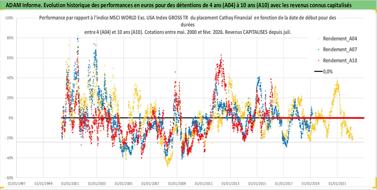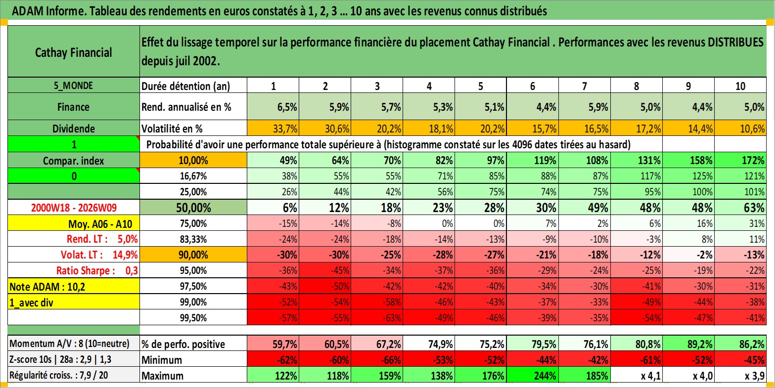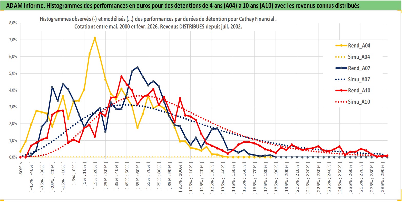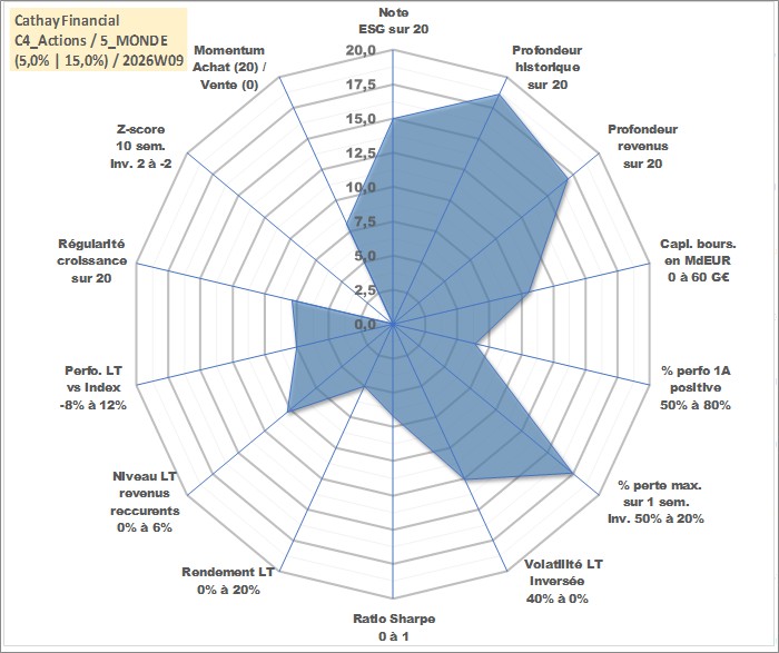 Site dédié aux investisseursPage dédiée sur site financeAnalyse des valorisations hebdomadaires de l'action Cathay Financial . Cet actif est cote en TWD. Les valorisations sont en contrevaleur EURO et couvrent les semaines 2000W18 a 2026W09. Les revenus de cet actif financier sont pris en compte depuis la semaine 2002W29. La note globale ESG de cet actif est estimee a 15.0 (apres rebasage entre 0 et 20).