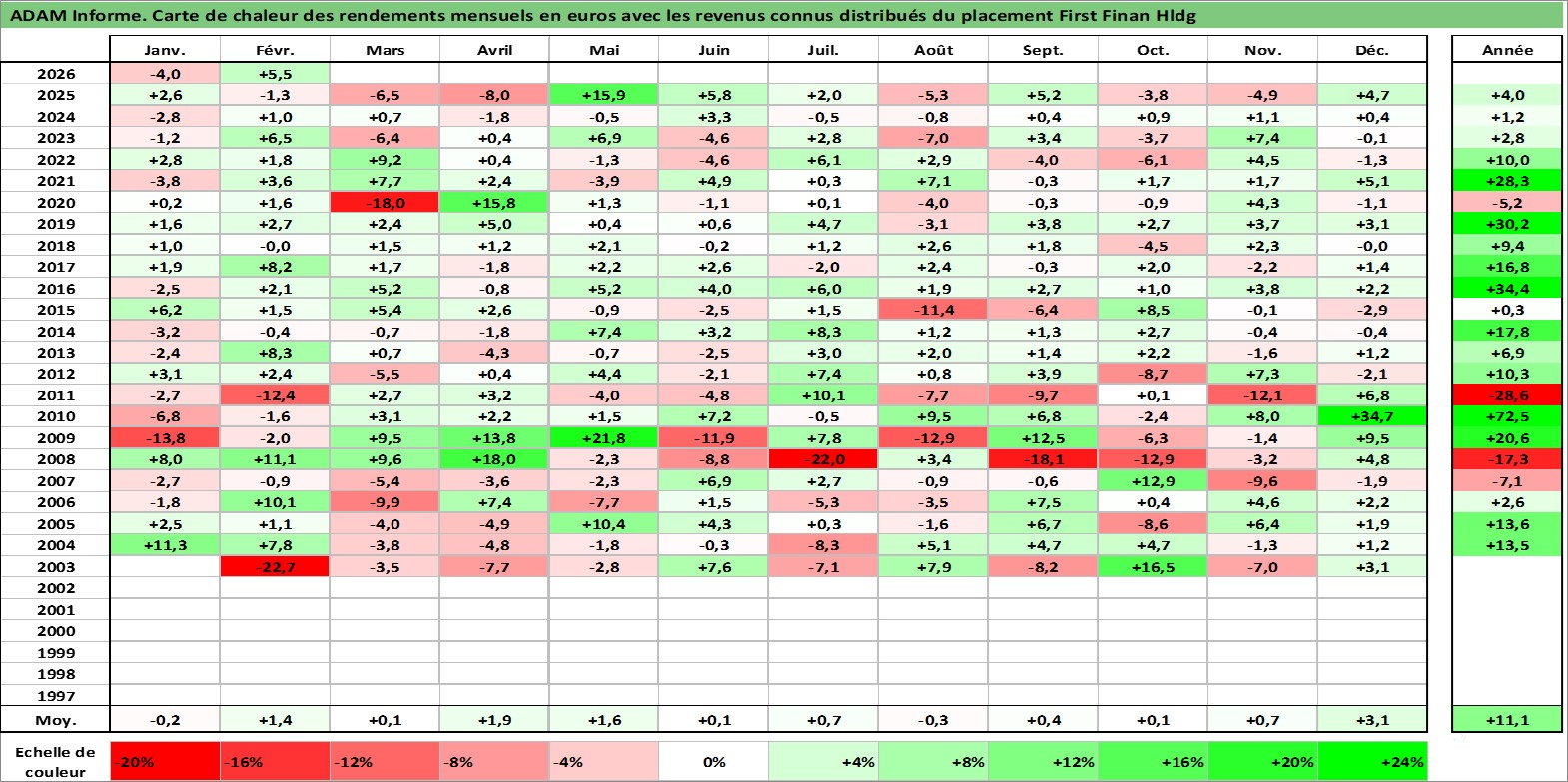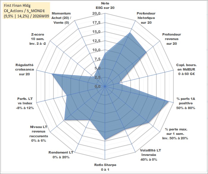 Site dédié aux investisseursPage dédiée sur site financeAnalyse des valorisations hebdomadaires de l'action First Finan Hldg . Cet actif est cote en TWD. Les valorisations sont en contrevaleur EURO et couvrent les semaines 2003W16 a 2026W09. Les revenus de cet actif financier sont pris en compte depuis la semaine 2005W32. La note globale ESG de cet actif est estimee a 9.0 (apres rebasage entre 0 et 20).