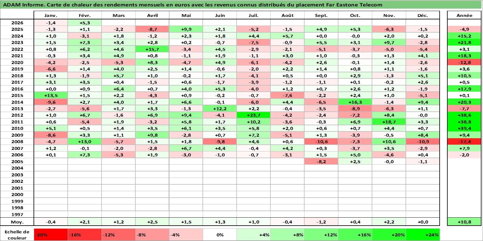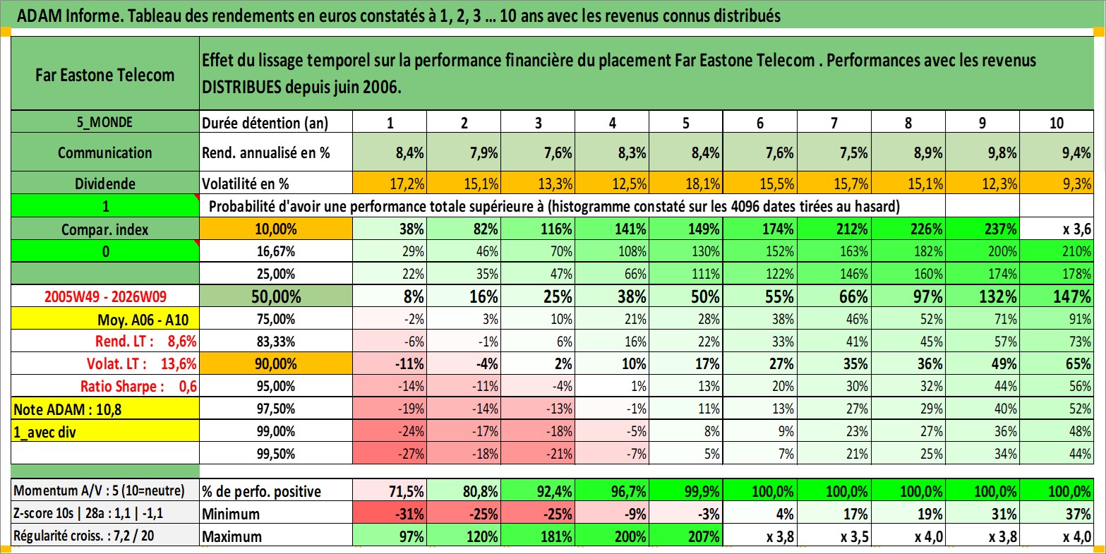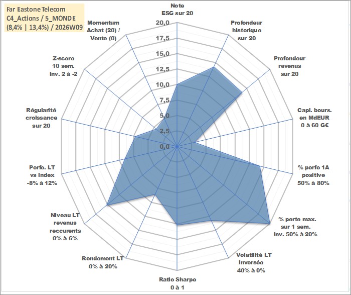 Site dédié aux investisseursPage dédiée sur site financeAnalyse des valorisations hebdomadaires de l'action Far Eastone Telecom . Cet actif est cote en TWD. Les valorisations sont en contrevaleur EURO et couvrent les semaines 2005W49 a 2026W09. Les revenus de cet actif financier sont pris en compte depuis la semaine 2006W24. La note globale ESG de cet actif est estimee a 10.0 (apres rebasage entre 0 et 20).