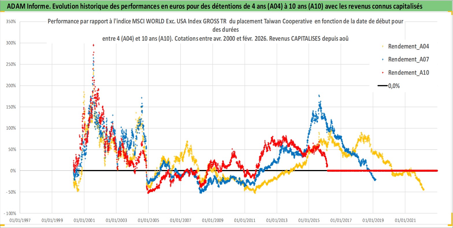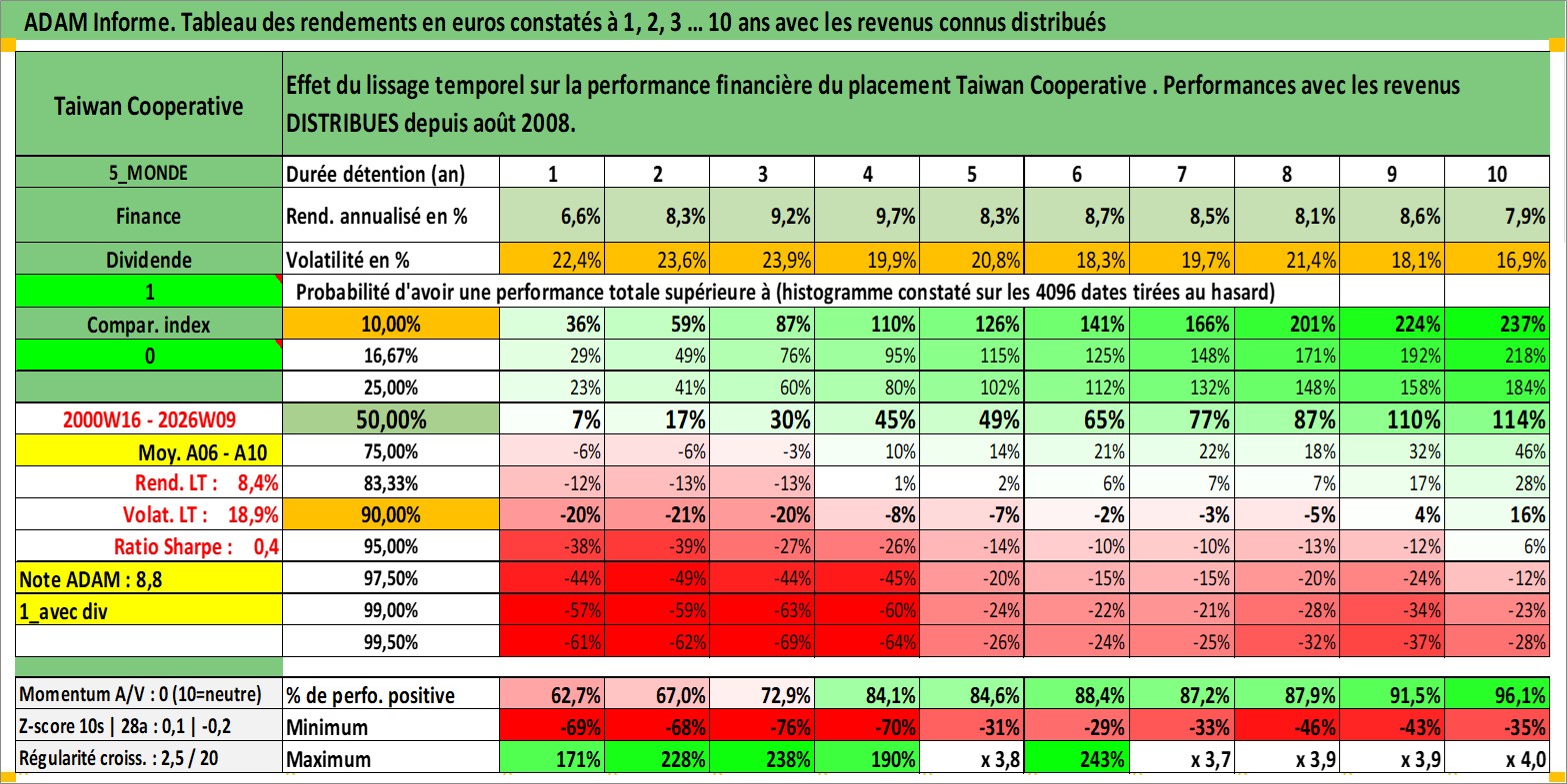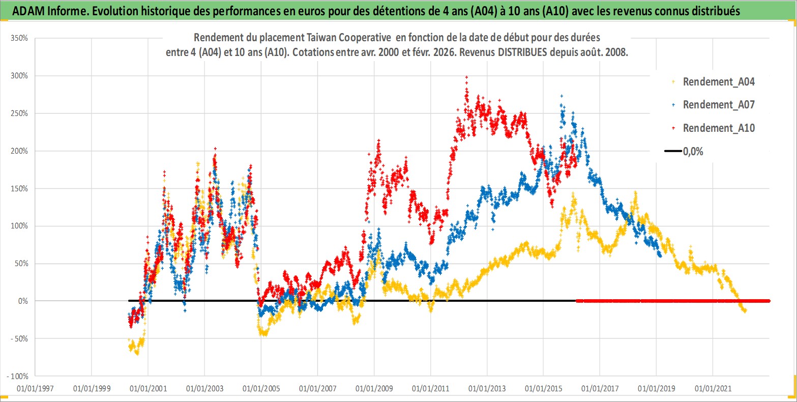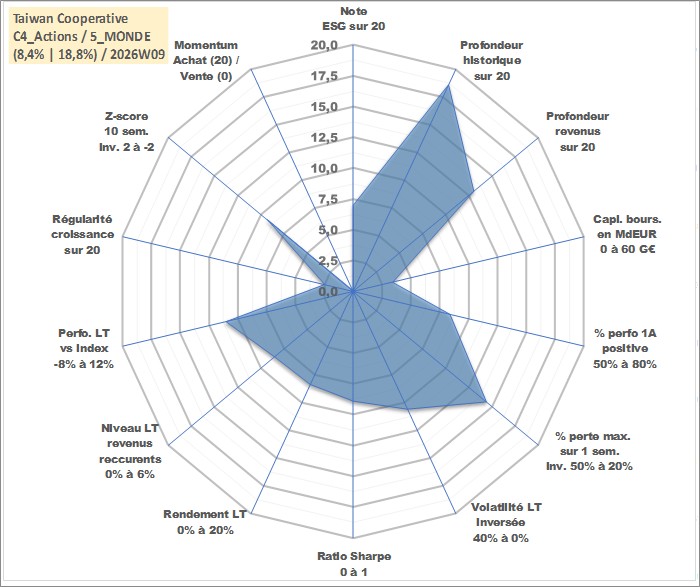 Site dédié aux investisseursPage dédiée sur site financeAnalyse des valorisations hebdomadaires de l'action Taiwan Cooperative . Cet actif est cote en TWD. Les valorisations sont en contrevaleur EURO et couvrent les semaines 2000W16 a 2026W09. Les revenus de cet actif financier sont pris en compte depuis la semaine 2008W32. La note globale ESG de cet actif est estimee a 7.0 (apres rebasage entre 0 et 20).