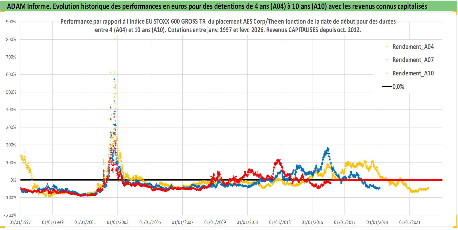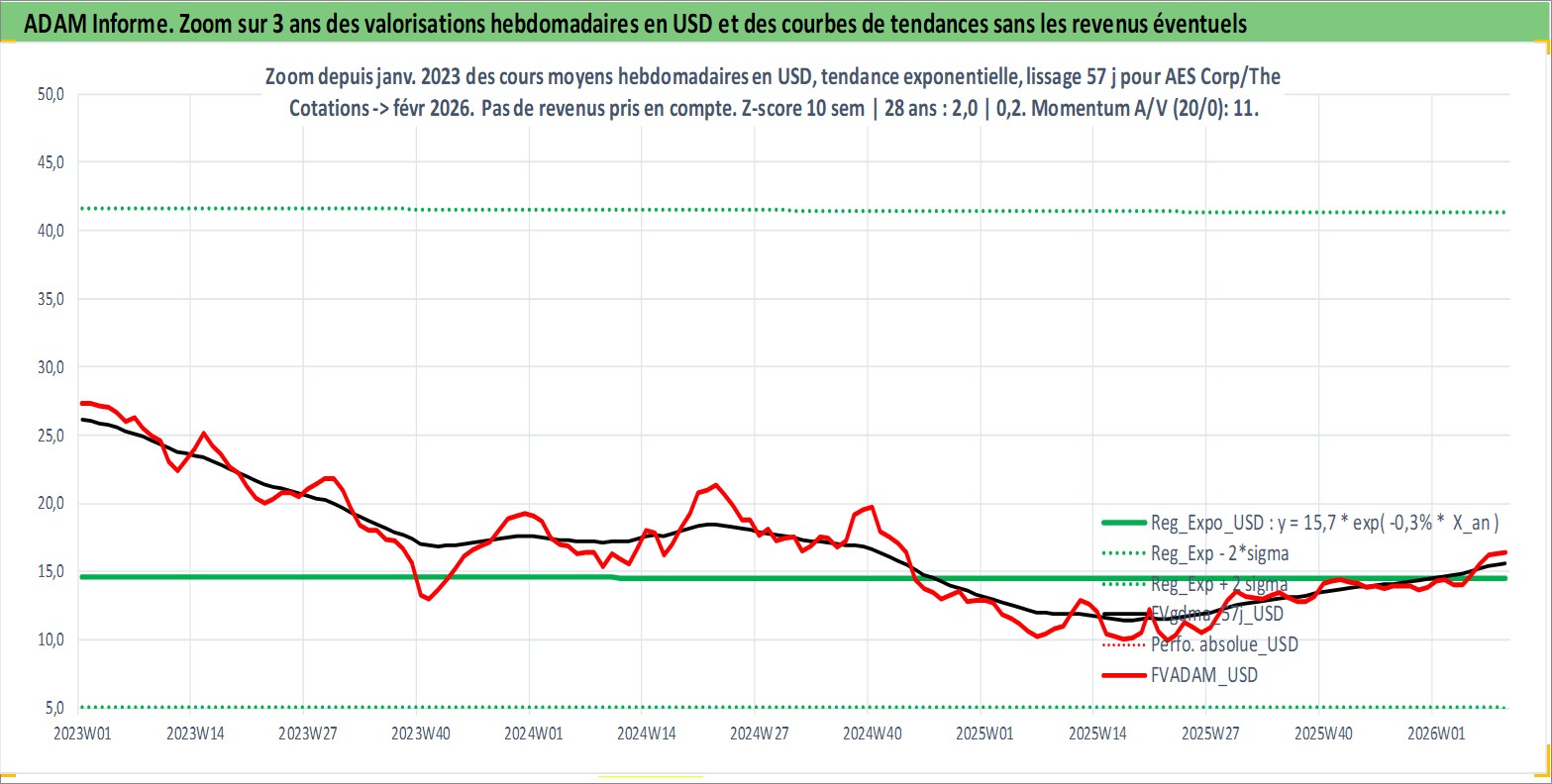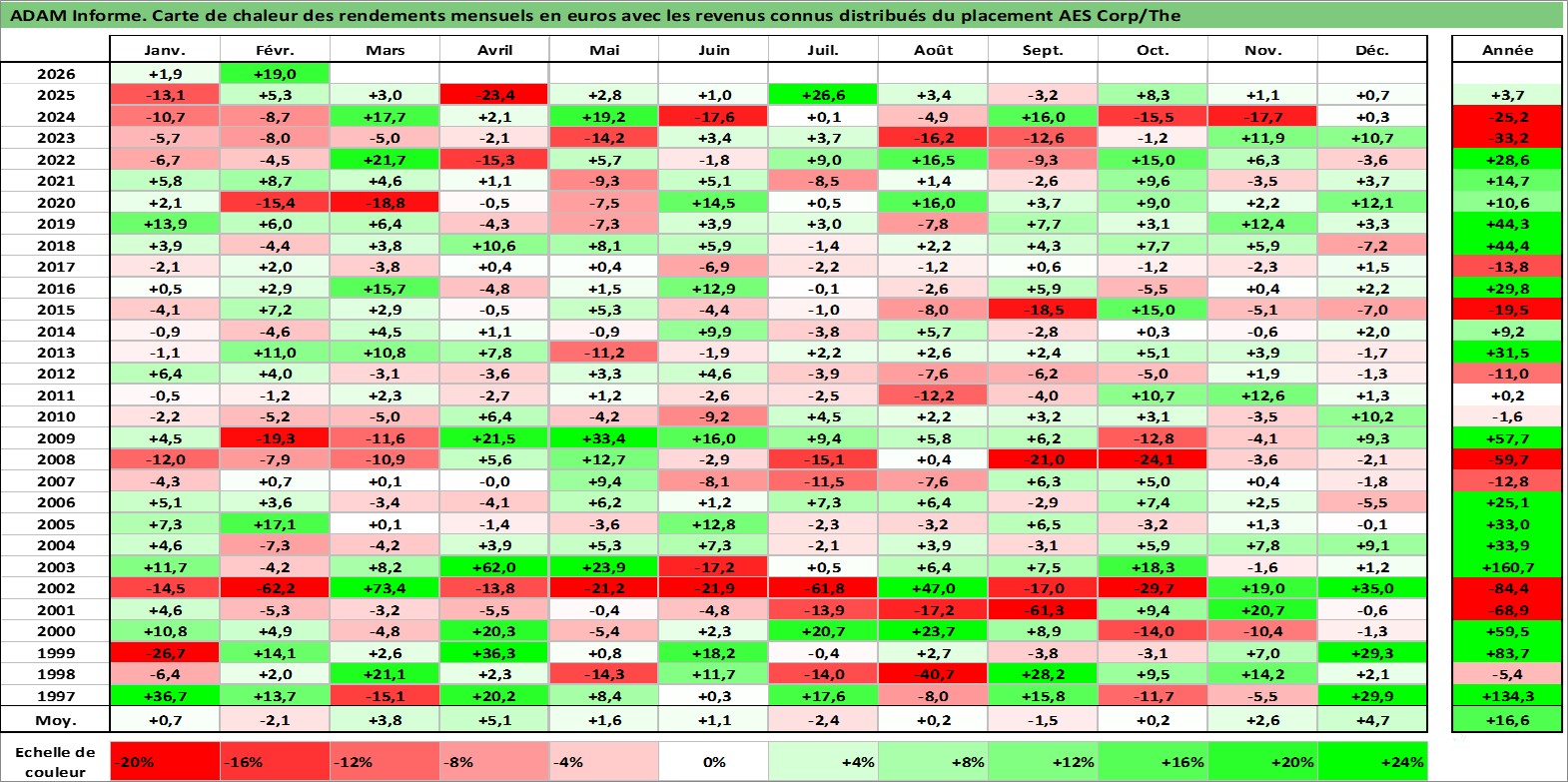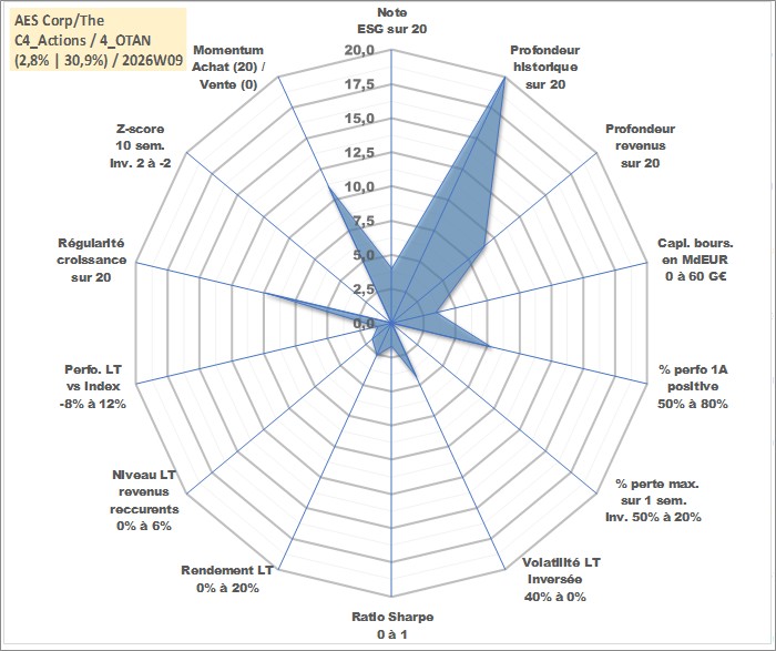 Site dédié aux investisseursPage dédiée sur site financeAnalyse des valorisations hebdomadaires de l'action AES Corp/The. Cet actif est cote en USD. Les valorisations sont en contrevaleur EURO et couvrent les semaines 1997W01 a 2026W09. Les revenus de cet actif financier sont pris en compte depuis la semaine 2012W43. La note globale ESG de cet actif est estimee a 4.0 (apres rebasage entre 0 et 20).