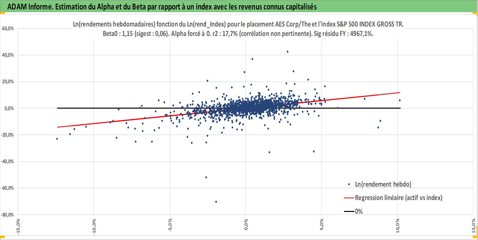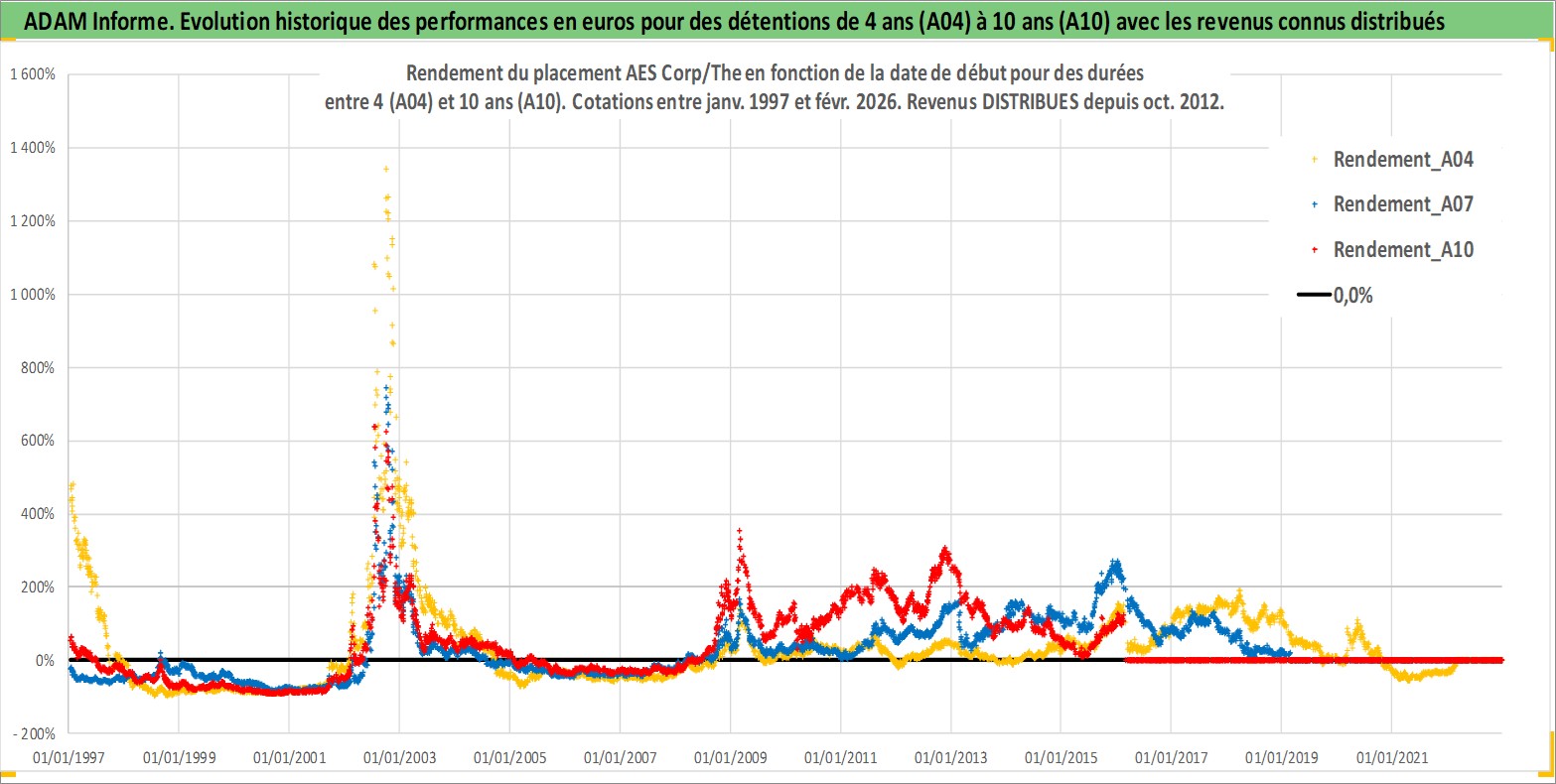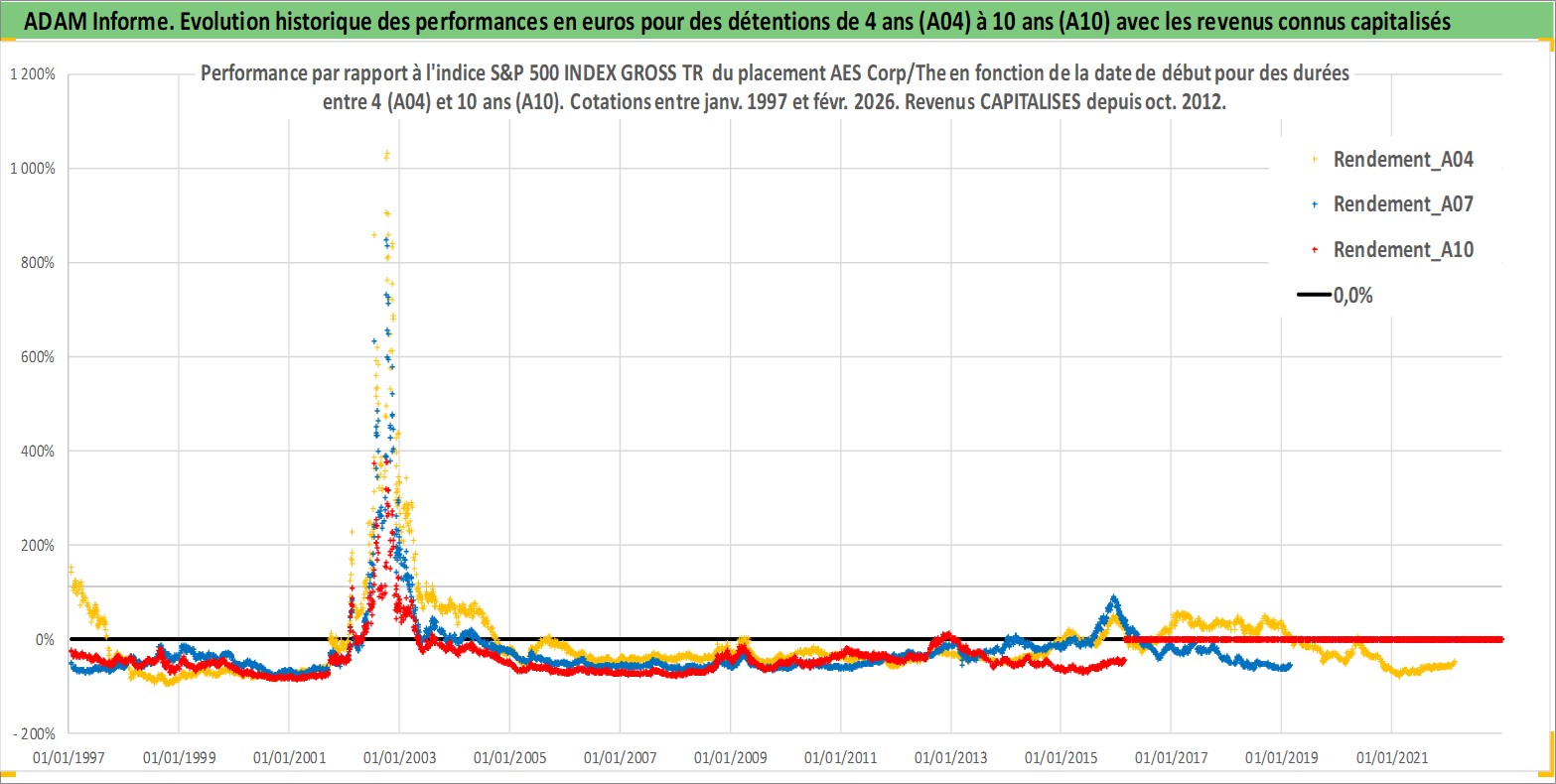 Site dédié aux investisseursPage dédiée sur site financeAnalyse des valorisations hebdomadaires de l'action AES Corp/The. Cet actif est cote en USD. Les valorisations sont en contrevaleur EURO et couvrent les semaines 1997W01 a 2026W09. Les revenus de cet actif financier sont pris en compte depuis la semaine 2012W43. La note globale ESG de cet actif est estimee a 4.0 (apres rebasage entre 0 et 20).