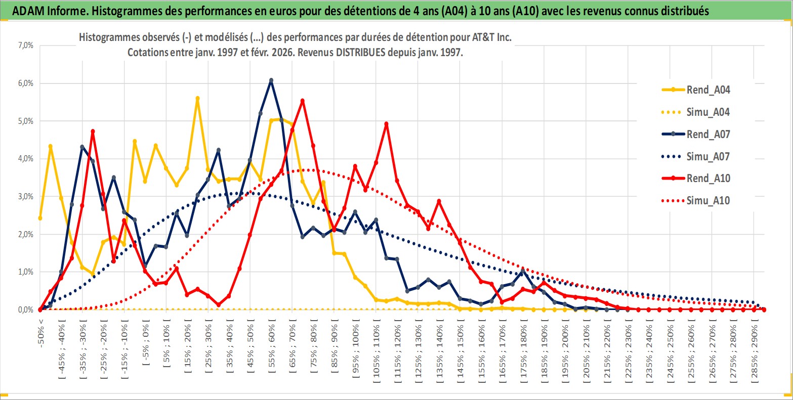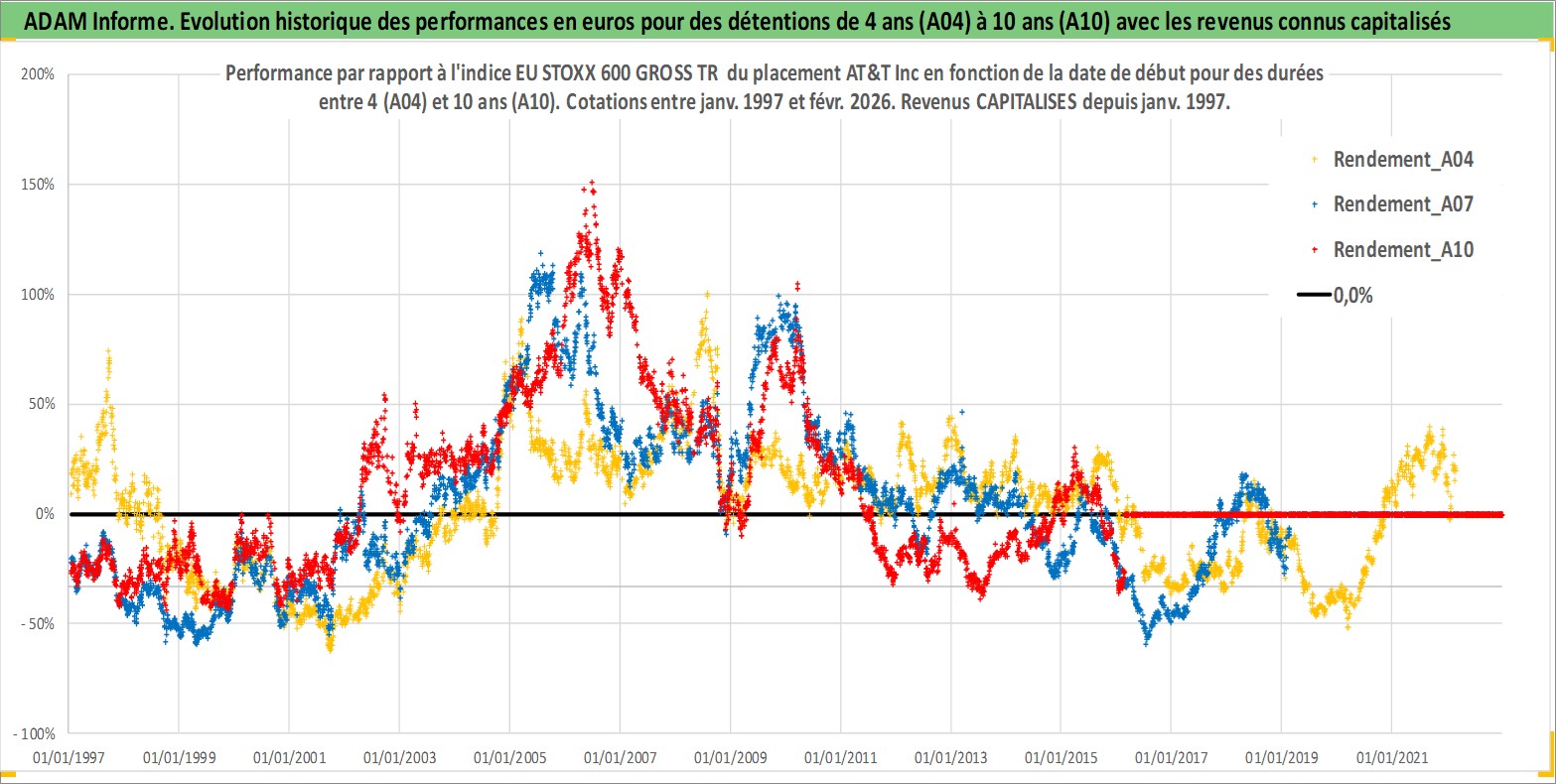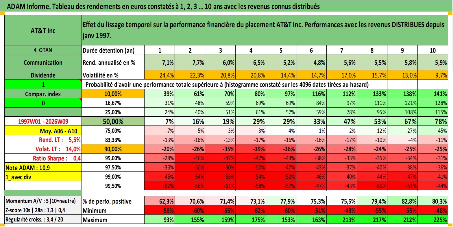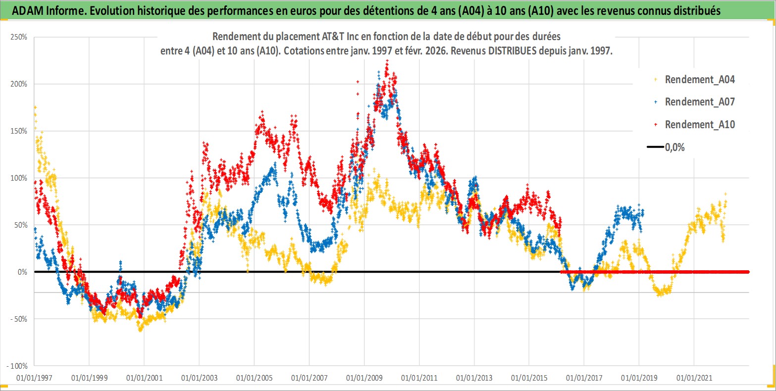 Site dédié aux investisseursPage dédiée sur site financeAnalyse des valorisations hebdomadaires de l'action AT&T Inc. Cet actif est cote en USD. Les valorisations sont en contrevaleur EURO et couvrent les semaines 1997W01 a 2026W09. Les revenus de cet actif financier sont pris en compte depuis la semaine 1997W02. La note globale ESG de cet actif est estimee a 9.0 (apres rebasage entre 0 et 20).
