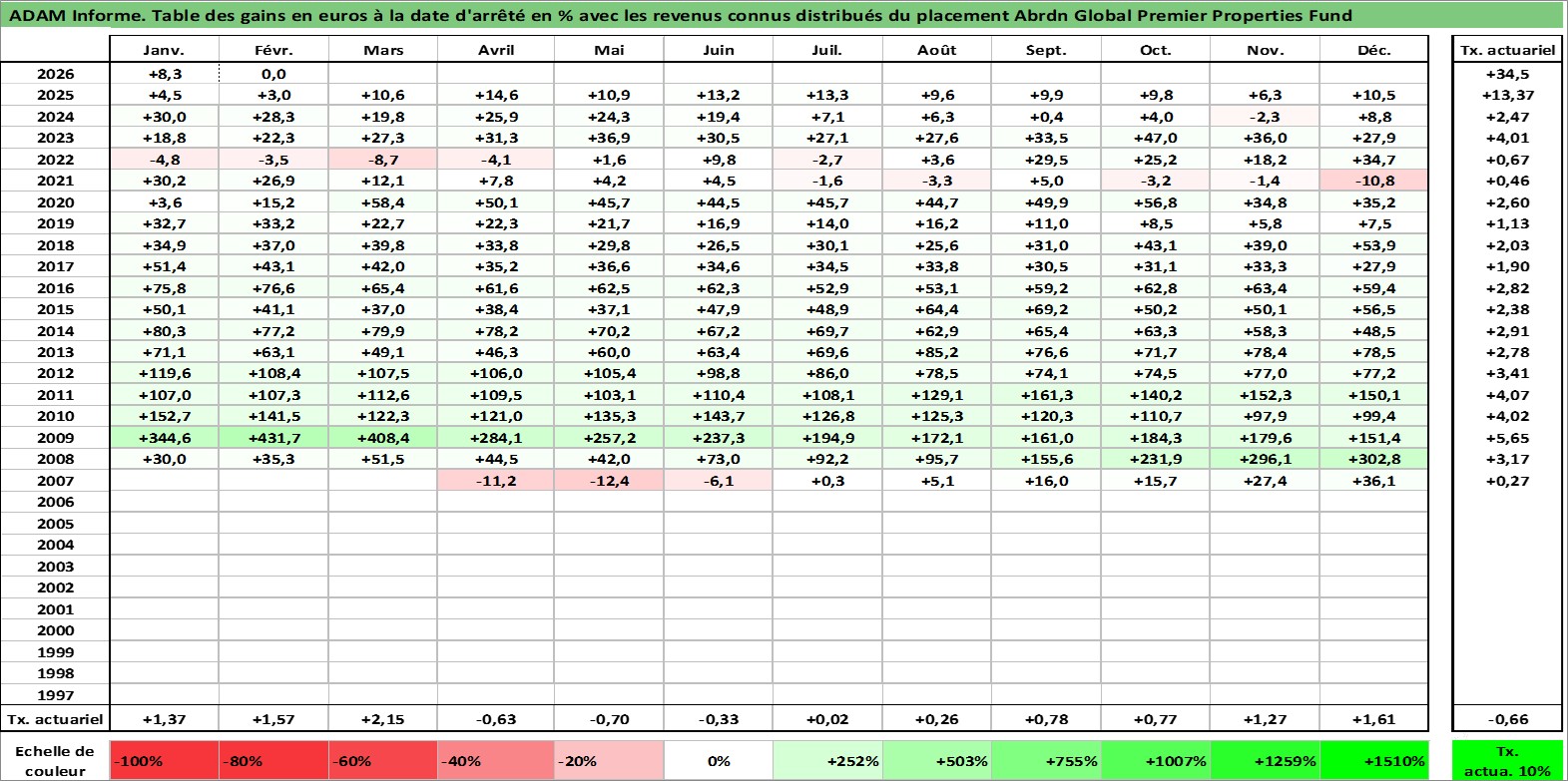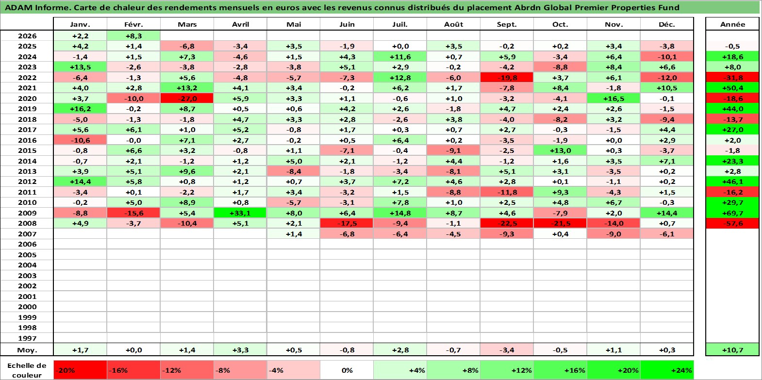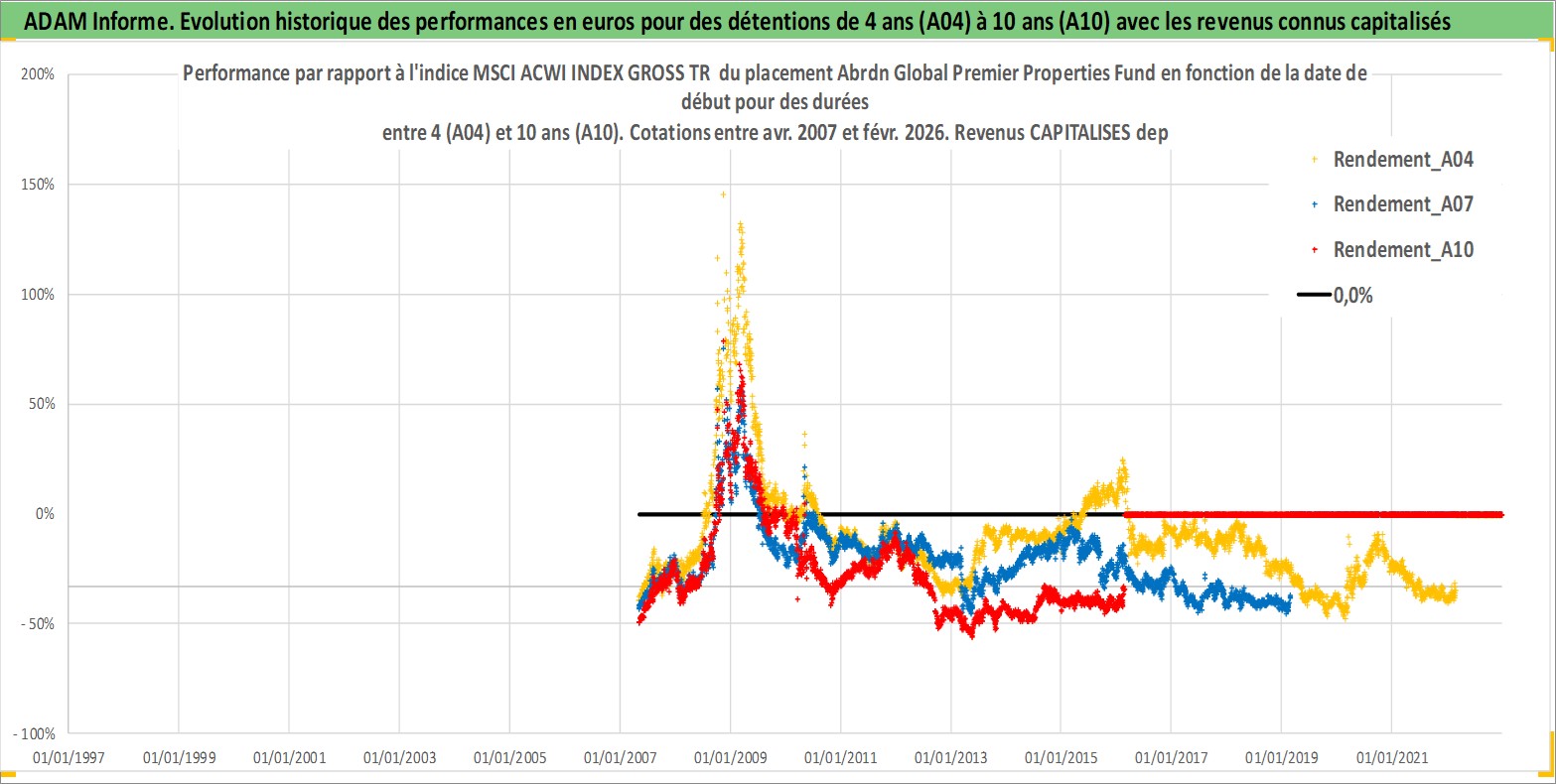 Site dédié aux investisseursPage dédiée sur site financeAnalyse des valorisations hebdomadaires de l'action Abrdn Global Premier Properties Fund. Cet actif est cote en USD. Les valorisations sont en contrevaleur EURO et couvrent les semaines 2007W17 a 2026W09. Les revenus de cet actif financier sont pris en compte depuis la semaine 2007W24. La note globale ESG de cet actif est estimee a 13.0 (apres rebasage entre 0 et 20).