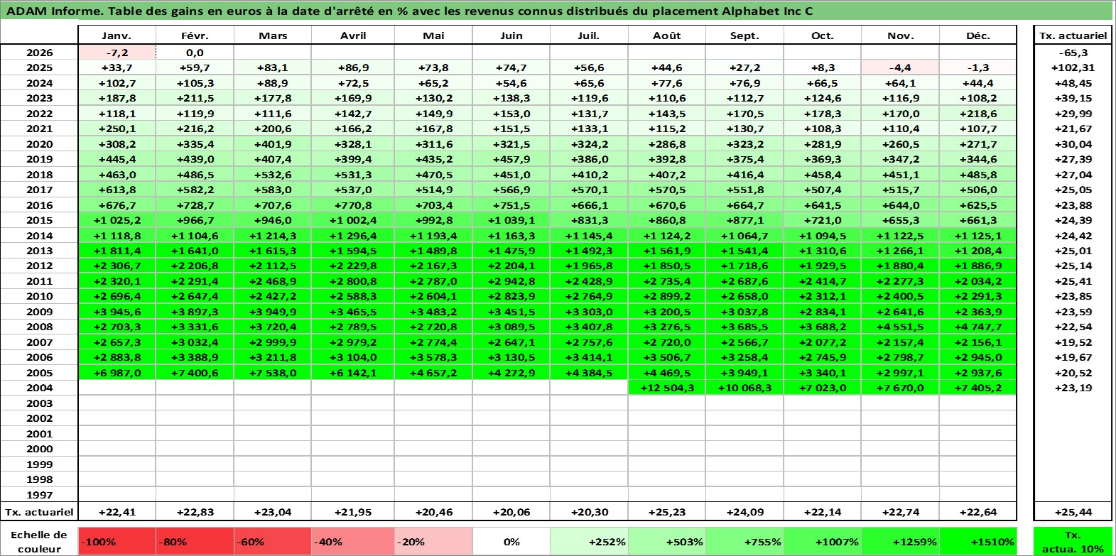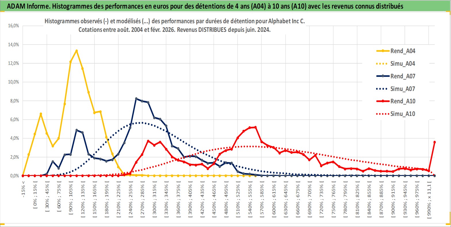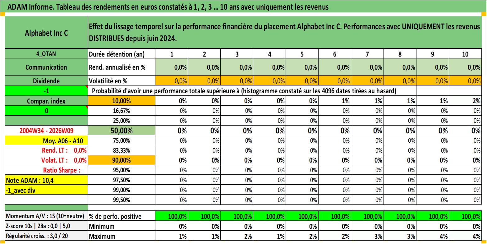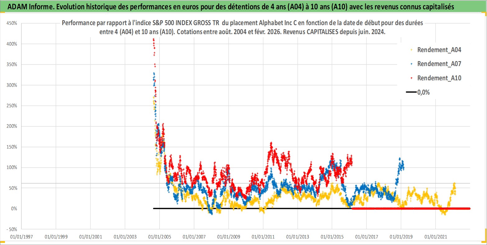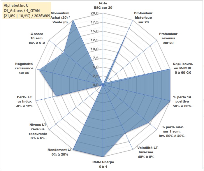 Site dédié aux investisseursPage dédiée sur site financeAnalyse des valorisations hebdomadaires de l'action Alphabet Inc C. Cet actif est cote en USD. Les valorisations sont en contrevaleur EURO et couvrent les semaines 2004W34 a 2026W09. Les revenus de cet actif financier sont pris en compte depuis la semaine 2024W24. La note ESG de cet actif n'est pas connue.