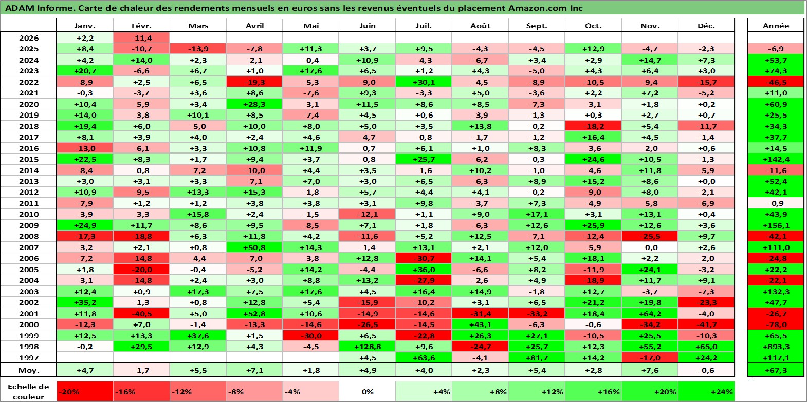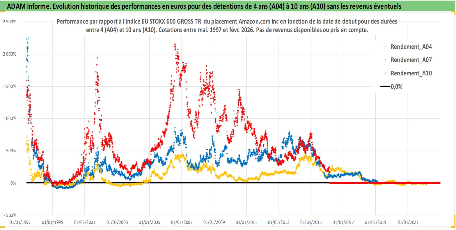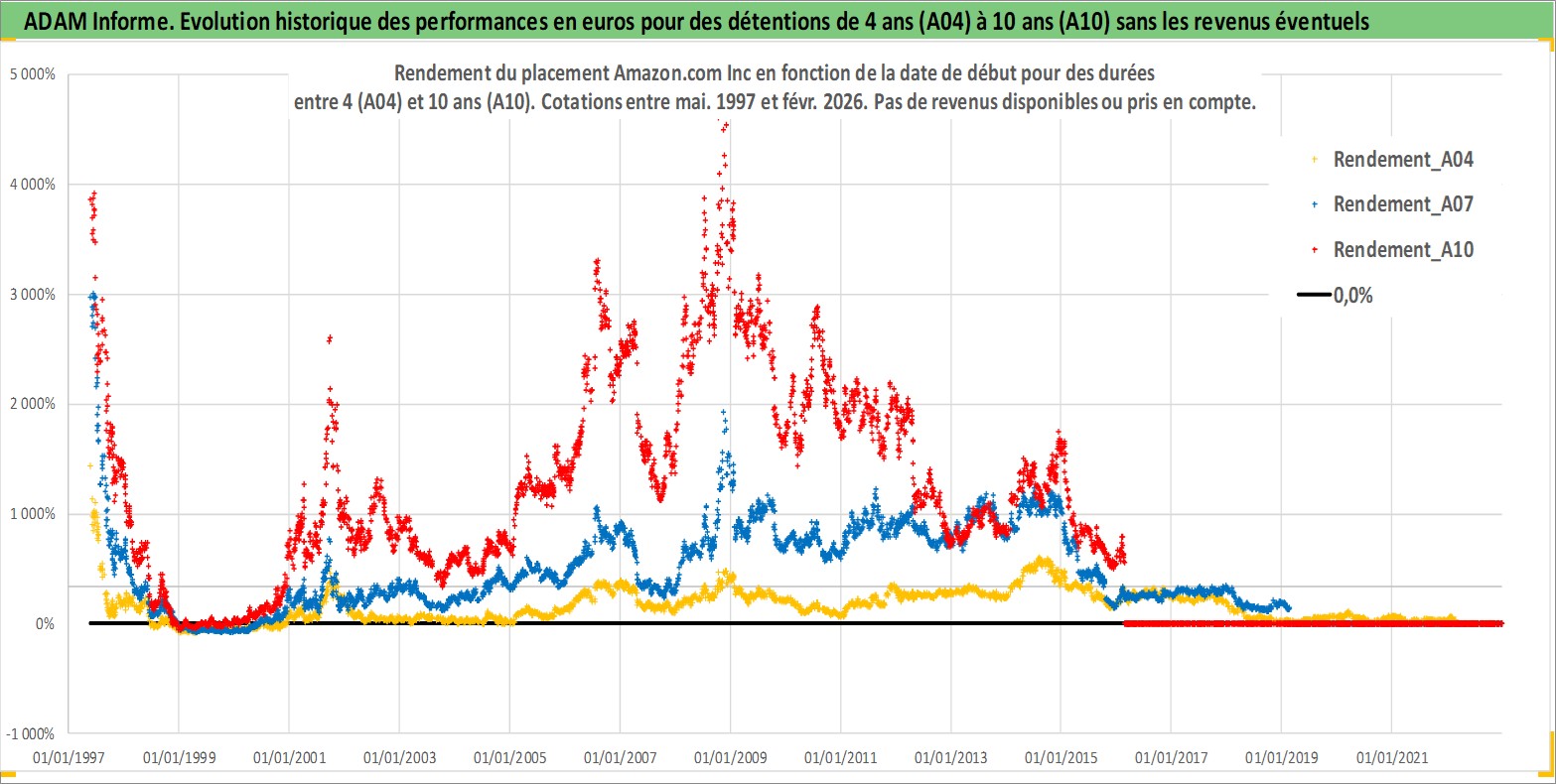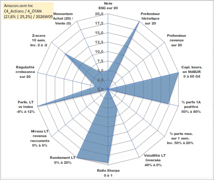 Site dédié aux investisseursPage dédiée sur site financeAnalyse des valorisations hebdomadaires de l'action Amazon.com Inc. Cet actif est cote en USD. Les valorisations sont en contrevaleur EURO et couvrent les semaines 1997W20 a 2026W09. Les revenus de cet actif financier ne sont pas connus car non existants ou non disponibles sur le site Yahoo Finance. La note globale ESG de cet actif est estimee a 5.0 (apres rebasage entre 0 et 20).