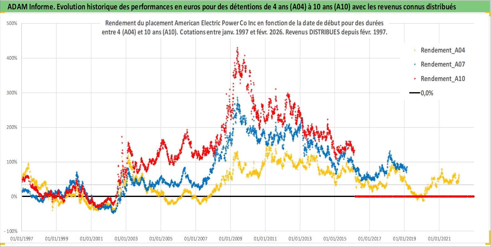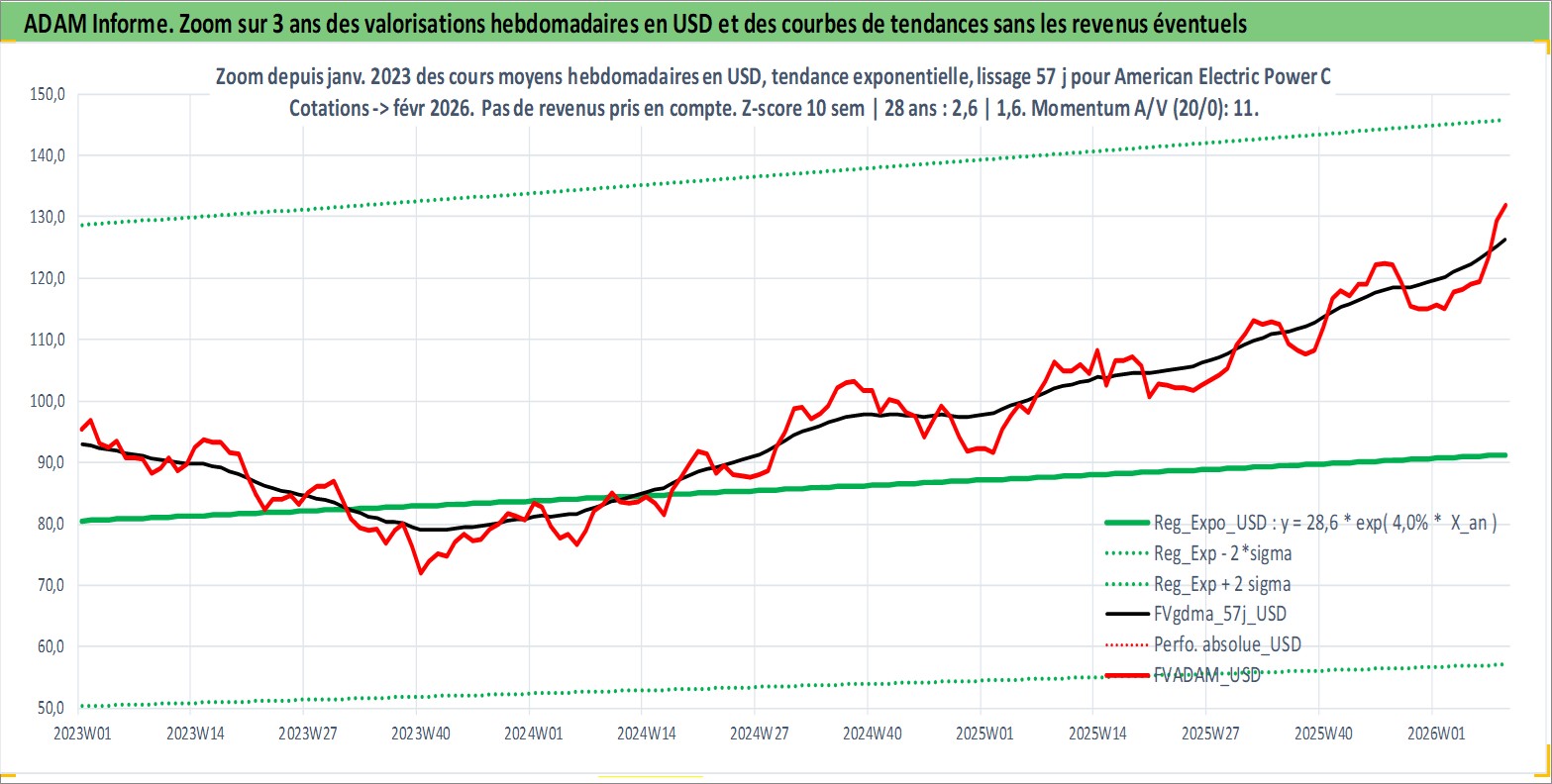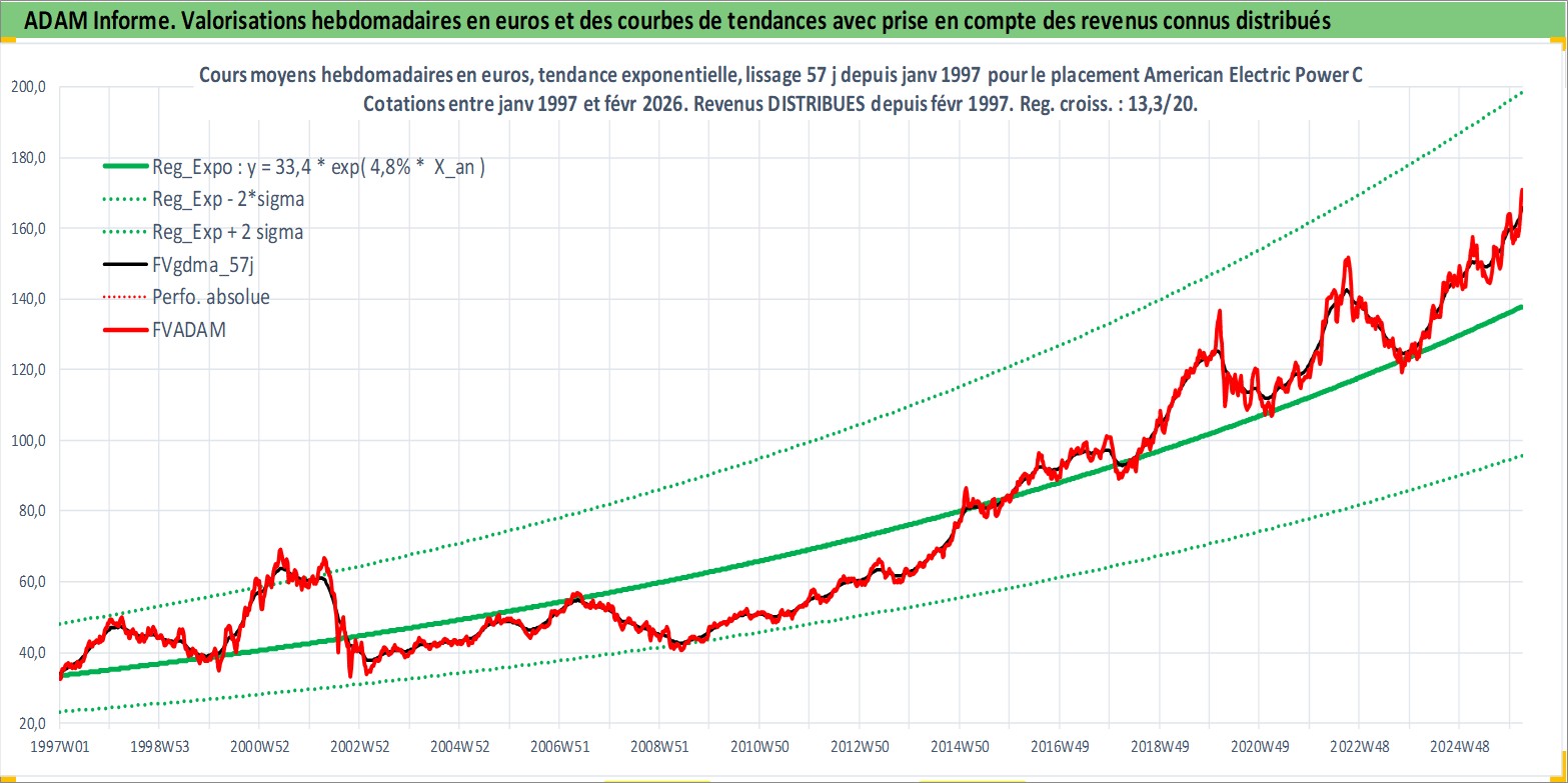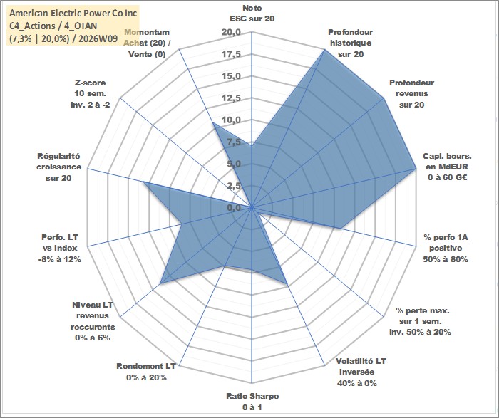 Site dédié aux investisseursPage dédiée sur site financeAnalyse des valorisations hebdomadaires de l'action American Electric Power Co Inc. Cet actif est cote en USD. Les valorisations sont en contrevaleur EURO et couvrent les semaines 1997W01 a 2026W09. Les revenus de cet actif financier sont pris en compte depuis la semaine 1997W06. La note globale ESG de cet actif est estimee a 7.0 (apres rebasage entre 0 et 20).