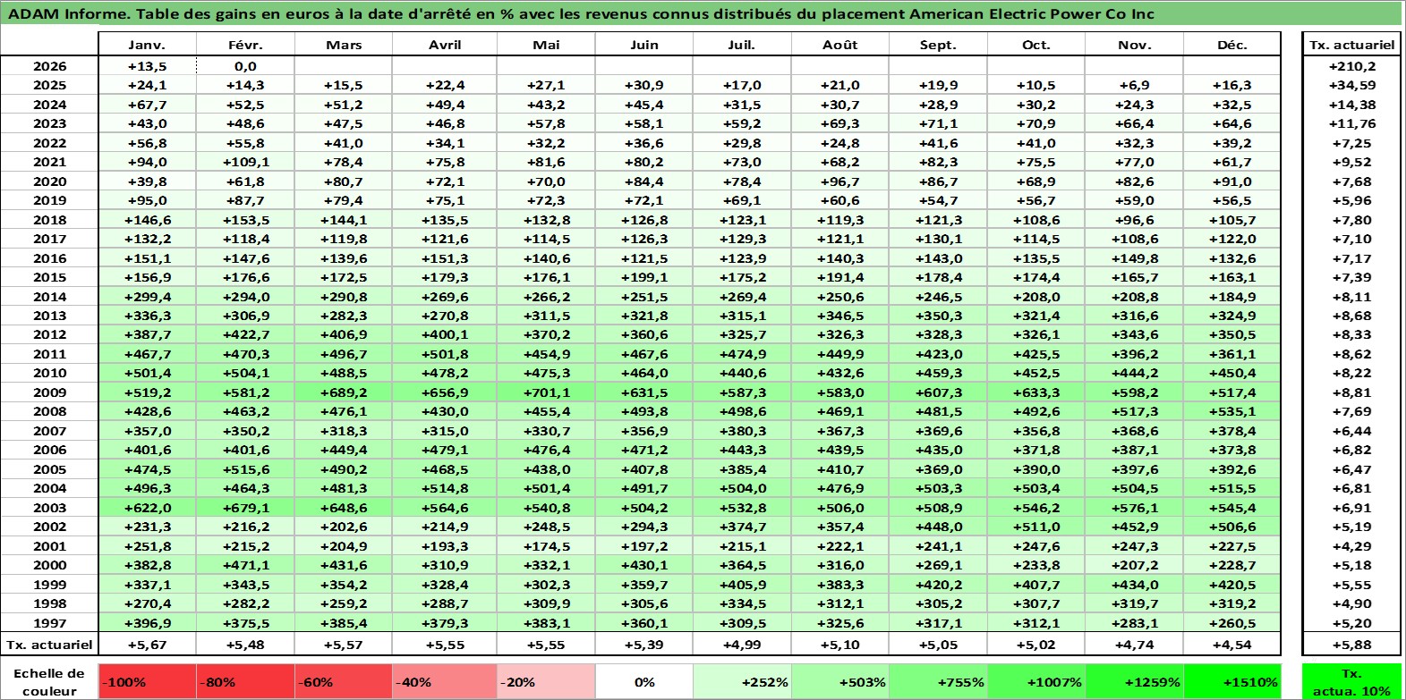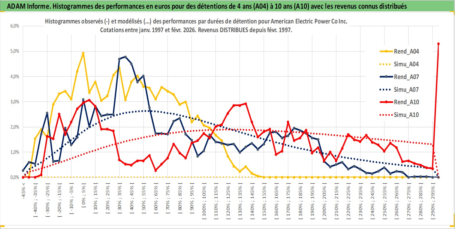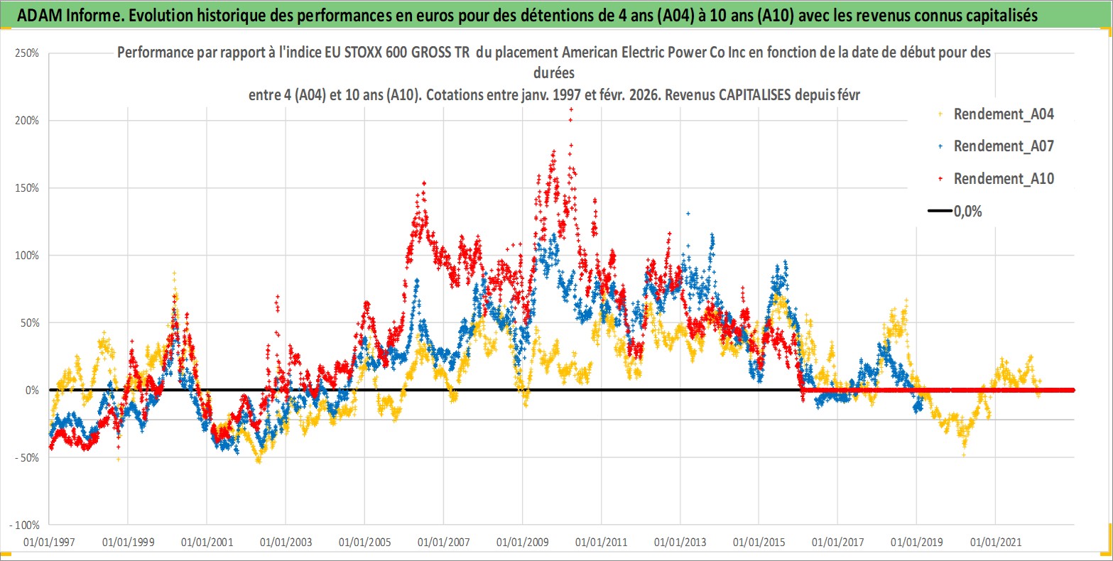Site dédié aux investisseursPage dédiée sur site financeAnalyse des valorisations hebdomadaires de l'action American Electric Power Co Inc. Cet actif est cote en USD. Les valorisations sont en contrevaleur EURO et couvrent les semaines 1997W01 a 2026W09. Les revenus de cet actif financier sont pris en compte depuis la semaine 1997W06. La note globale ESG de cet actif est estimee a 7.0 (apres rebasage entre 0 et 20).