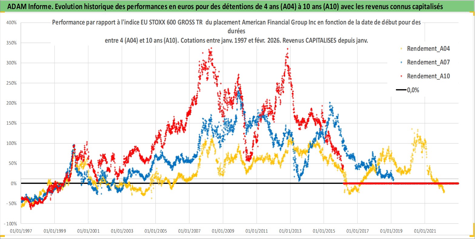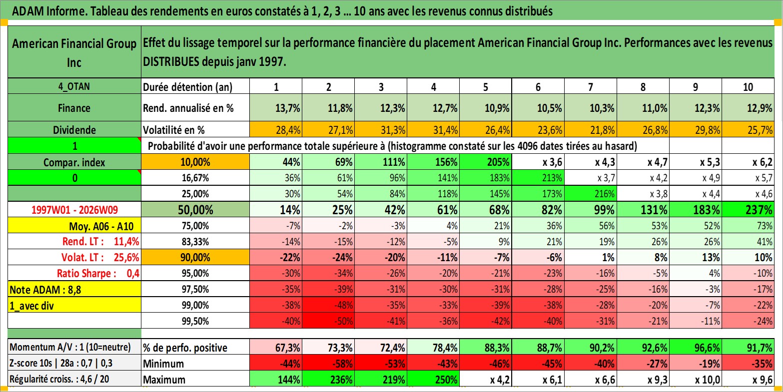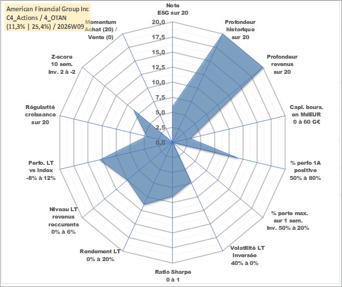 Site dédié aux investisseursPage dédiée sur site financeAnalyse des valorisations hebdomadaires de l'action American Financial Group Inc. Cet actif est cote en USD. Les valorisations sont en contrevaleur EURO et couvrent les semaines 1997W01 a 2026W09. Les revenus de cet actif financier sont pris en compte depuis la semaine 1997W03. La note globale ESG de cet actif est estimee a 6.0 (apres rebasage entre 0 et 20).