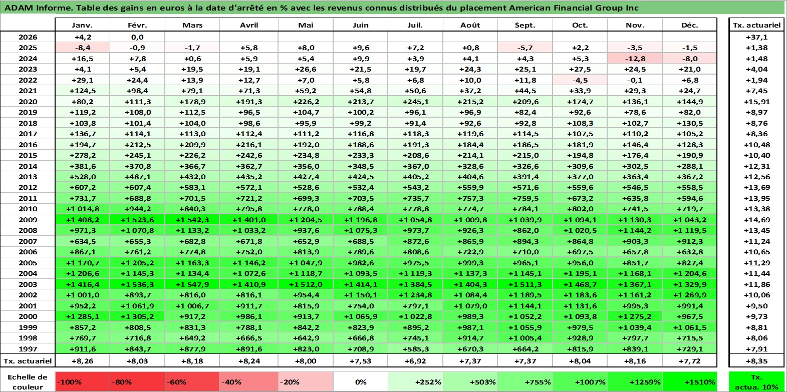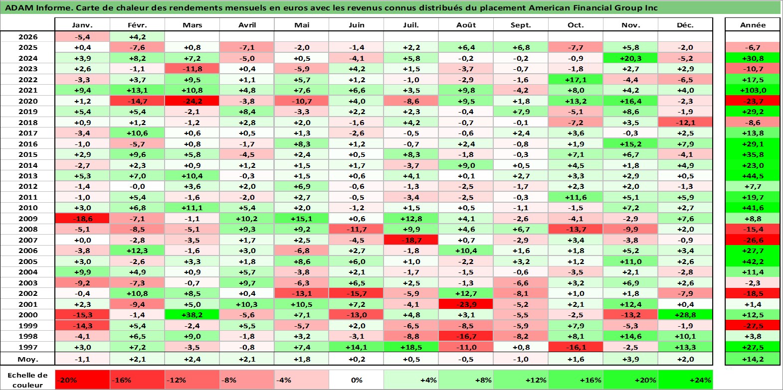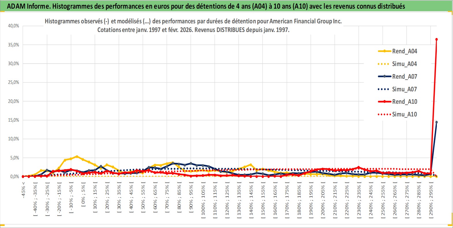 Site dédié aux investisseursPage dédiée sur site financeAnalyse des valorisations hebdomadaires de l'action American Financial Group Inc. Cet actif est cote en USD. Les valorisations sont en contrevaleur EURO et couvrent les semaines 1997W01 a 2026W09. Les revenus de cet actif financier sont pris en compte depuis la semaine 1997W03. La note globale ESG de cet actif est estimee a 6.0 (apres rebasage entre 0 et 20).