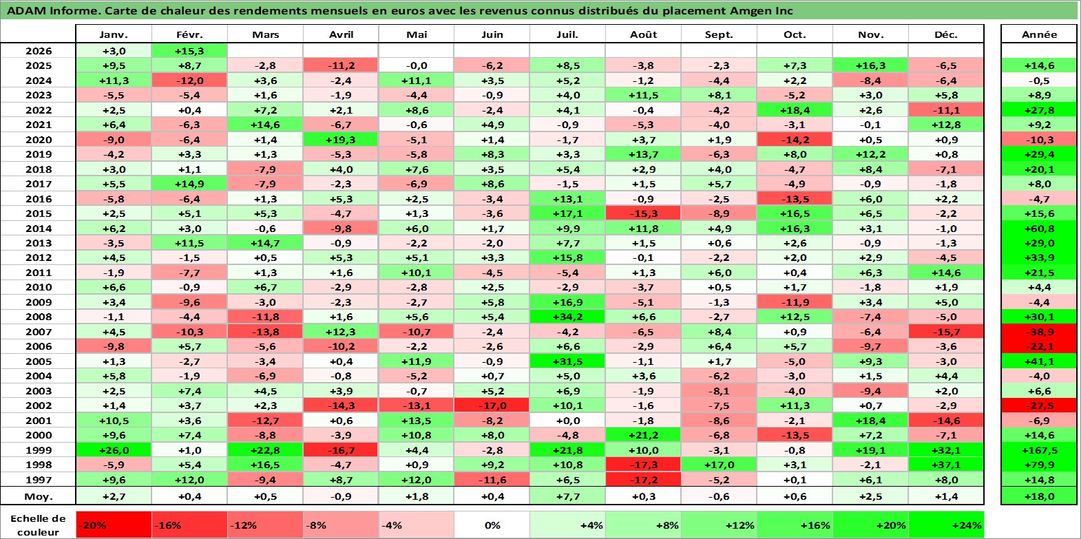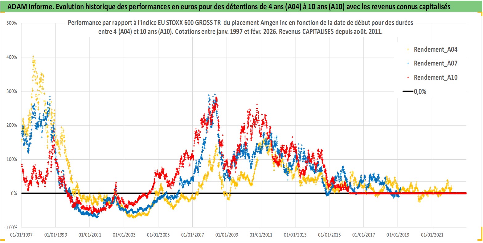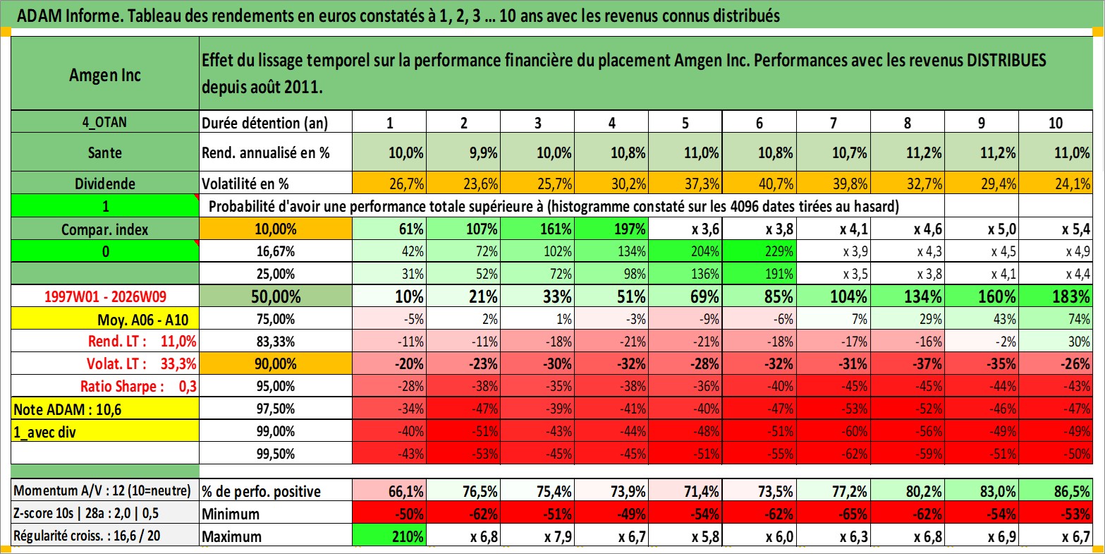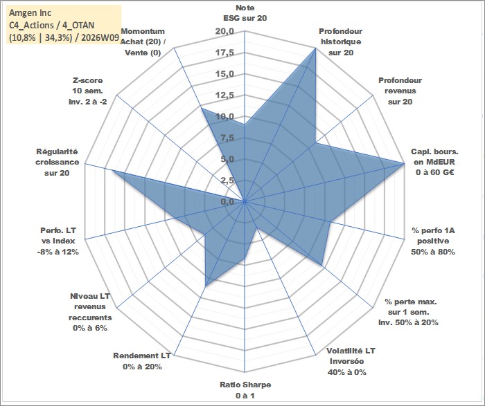 Site dédié aux investisseursPage dédiée sur site financeAnalyse des valorisations hebdomadaires de l'action Amgen Inc. Cet actif est cote en USD. Les valorisations sont en contrevaleur EURO et couvrent les semaines 1997W01 a 2026W09. Les revenus de cet actif financier sont pris en compte depuis la semaine 2011W33. La note globale ESG de cet actif est estimee a 9.0 (apres rebasage entre 0 et 20).