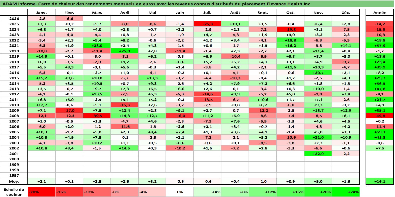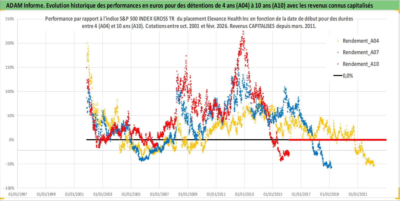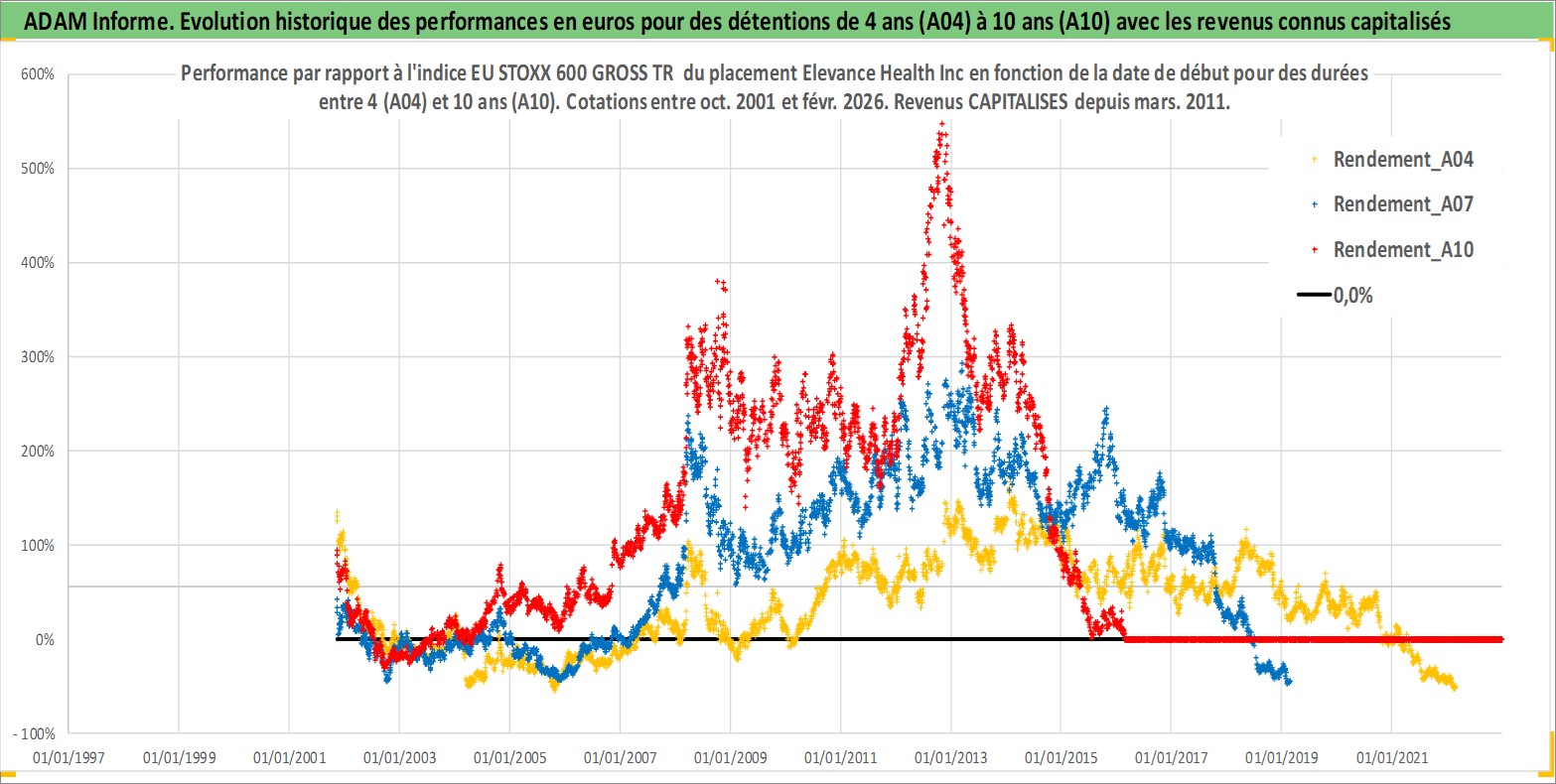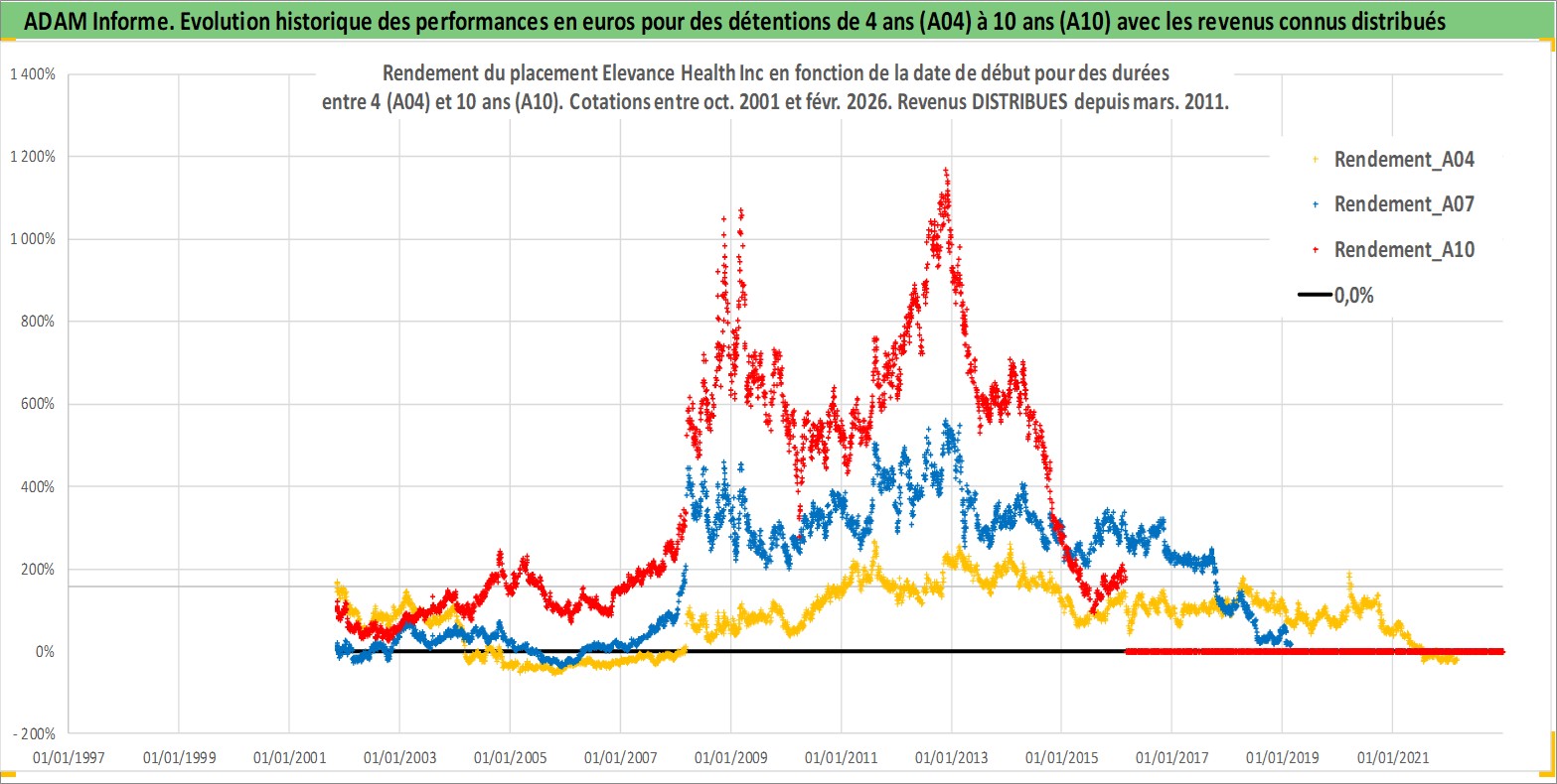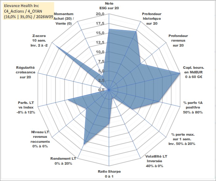 Site dédié aux investisseursPage dédiée sur site financeAnalyse des valorisations hebdomadaires de l'action Elevance Health Inc. Cet actif est cote en USD. Les valorisations sont en contrevaleur EURO et couvrent les semaines 2001W44 a 2026W09. Les revenus de cet actif financier sont pris en compte depuis la semaine 2011W10. La note globale ESG de cet actif est estimee a 16.0 (apres rebasage entre 0 et 20).