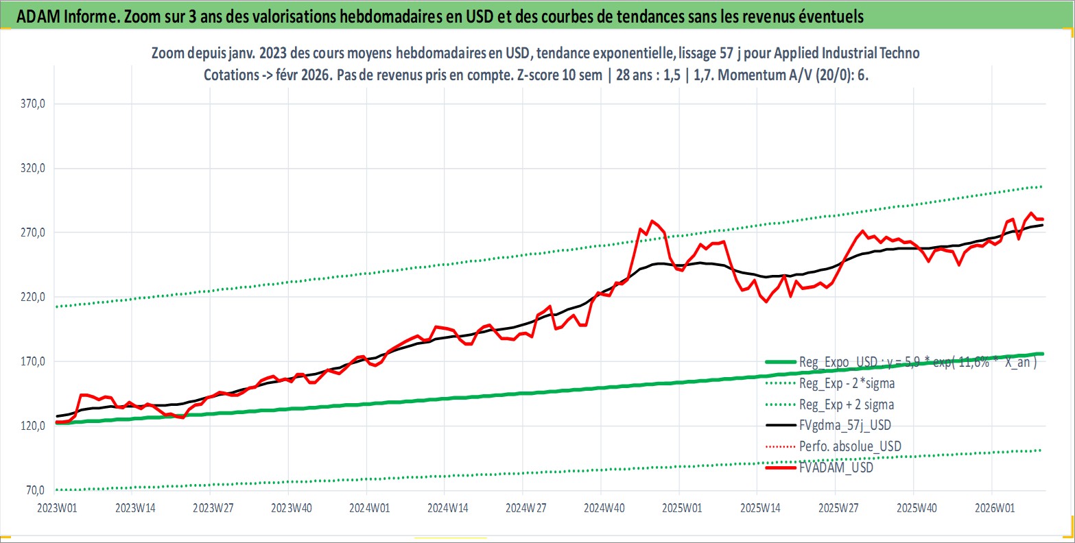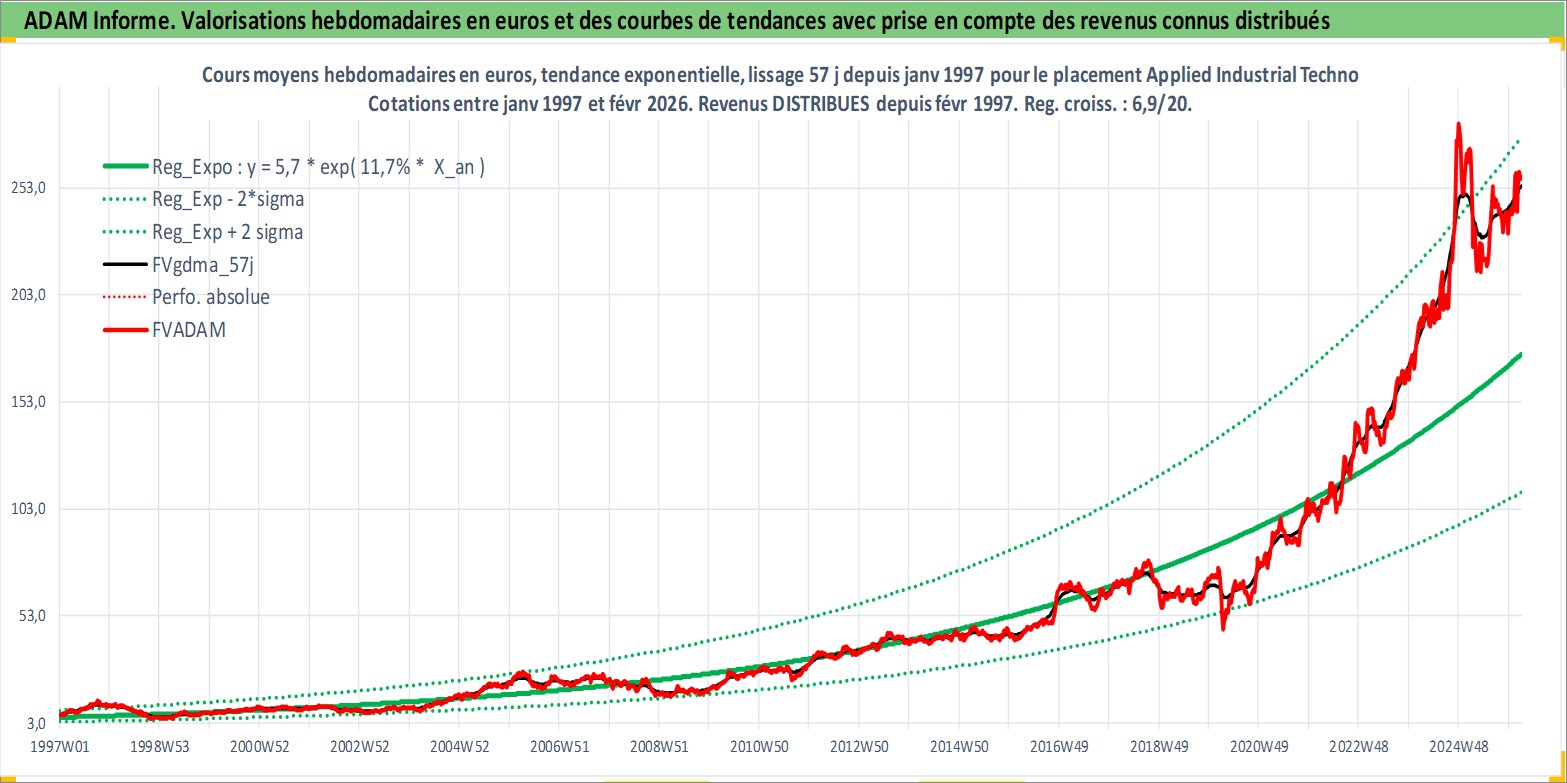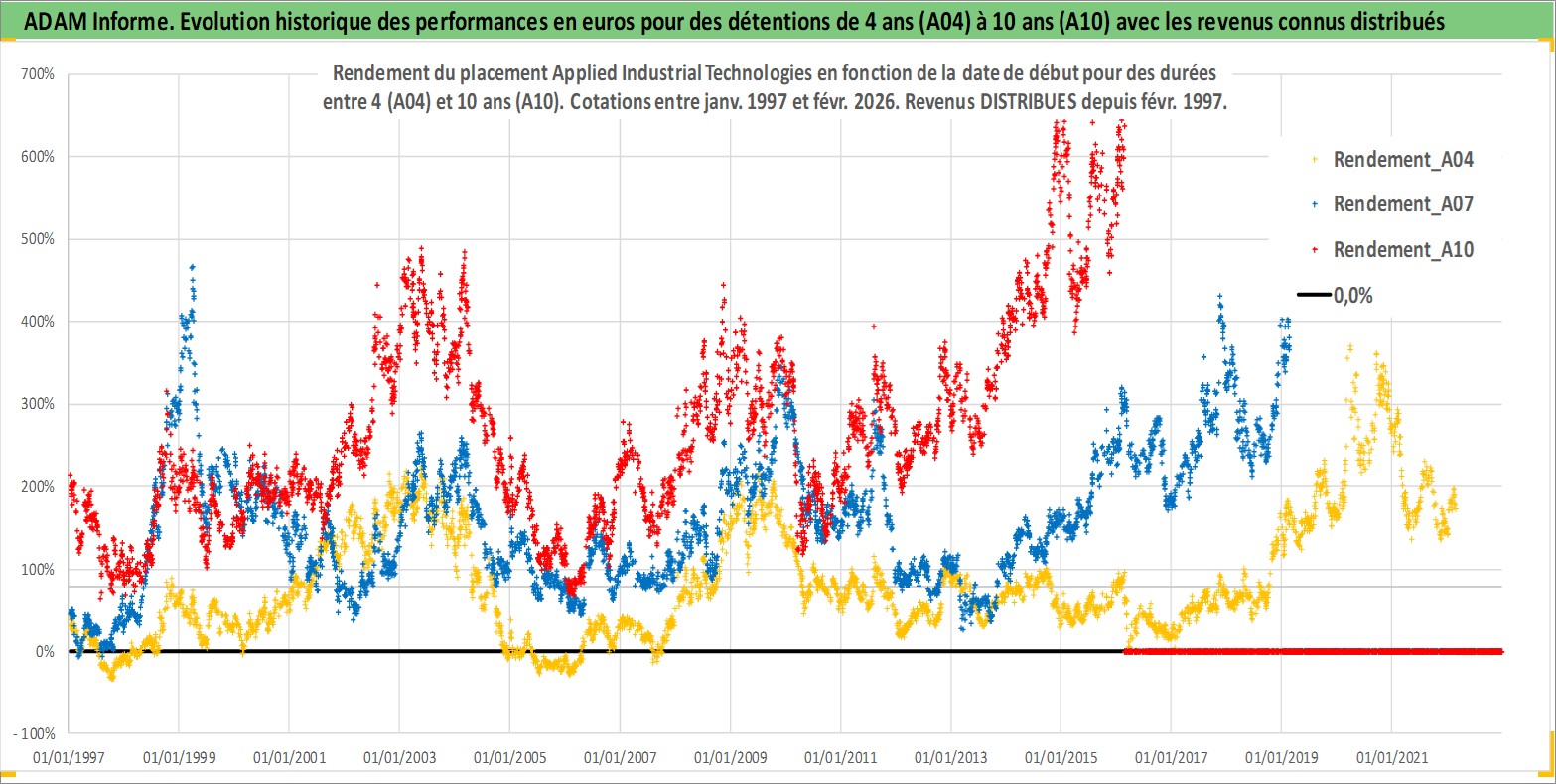 Site dédié aux investisseursPage dédiée sur site financeAnalyse des valorisations hebdomadaires de l'action Applied Industrial Technologies. Cet actif est cote en USD. Les valorisations sont en contrevaleur EURO et couvrent les semaines 1997W01 a 2026W09. Les revenus de cet actif financier sont pris en compte depuis la semaine 1997W07. La note ESG de cet actif n'est pas connue.