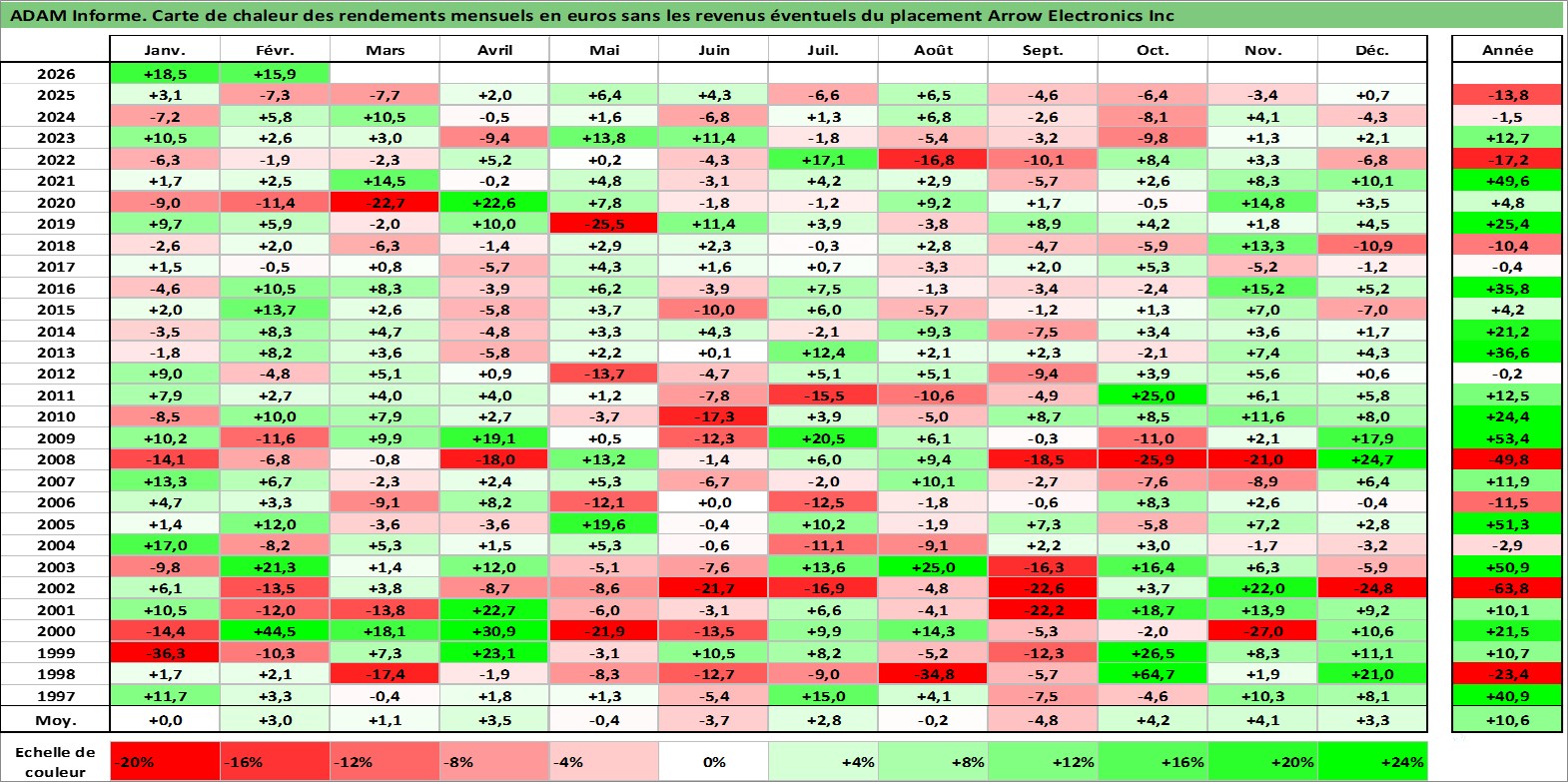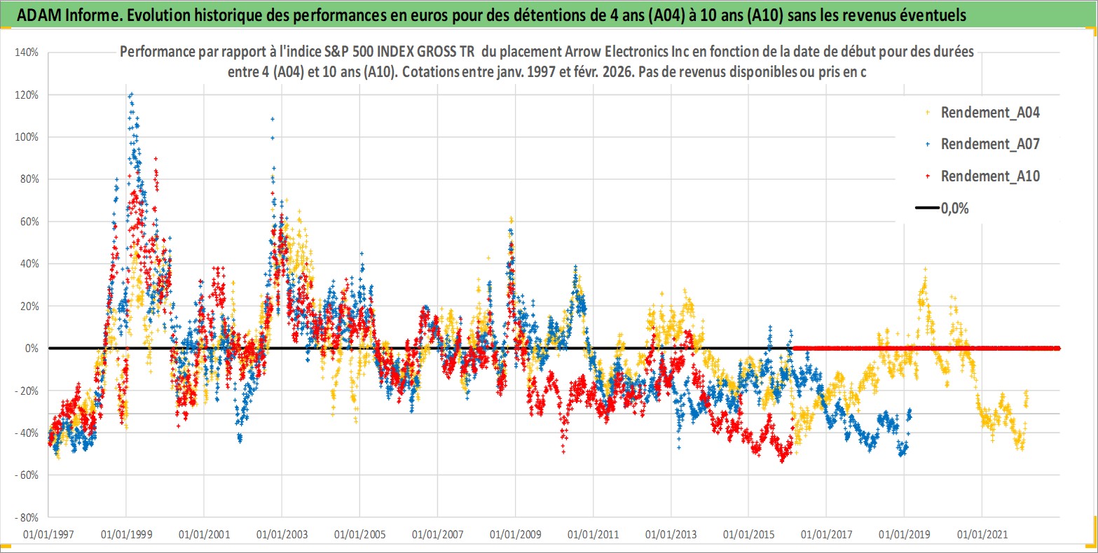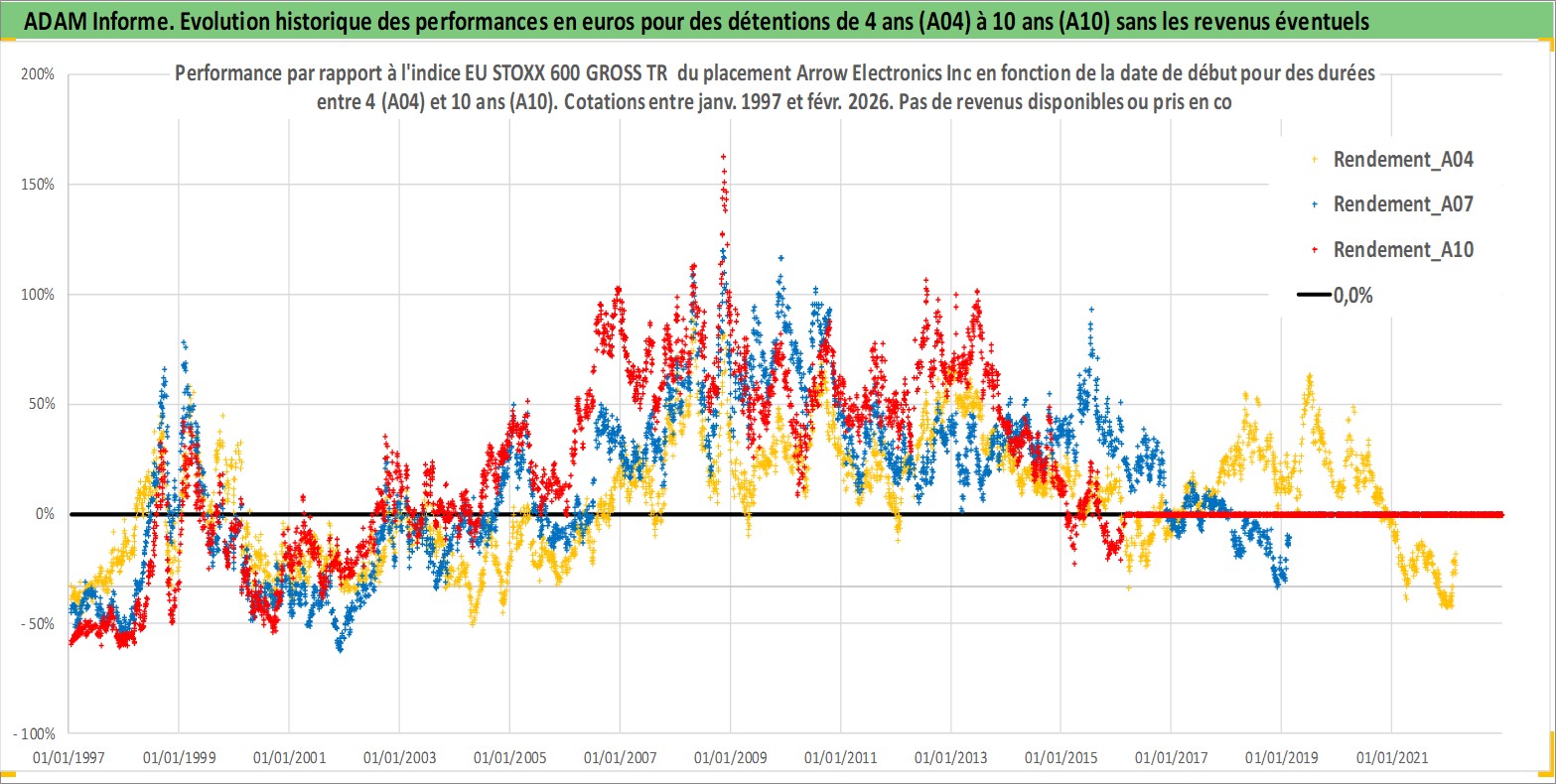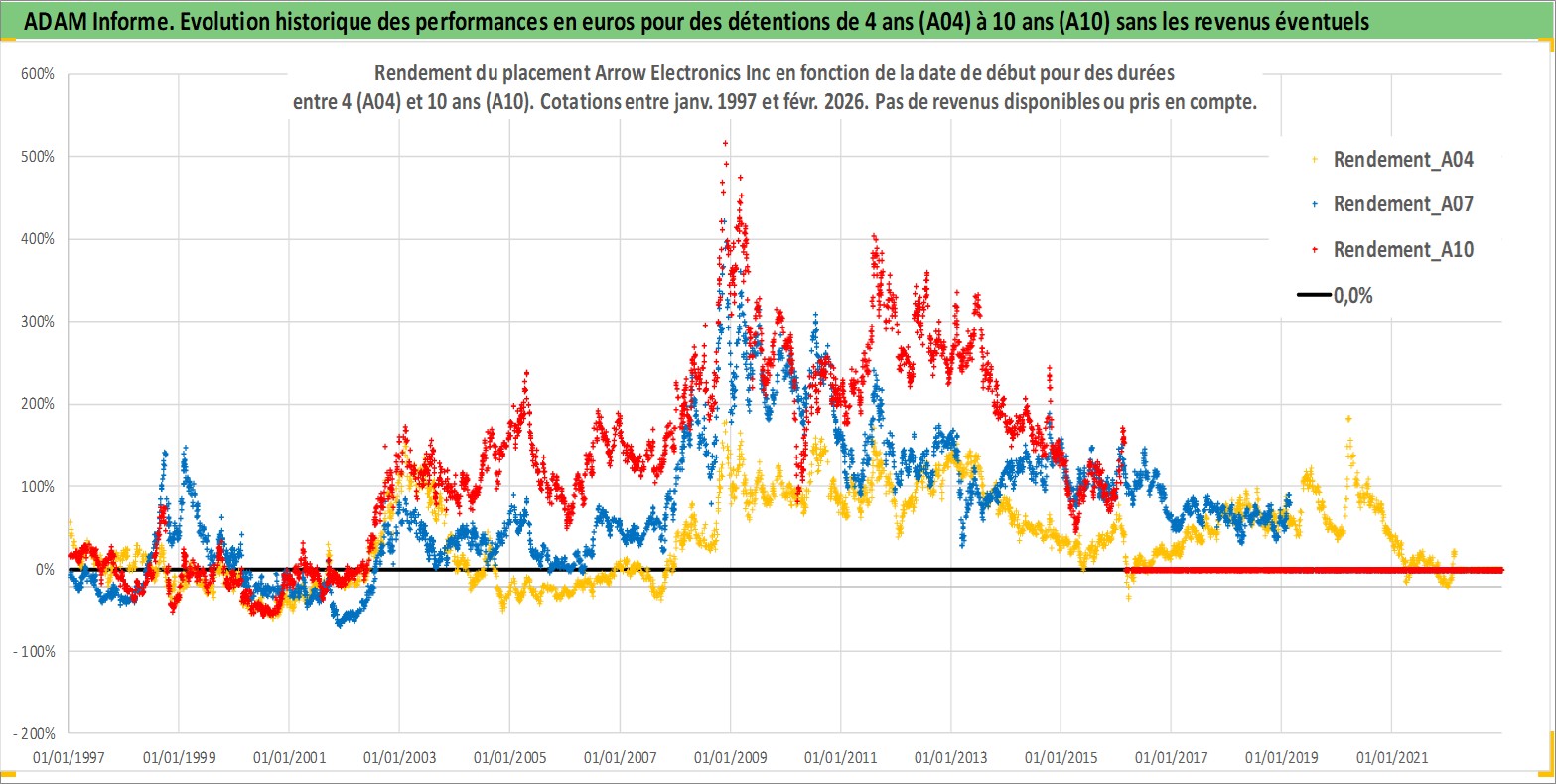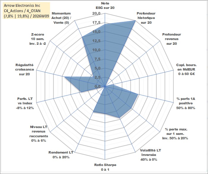 Site dédié aux investisseursPage dédiée sur site financeAnalyse des valorisations hebdomadaires de l'action Arrow Electronics Inc. Cet actif est cote en USD. Les valorisations sont en contrevaleur EURO et couvrent les semaines 1997W01 a 2026W09. Les revenus de cet actif financier ne sont pas connus car non existants ou non disponibles sur le site Yahoo Finance. La note globale ESG de cet actif est estimee a 17.0 (apres rebasage entre 0 et 20).