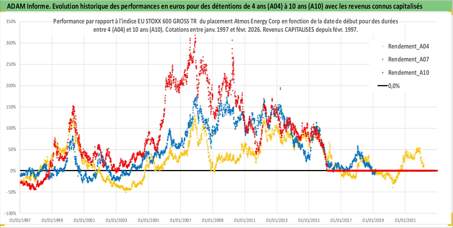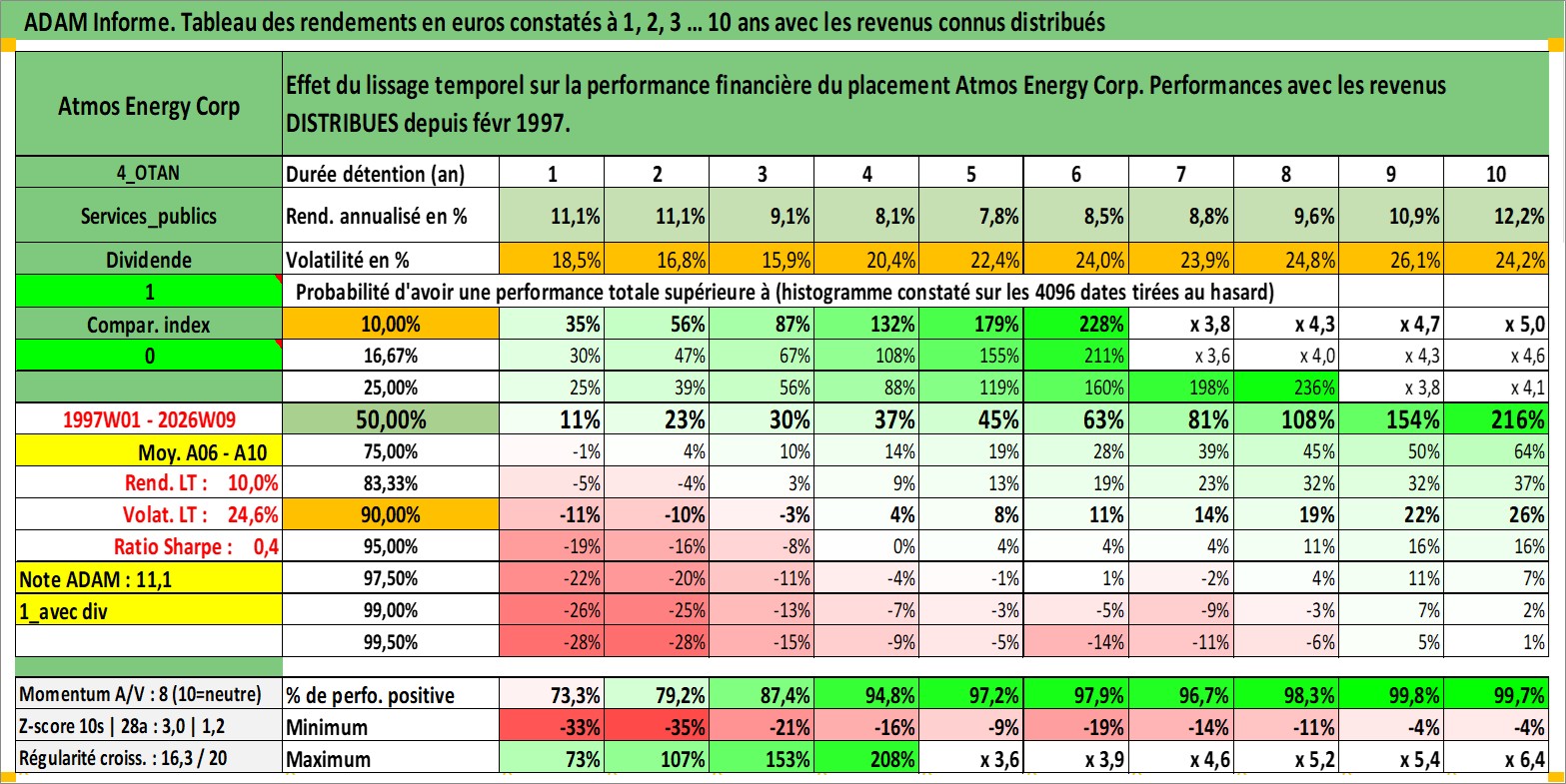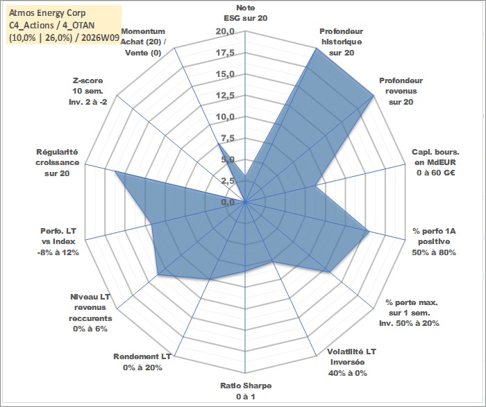 Site dédié aux investisseursPage dédiée sur site financeAnalyse des valorisations hebdomadaires de l'action Atmos Energy Corp. Cet actif est cote en USD. Les valorisations sont en contrevaleur EURO et couvrent les semaines 1997W01 a 2026W09. Les revenus de cet actif financier sont pris en compte depuis la semaine 1997W08. La note globale ESG de cet actif est estimee a 3.0 (apres rebasage entre 0 et 20).