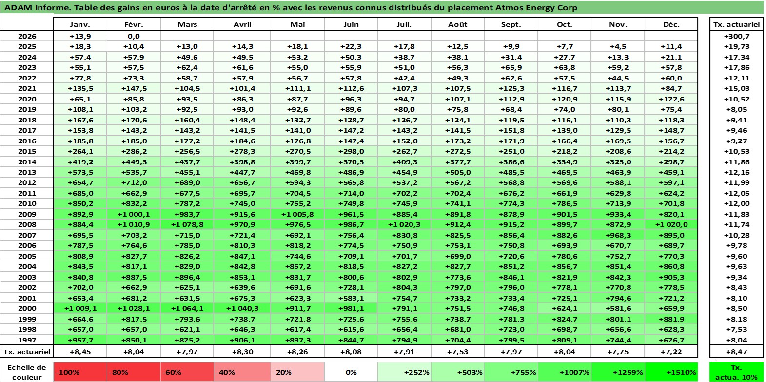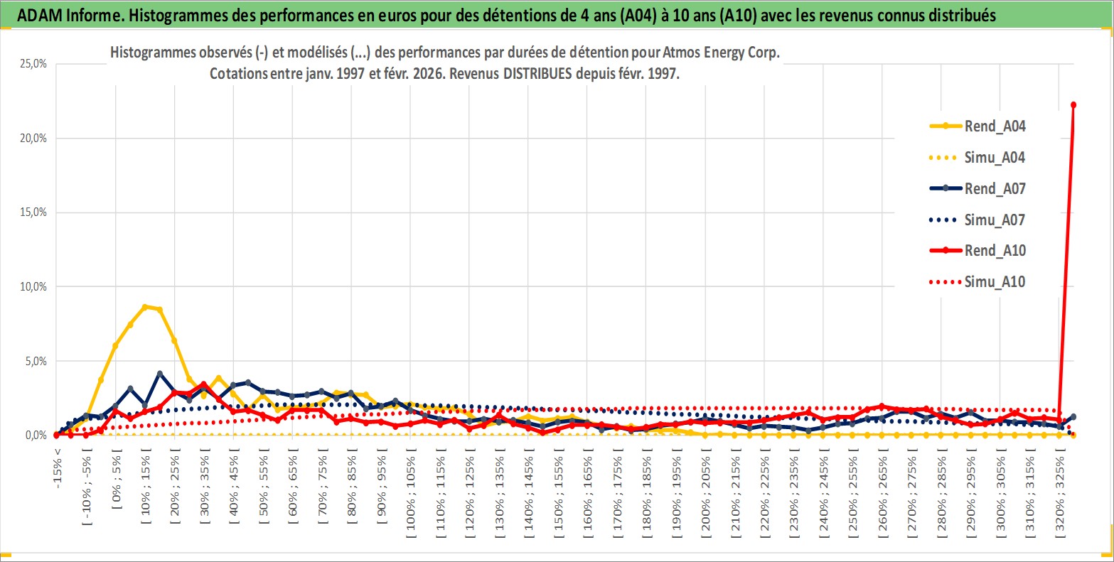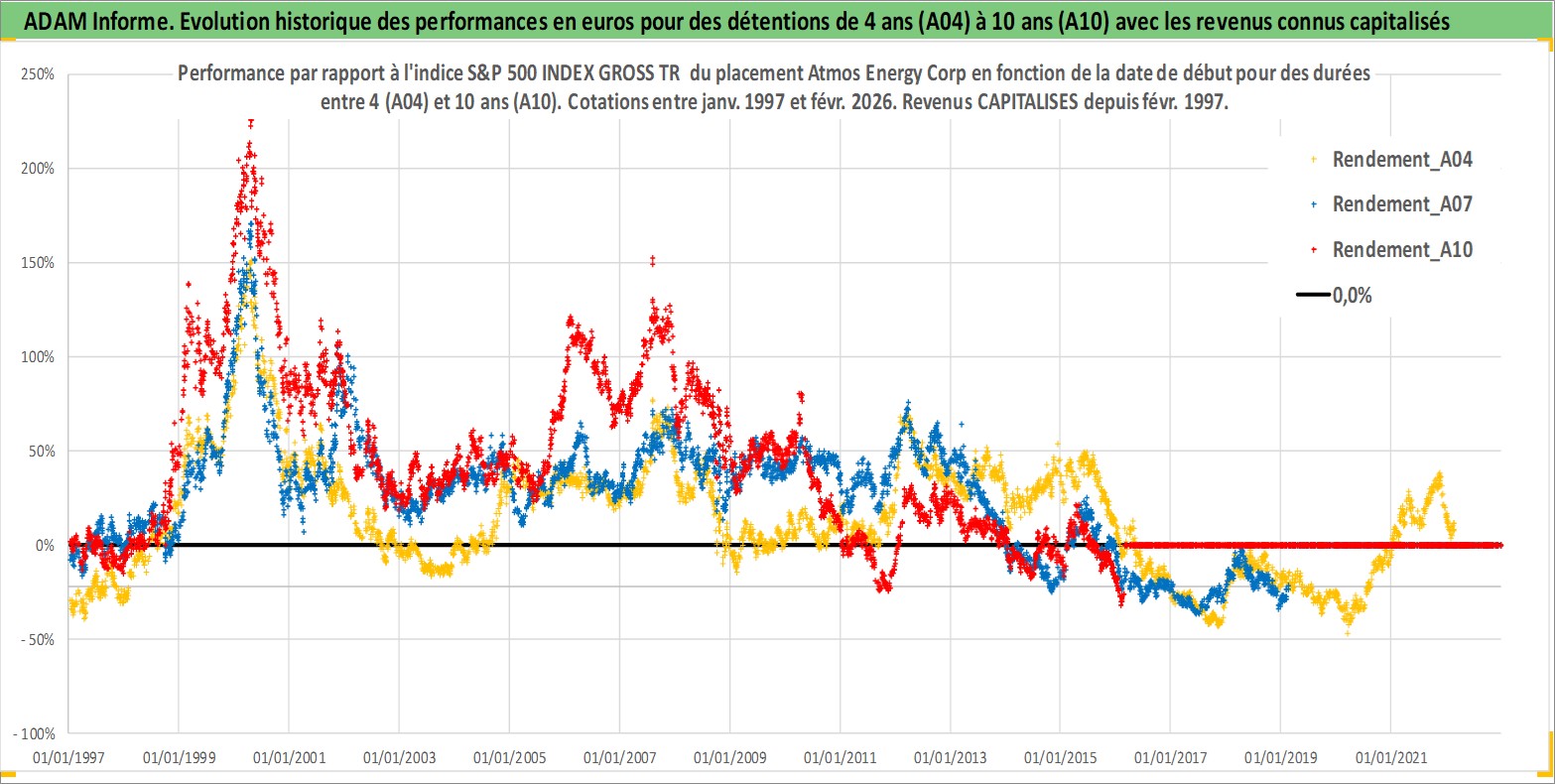 Site dédié aux investisseursPage dédiée sur site financeAnalyse des valorisations hebdomadaires de l'action Atmos Energy Corp. Cet actif est cote en USD. Les valorisations sont en contrevaleur EURO et couvrent les semaines 1997W01 a 2026W09. Les revenus de cet actif financier sont pris en compte depuis la semaine 1997W08. La note globale ESG de cet actif est estimee a 3.0 (apres rebasage entre 0 et 20).