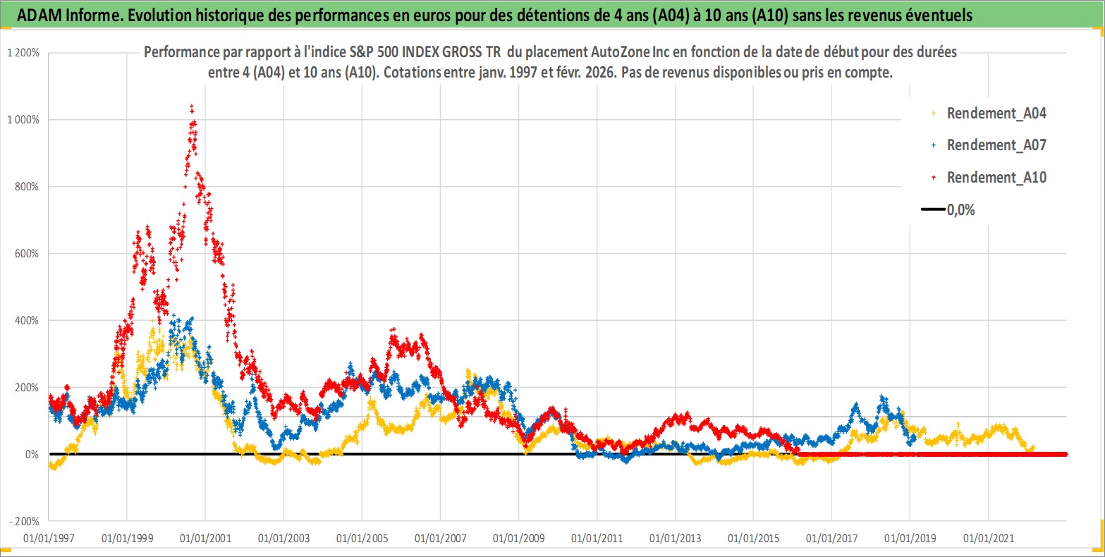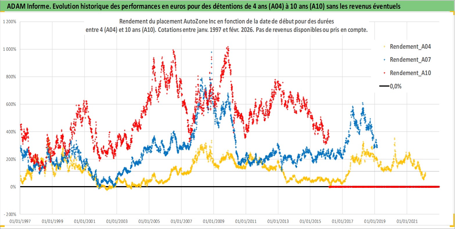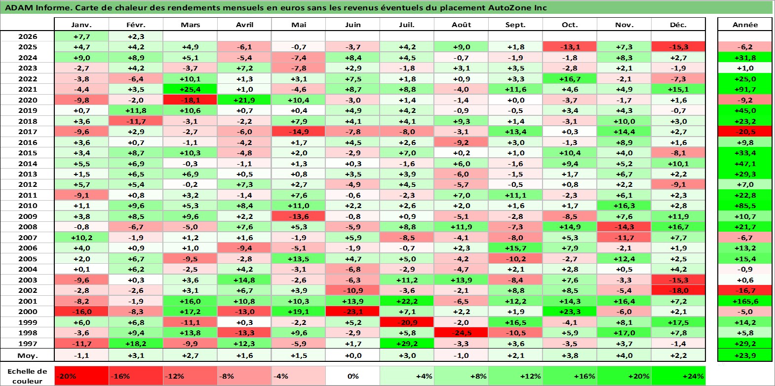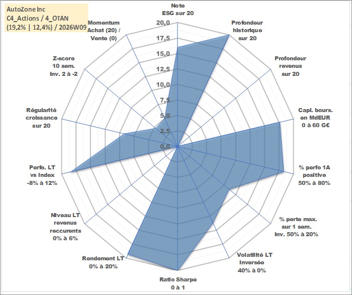 Site dédié aux investisseursPage dédiée sur site financeAnalyse des valorisations hebdomadaires de l'action AutoZone Inc. Cet actif est cote en USD. Les valorisations sont en contrevaleur EURO et couvrent les semaines 1997W01 a 2026W09. Les revenus de cet actif financier ne sont pas connus car non existants ou non disponibles sur le site Yahoo Finance. La note globale ESG de cet actif est estimee a 16.0 (apres rebasage entre 0 et 20).