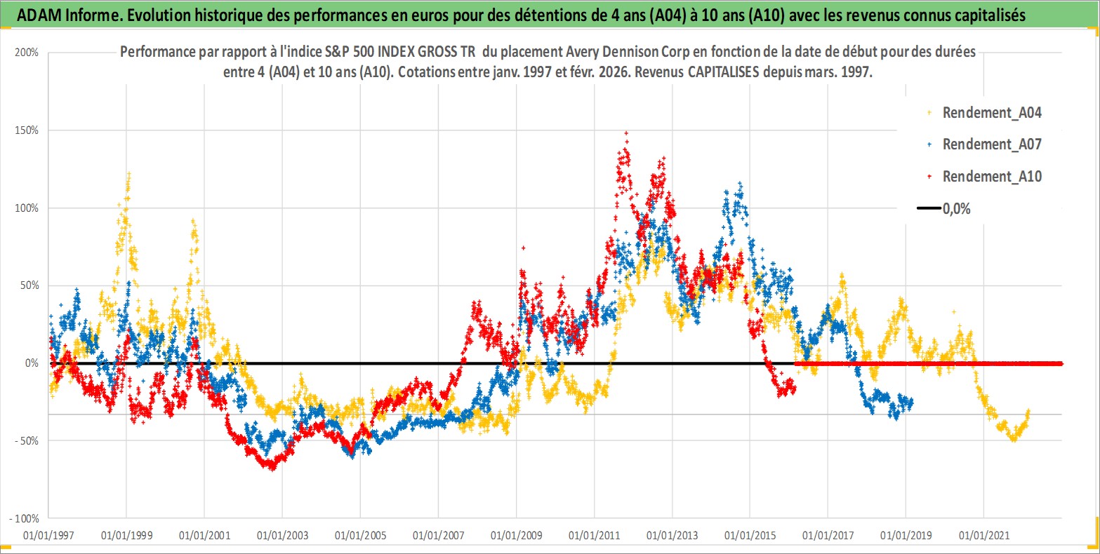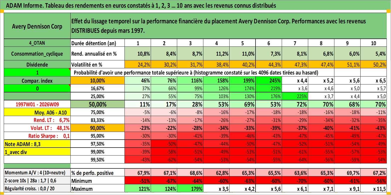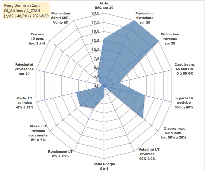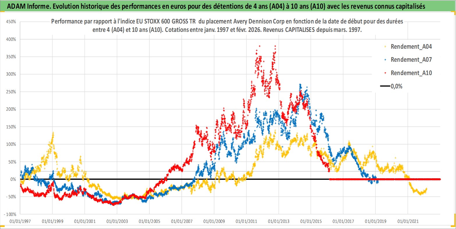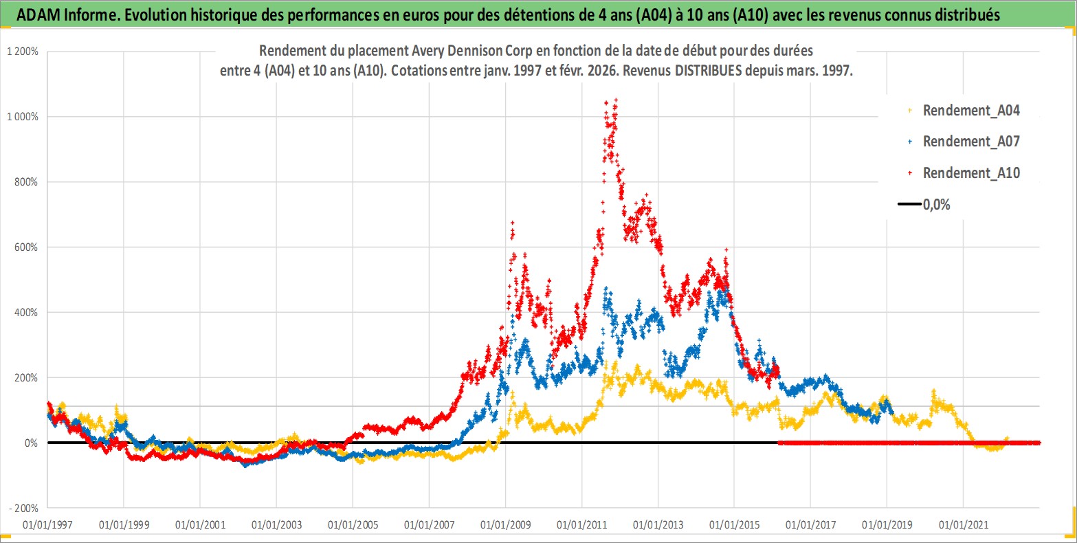 Site dédié aux investisseursPage dédiée sur site financeAnalyse des valorisations hebdomadaires de l'action Avery Dennison Corp. Cet actif est cote en USD. Les valorisations sont en contrevaleur EURO et couvrent les semaines 1997W01 a 2026W09. Les revenus de cet actif financier sont pris en compte depuis la semaine 1997W10. La note globale ESG de cet actif est estimee a 13.0 (apres rebasage entre 0 et 20).