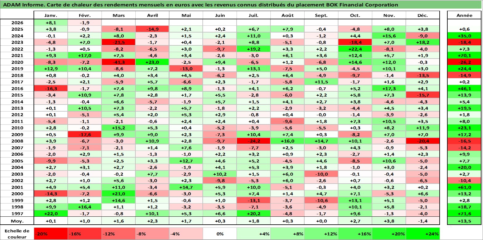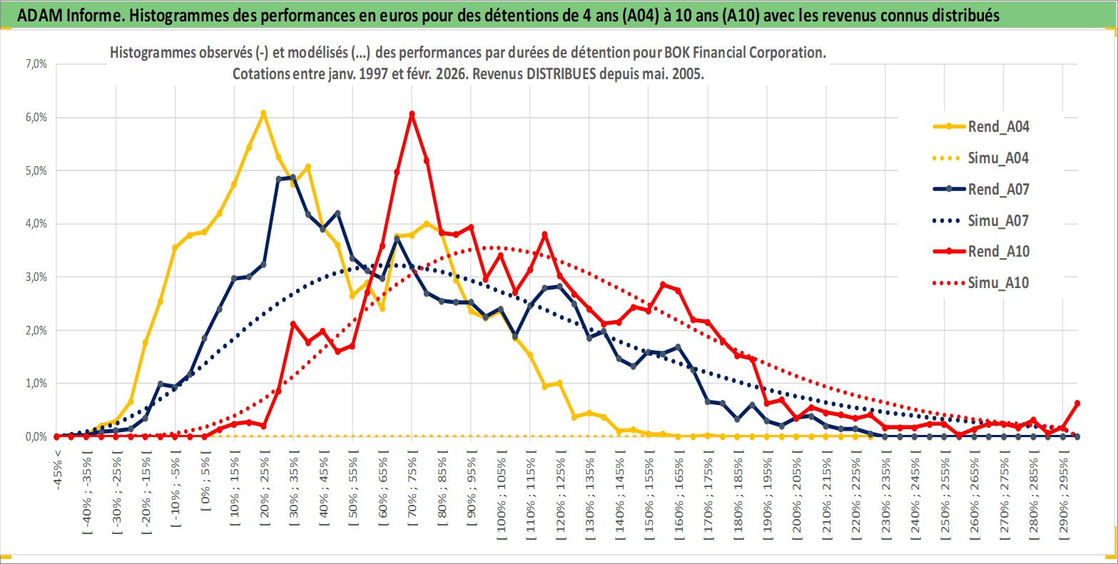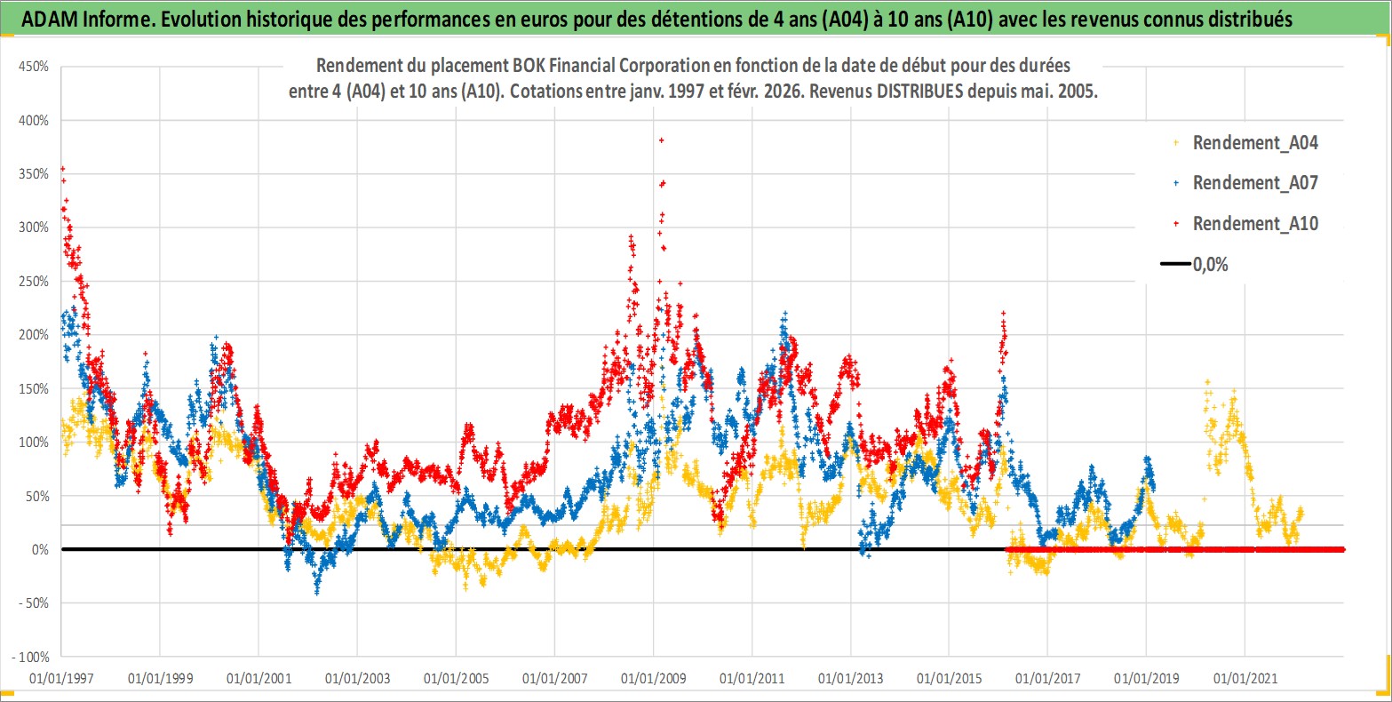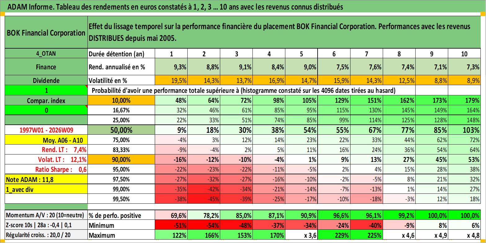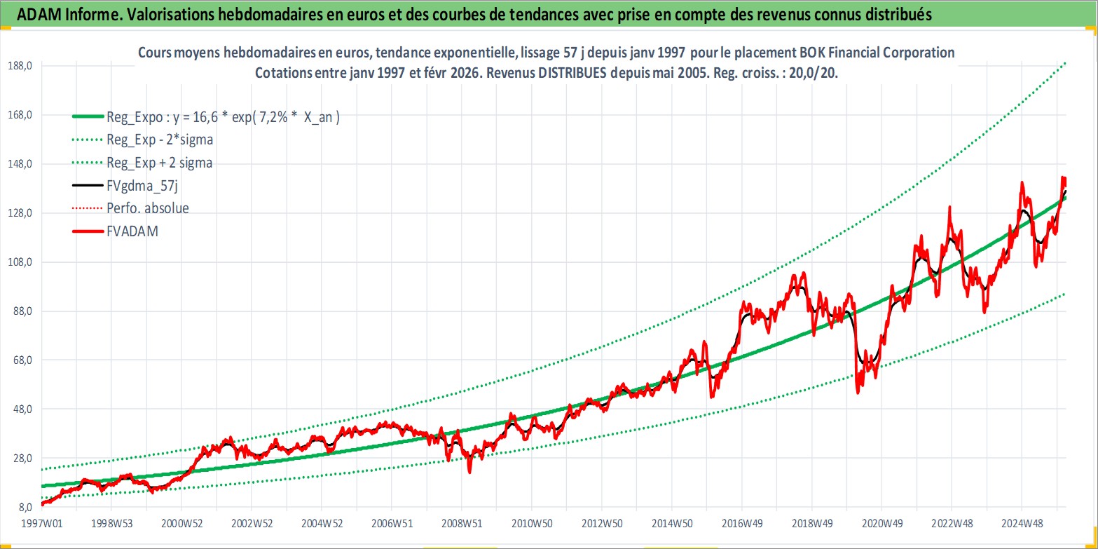 Site dédié aux investisseursPage dédiée sur site financeAnalyse des valorisations hebdomadaires de l'action BOK Financial Corporation. Cet actif est cote en USD. Les valorisations sont en contrevaleur EURO et couvrent les semaines 1997W01 a 2026W09. Les revenus de cet actif financier sont pris en compte depuis la semaine 2005W19. La note globale ESG de cet actif est estimee a 9.0 (apres rebasage entre 0 et 20).