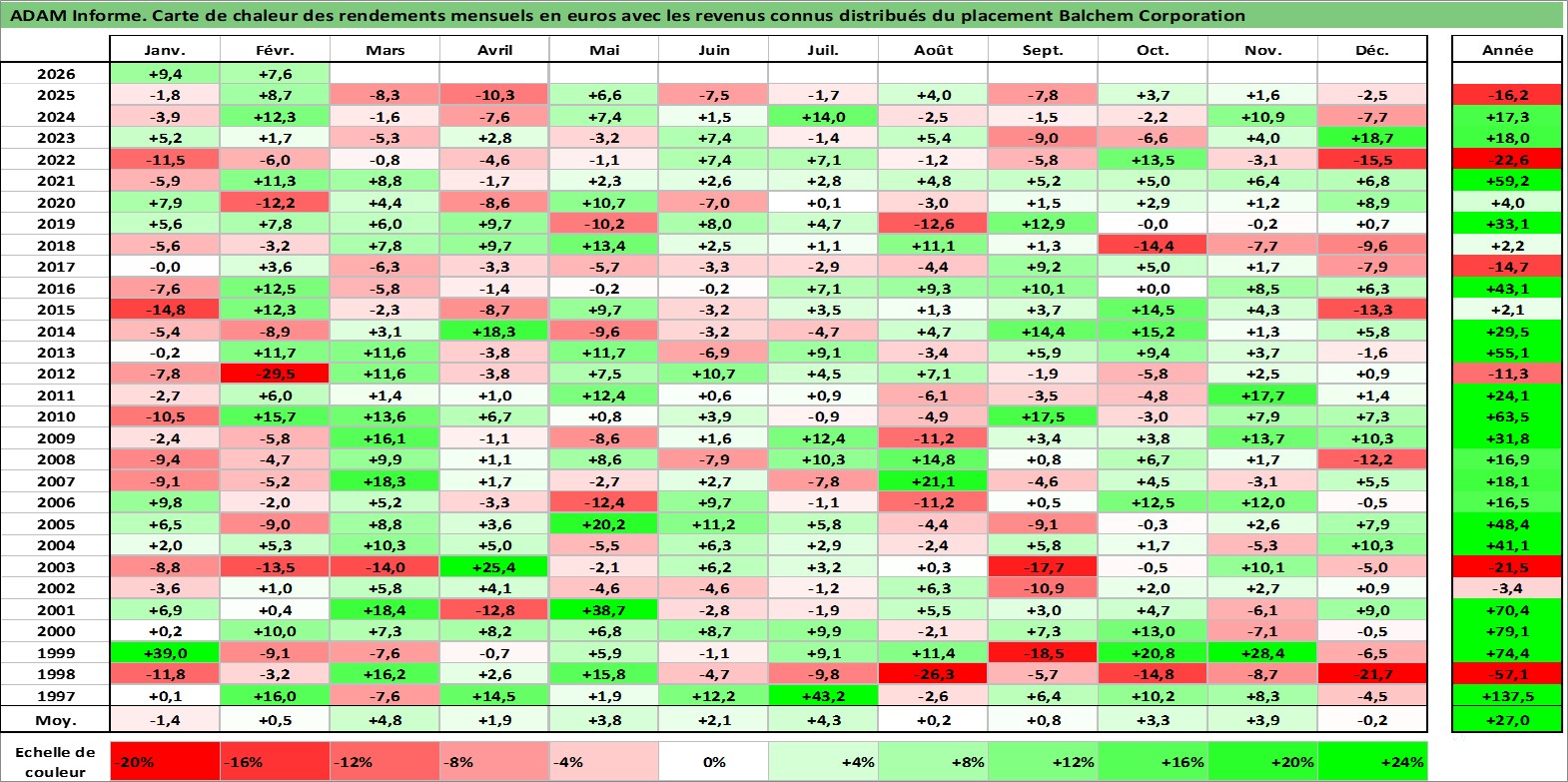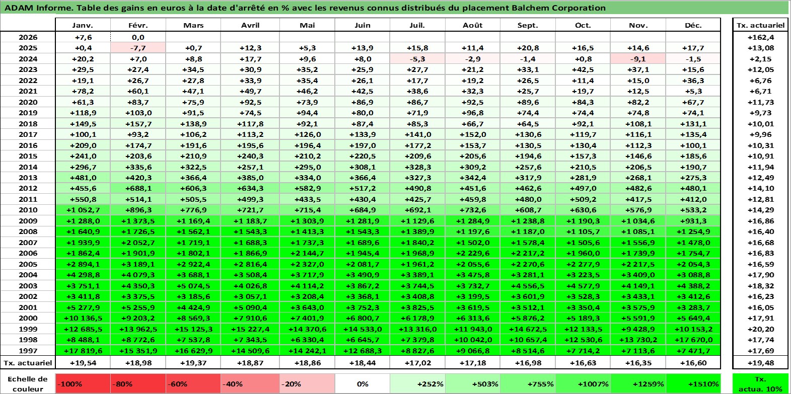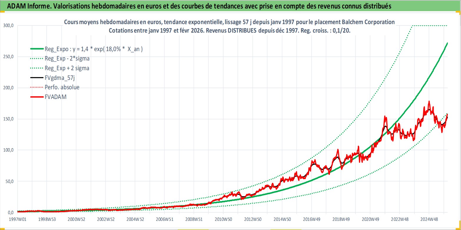 Site dédié aux investisseursPage dédiée sur site financeAnalyse des valorisations hebdomadaires de l'action Balchem Corporation. Cet actif est cote en USD. Les valorisations sont en contrevaleur EURO et couvrent les semaines 1997W01 a 2026W09. Les revenus de cet actif financier sont pris en compte depuis la semaine 1997W52. La note ESG de cet actif n'est pas connue.