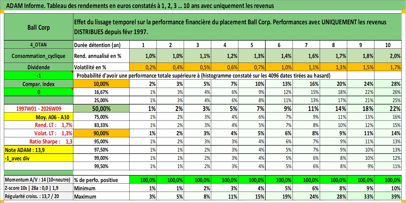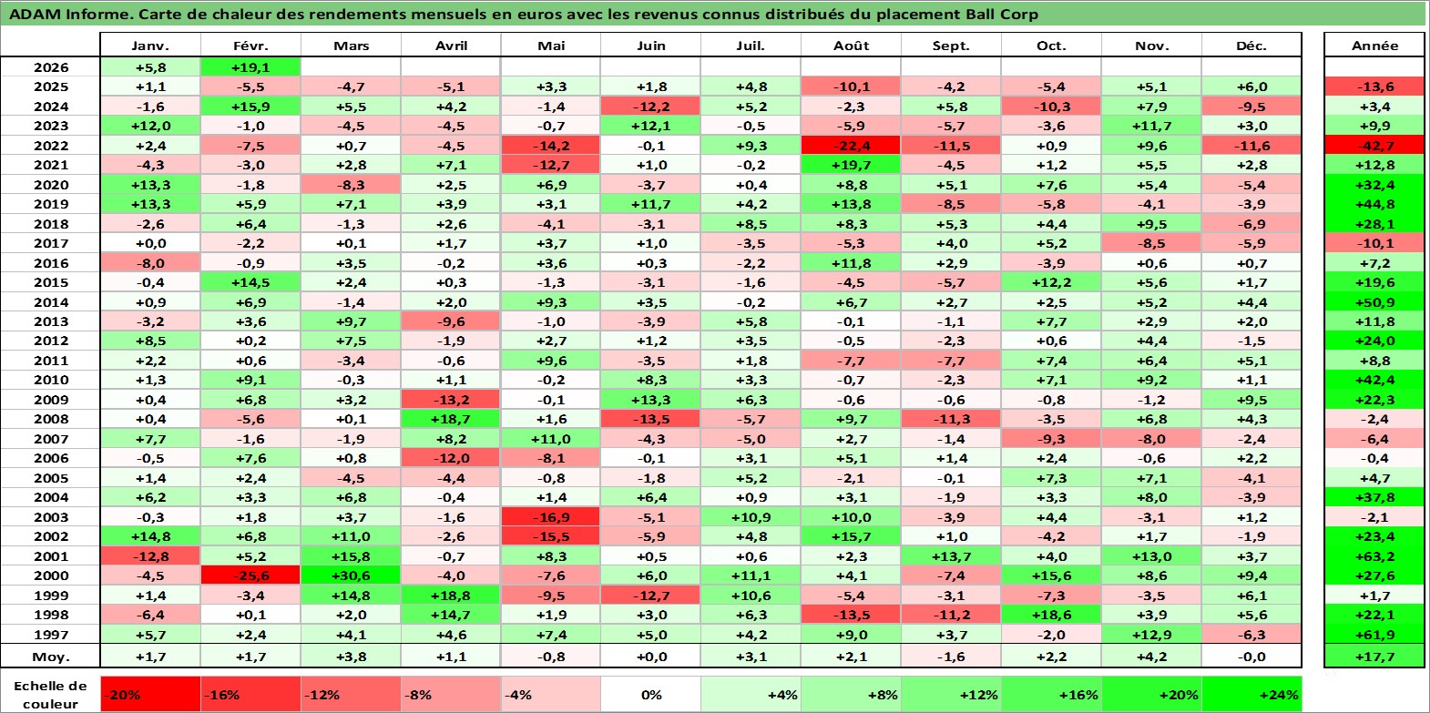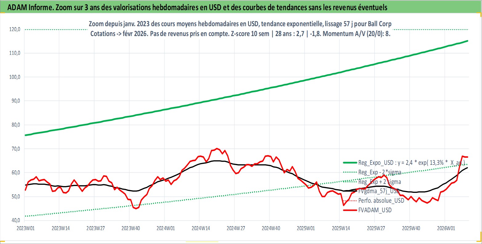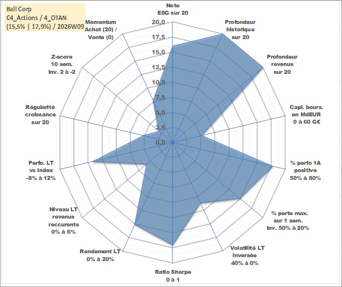 Site dédié aux investisseursPage dédiée sur site financeAnalyse des valorisations hebdomadaires de l'action Ball Corp. Cet actif est cote en USD. Les valorisations sont en contrevaleur EURO et couvrent les semaines 1997W01 a 2026W09. Les revenus de cet actif financier sont pris en compte depuis la semaine 1997W09. La note globale ESG de cet actif est estimee a 16.0 (apres rebasage entre 0 et 20).
