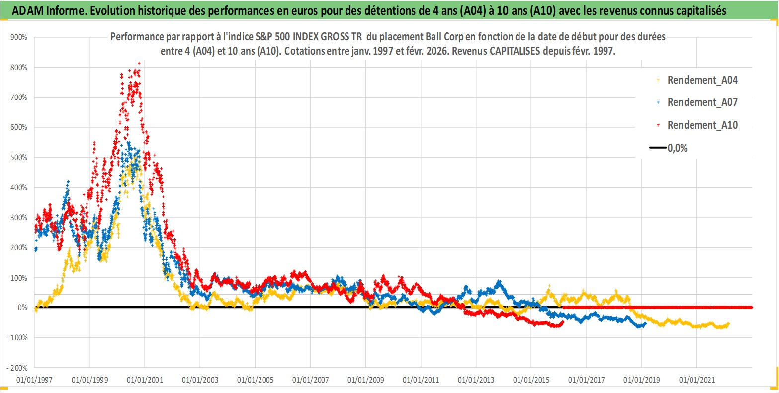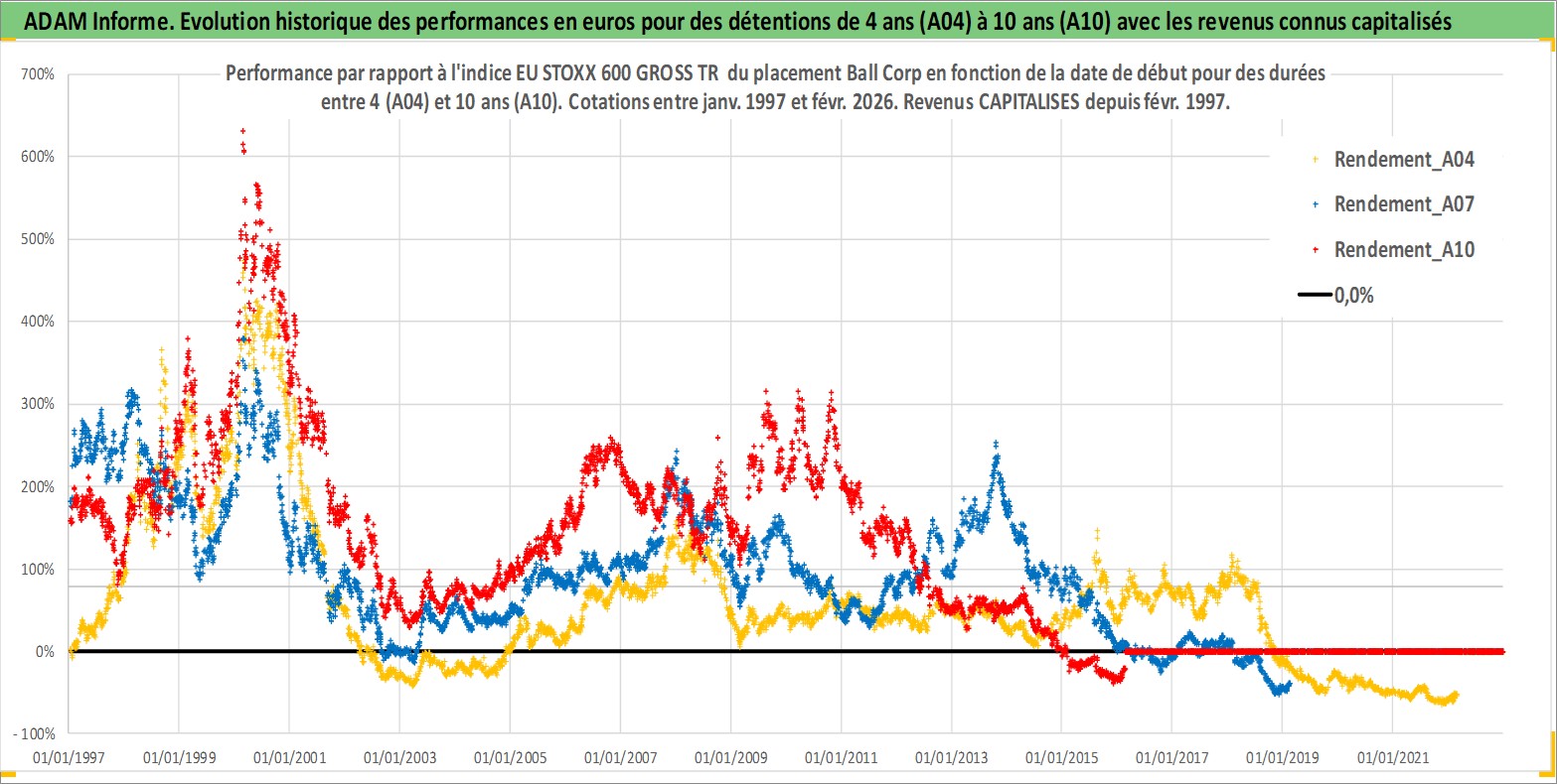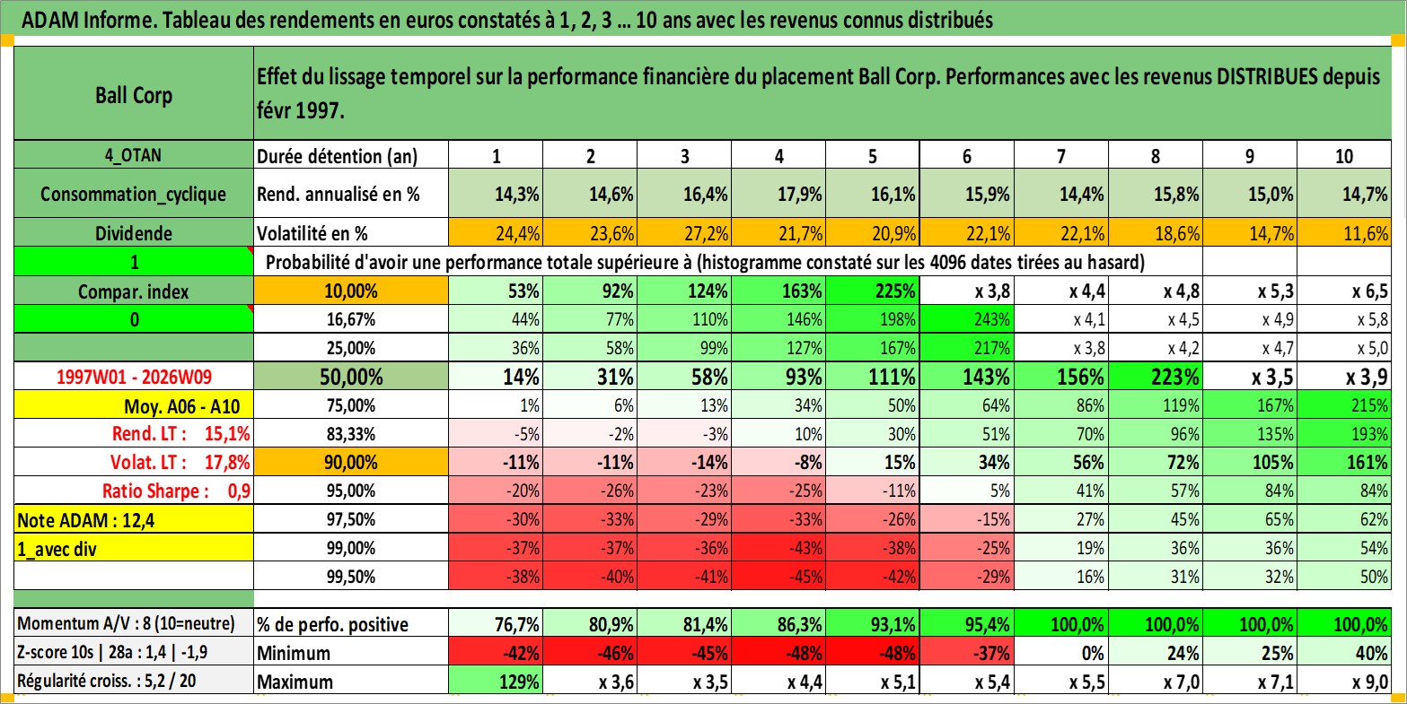 Site dédié aux investisseursPage dédiée sur site financeAnalyse des valorisations hebdomadaires de l'action Ball Corp. Cet actif est cote en USD. Les valorisations sont en contrevaleur EURO et couvrent les semaines 1997W01 a 2026W09. Les revenus de cet actif financier sont pris en compte depuis la semaine 1997W09. La note globale ESG de cet actif est estimee a 16.0 (apres rebasage entre 0 et 20).